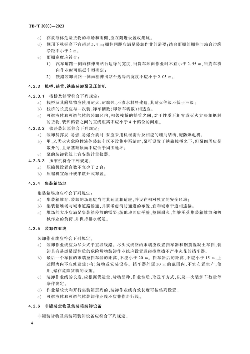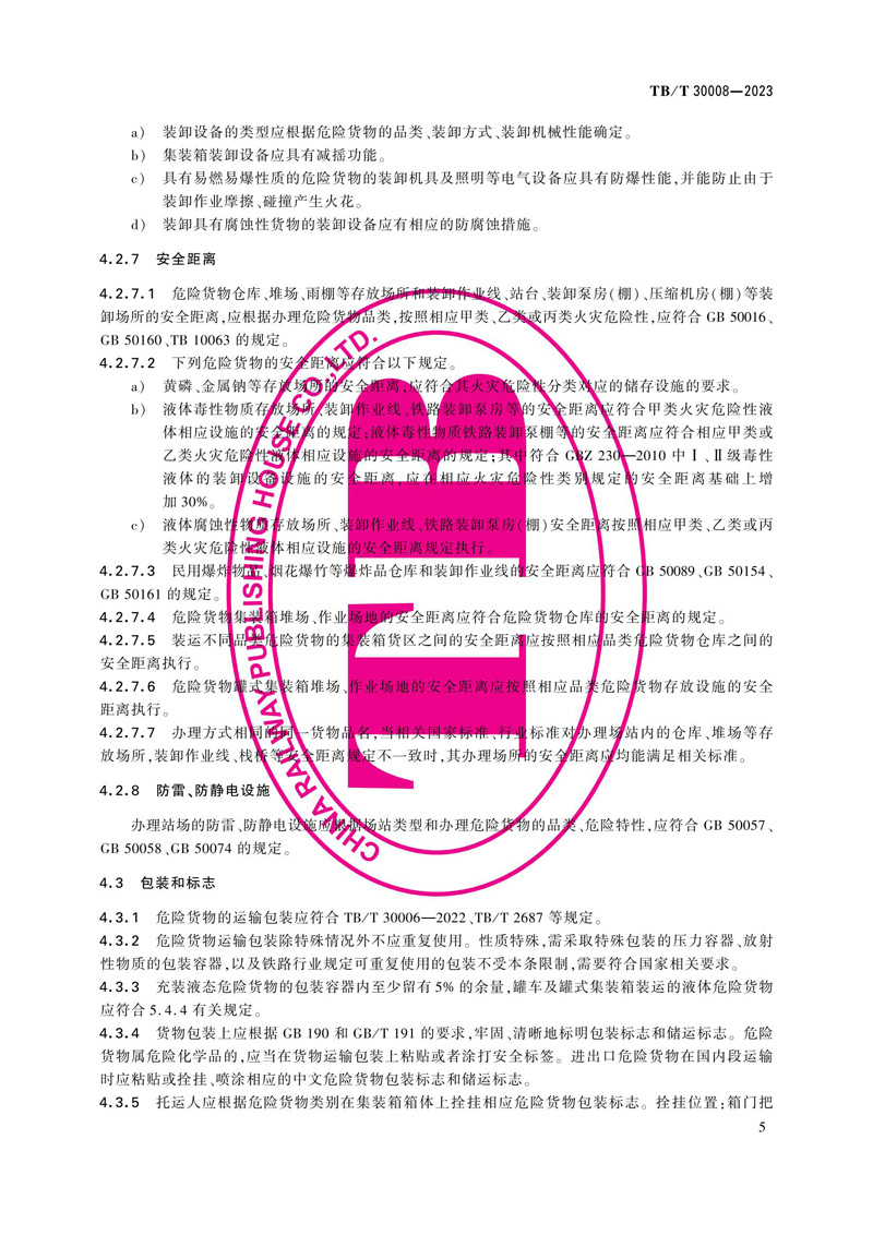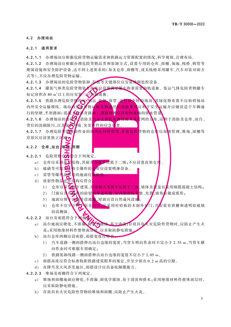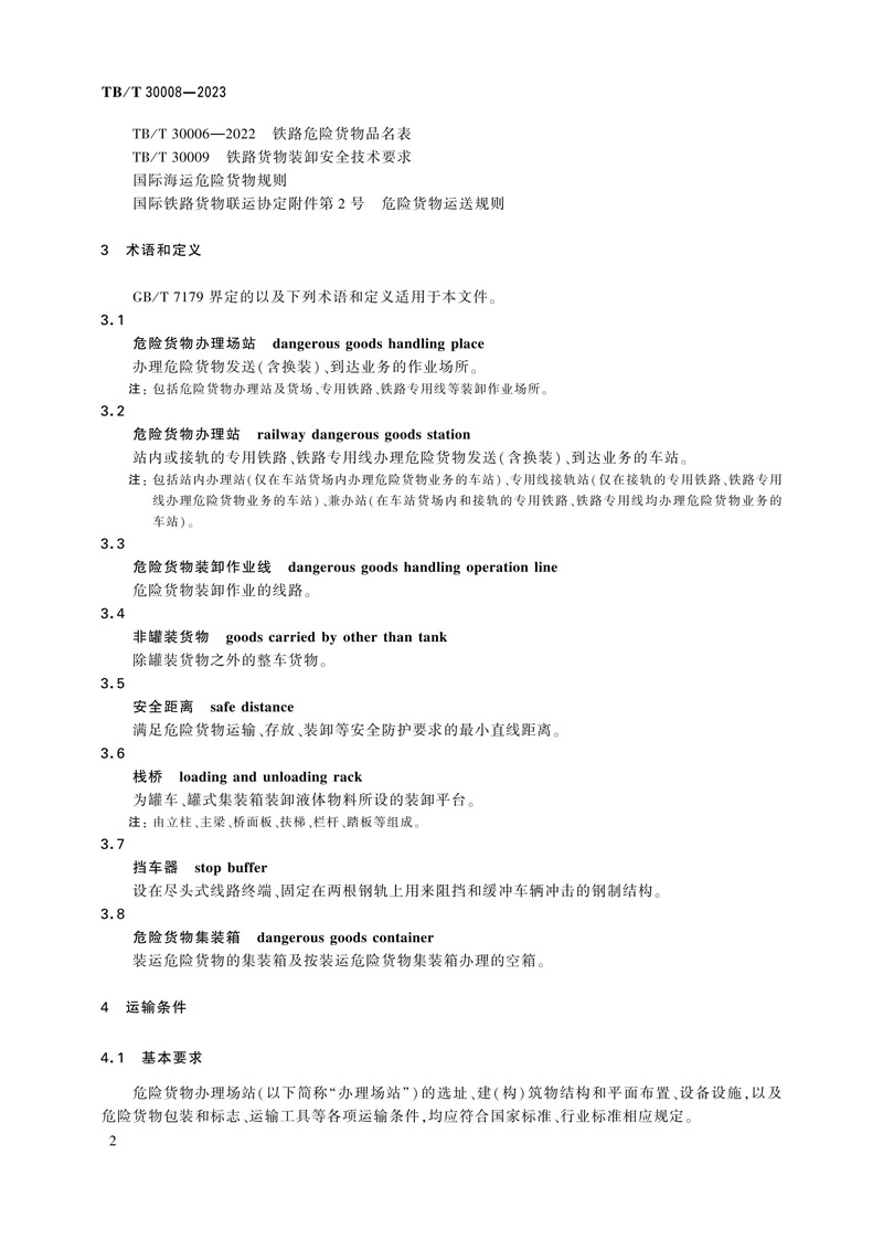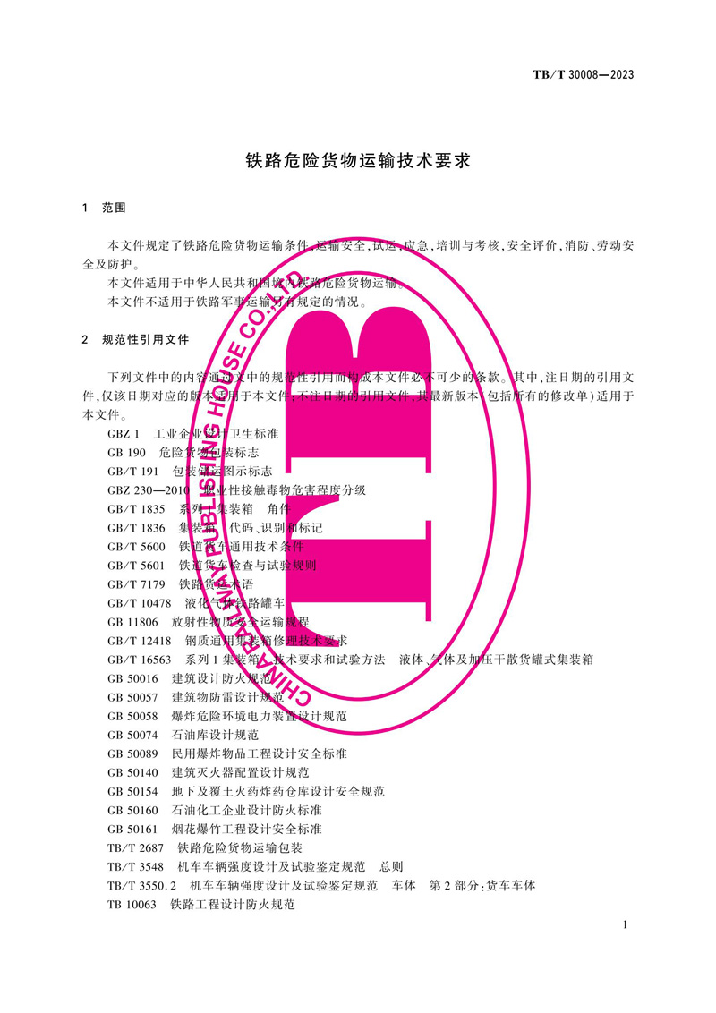 本标准为国家铁路局发布的铁道行业标准,技术标准2023年第3批(共7项标准)。本标准规定了铁路危险货物运输条件、运输安全、试运、应急、培训与考核、安全评价、消防、劳动安全及防护等,并附有危险货物类项名称戳记表、易燃普通货物品名表、铁路液化气体罐车充装记录、铁路车辆编组隔离表、铁路危险货物配放表、铁路车辆禁止溜放和限速连挂表、铁路危险货物运输技术说明书、改变运输包装申请表