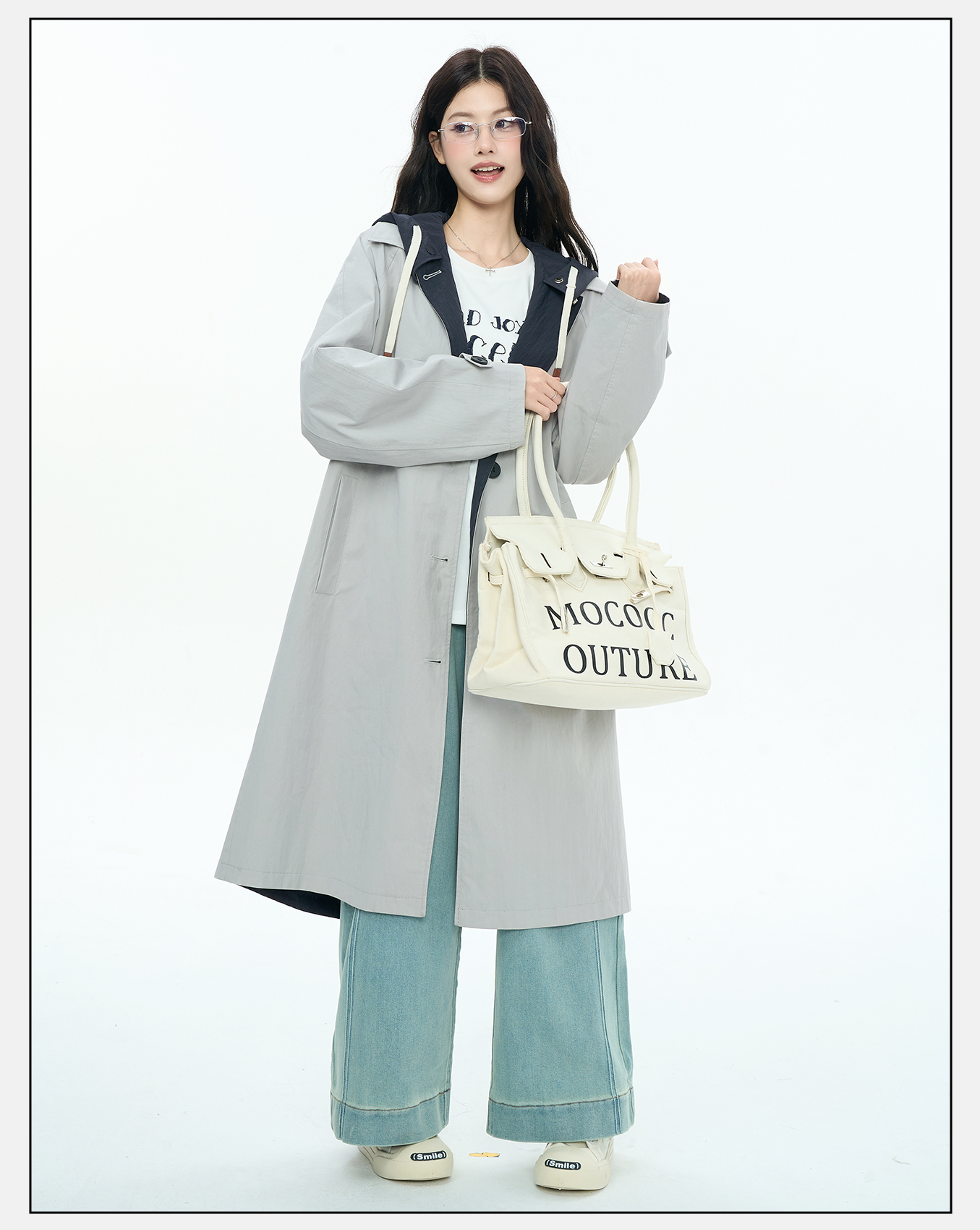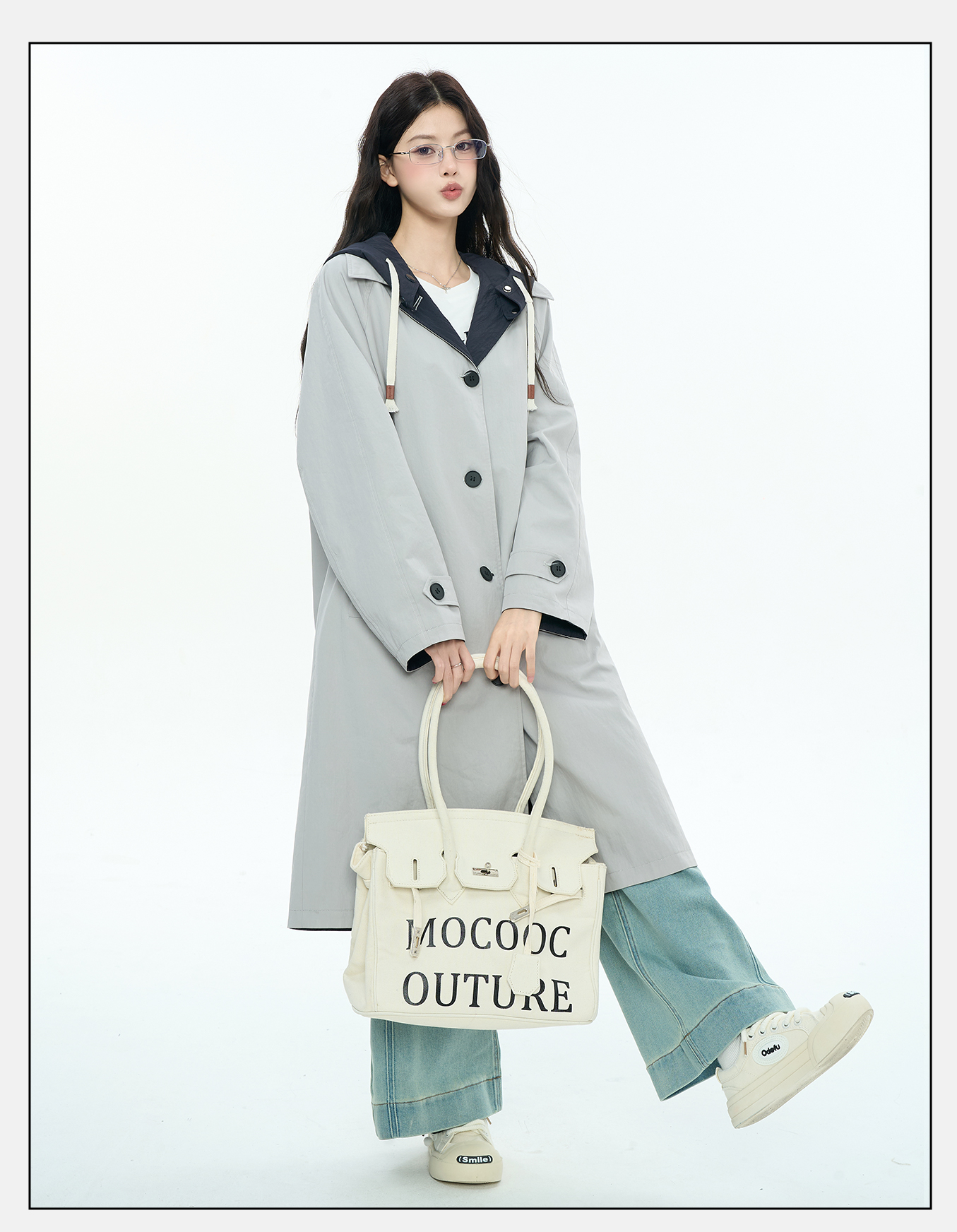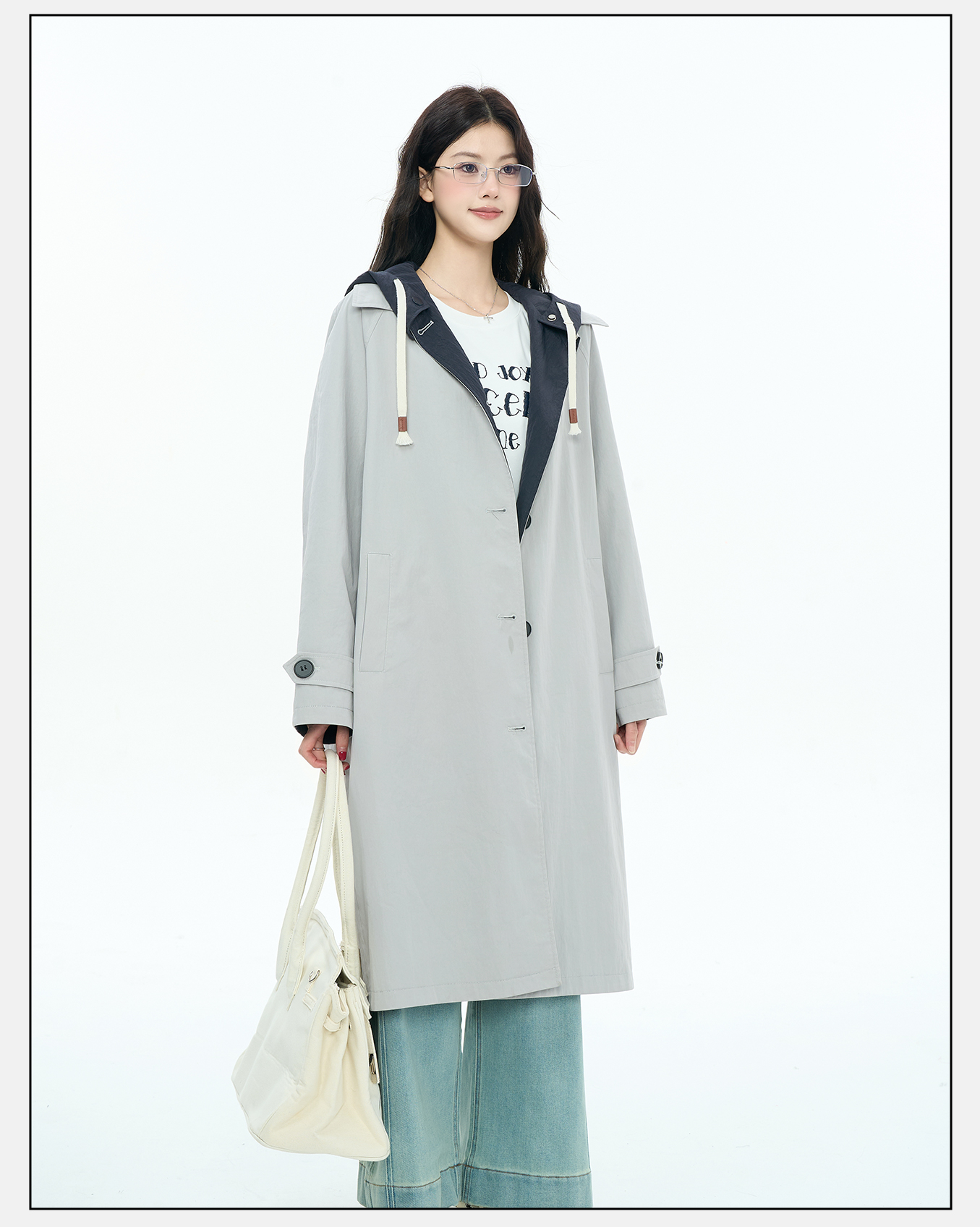 P&X设计师女装2025秋季休闲风潮流连帽长款风衣825319181 浅灰