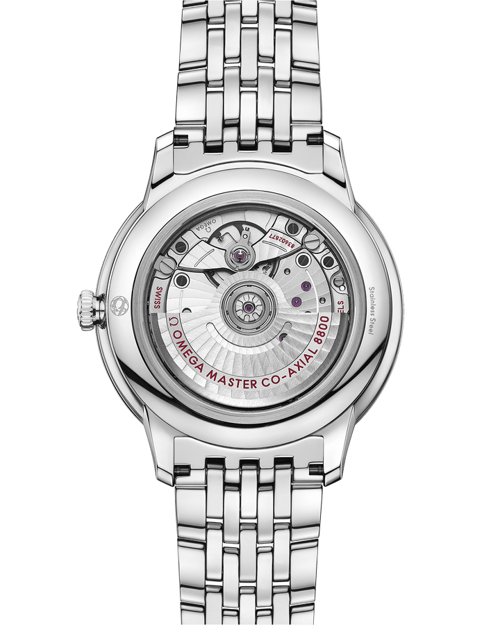 腕表通过至臻天文台认证,搭配精钢表链,内部搭载欧米茄8800至臻天文台机芯,透过耐磨损蓝宝石玻璃表背,机芯的运转美态清晰可见。
