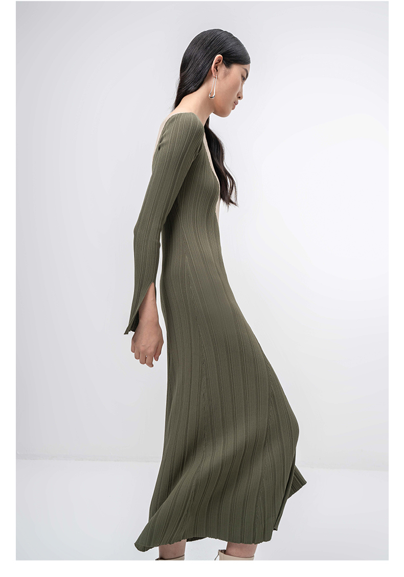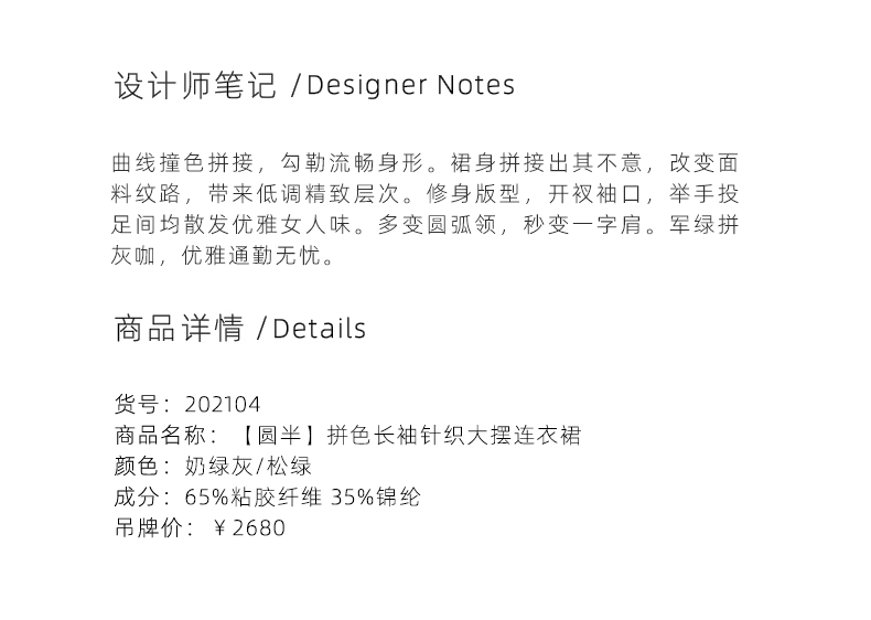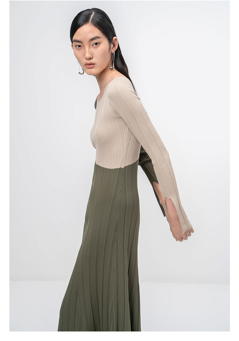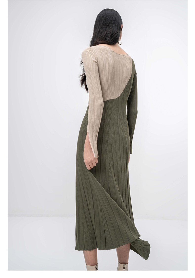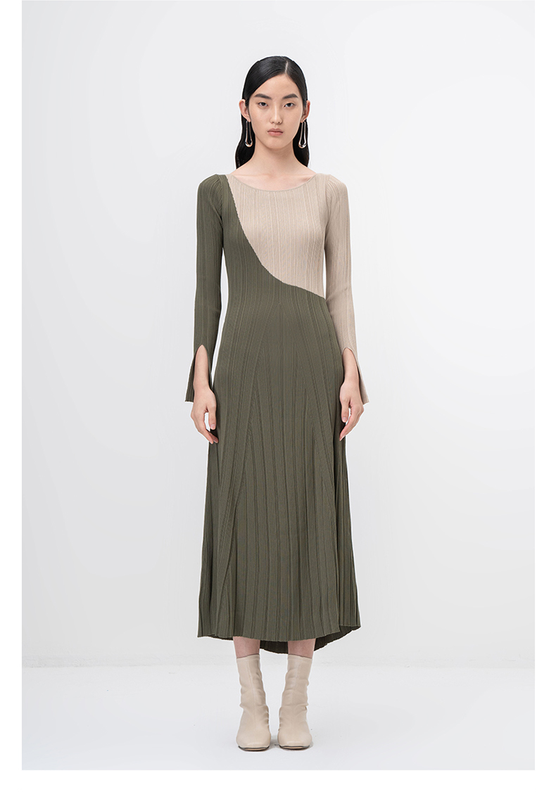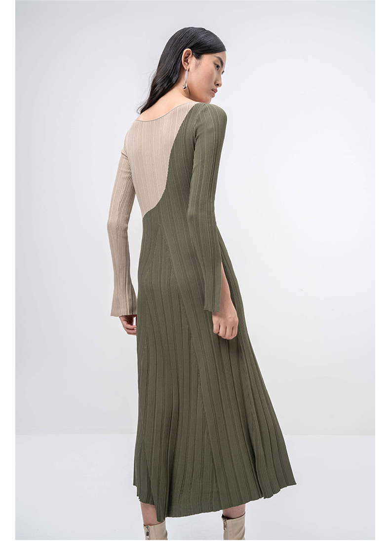 【圆半】流畅曲线松绿拼色长袖针织大摆连衣裙/202104