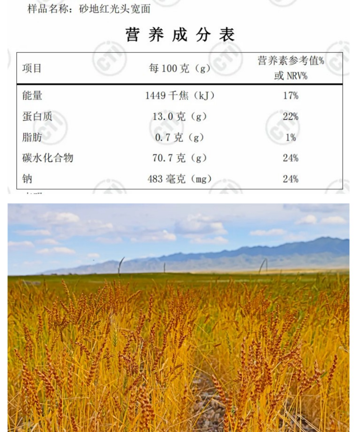 ● 营养丰富砂地红光头小麦面粉是一种高蛋白、高筋度、营养丰富、风味十足的天然优质小麦。