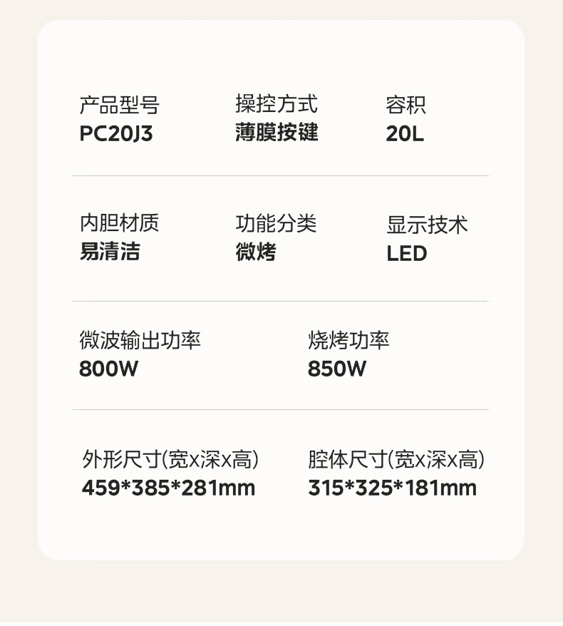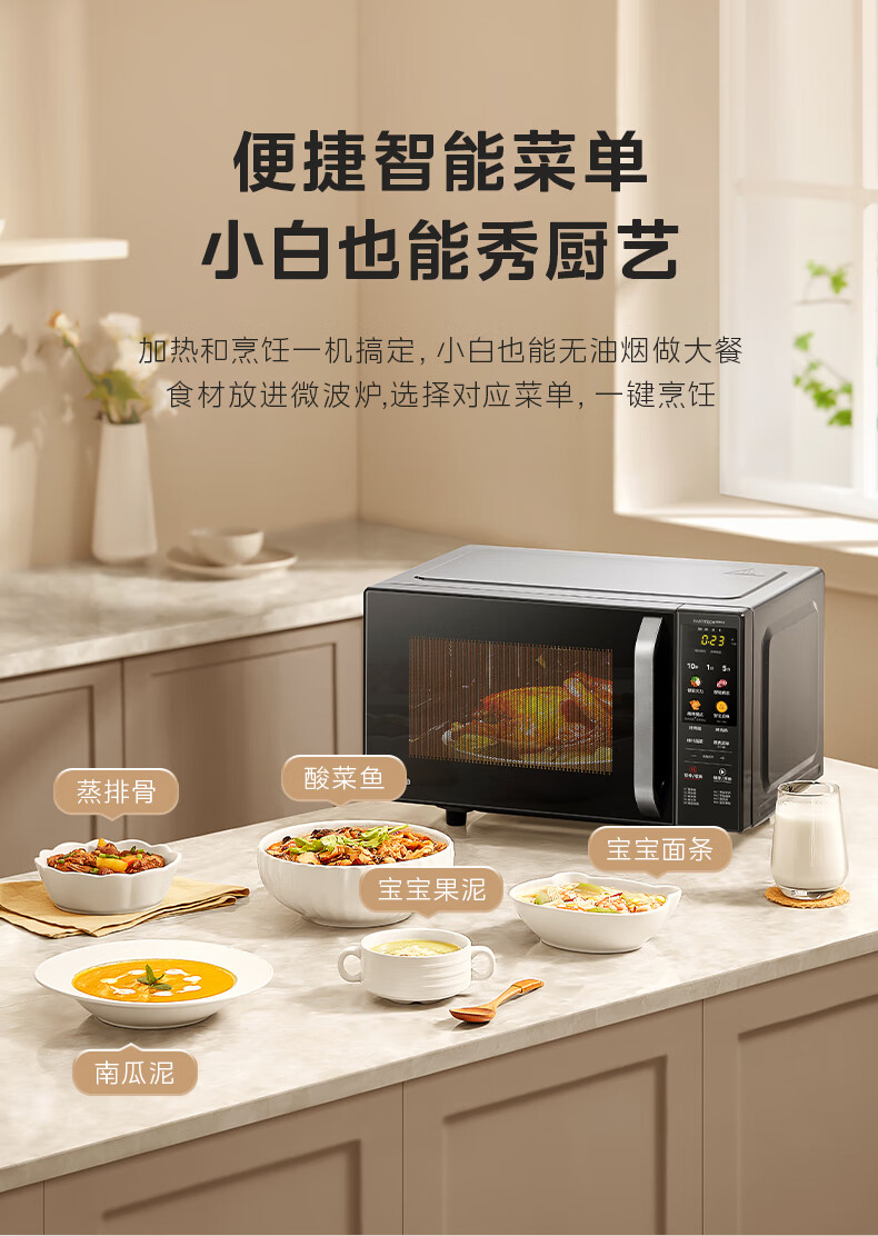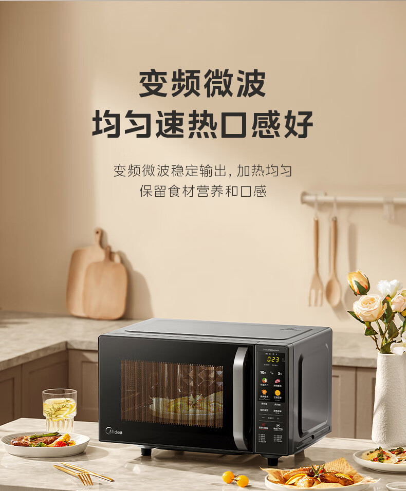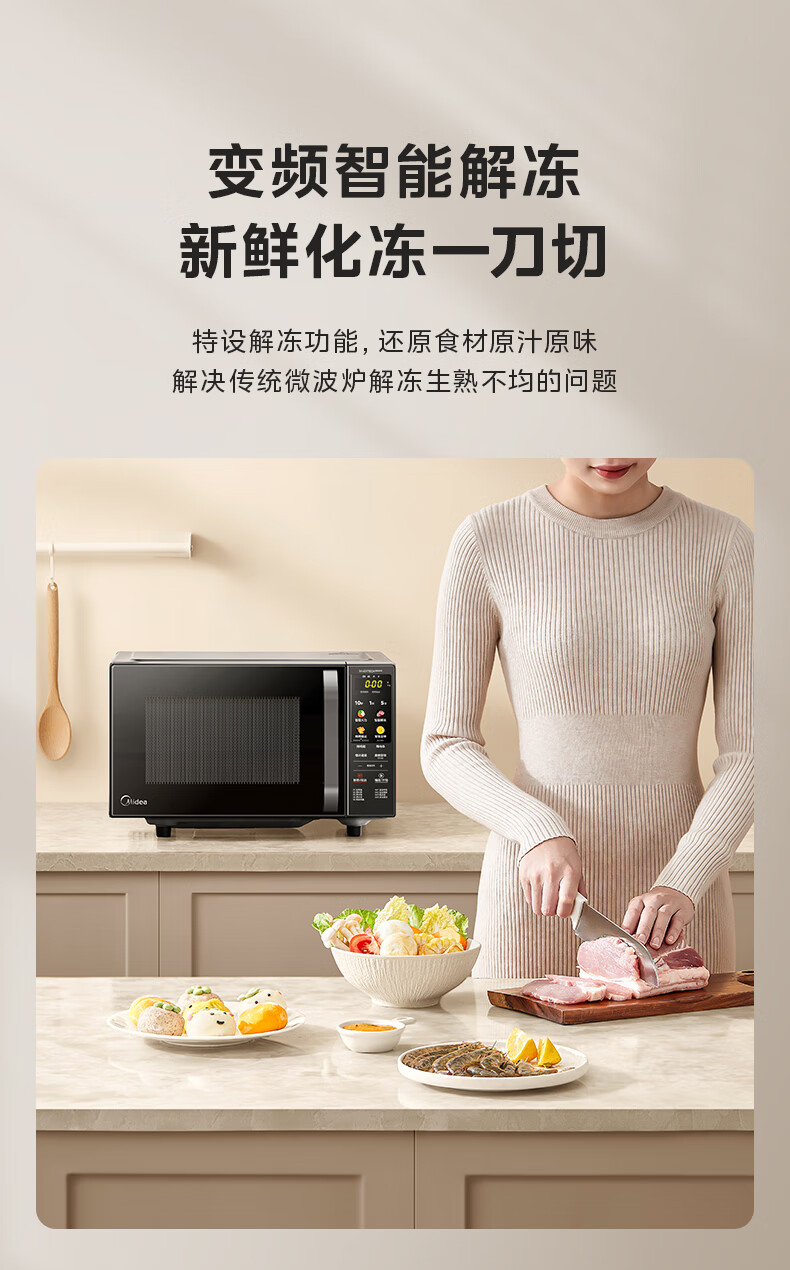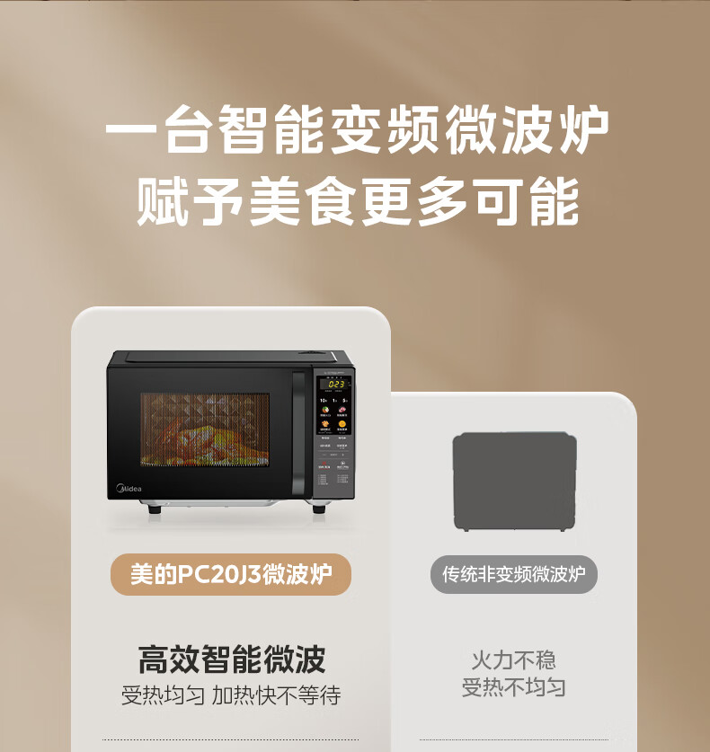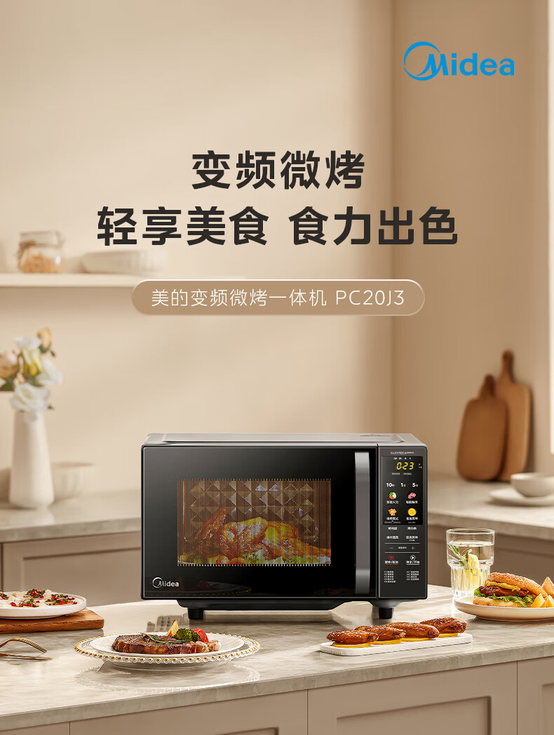 美的 20L容量变频微波炉 快速解冻 多道自动菜单 800w速热 四挡火力 智能解冻 平滑大平板 一键微波杀菌 PC20J3