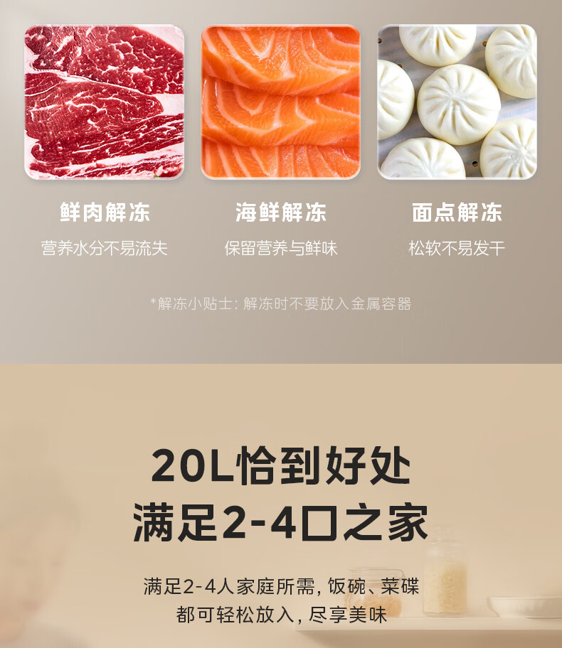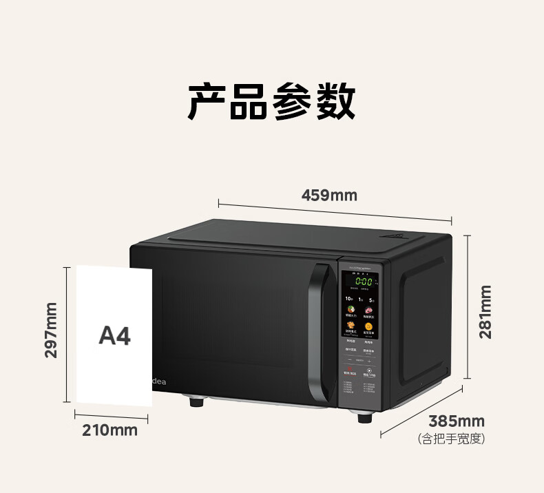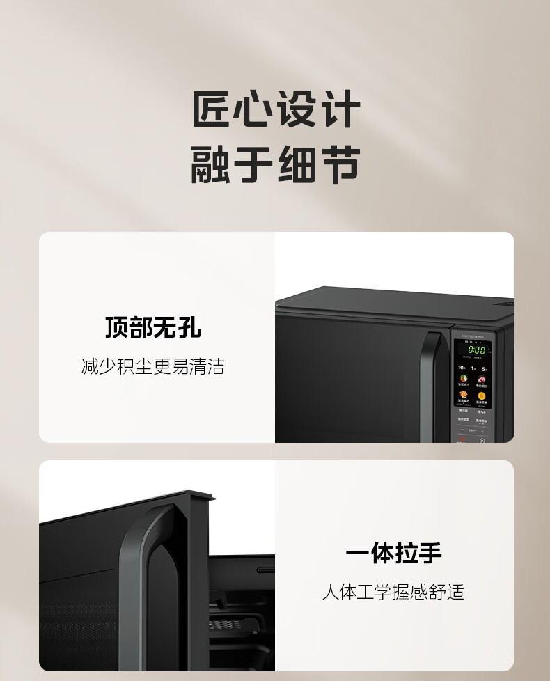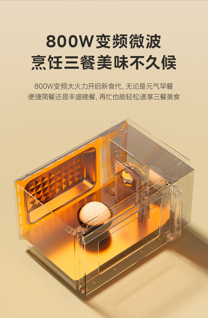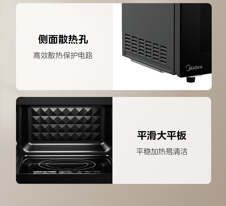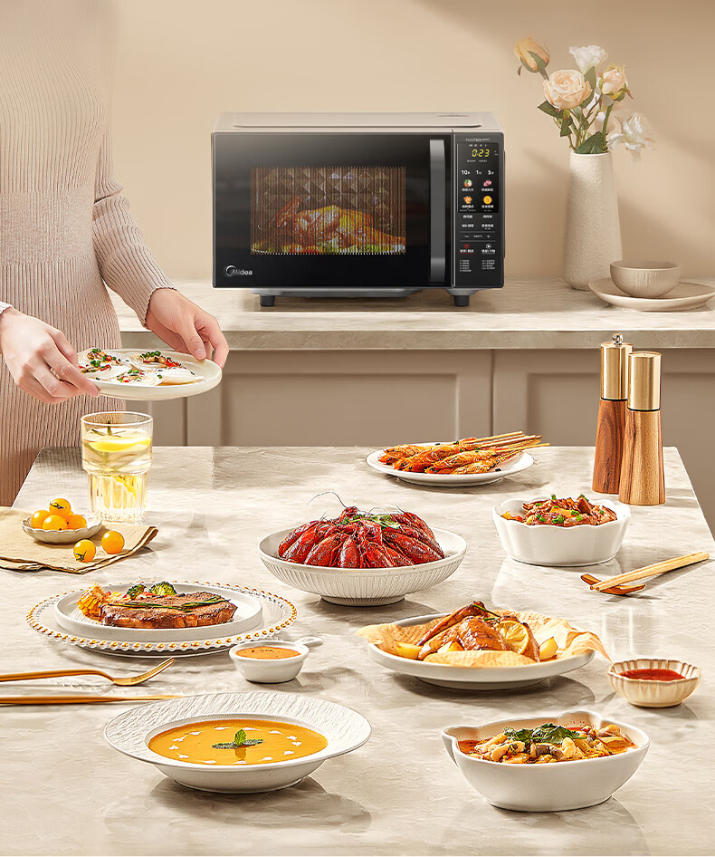 美的 20L容量变频微波炉 快速解冻 多道自动菜单 800w速热 四挡火力 智能解冻 平滑大平板 一键微波杀菌 PC20J3