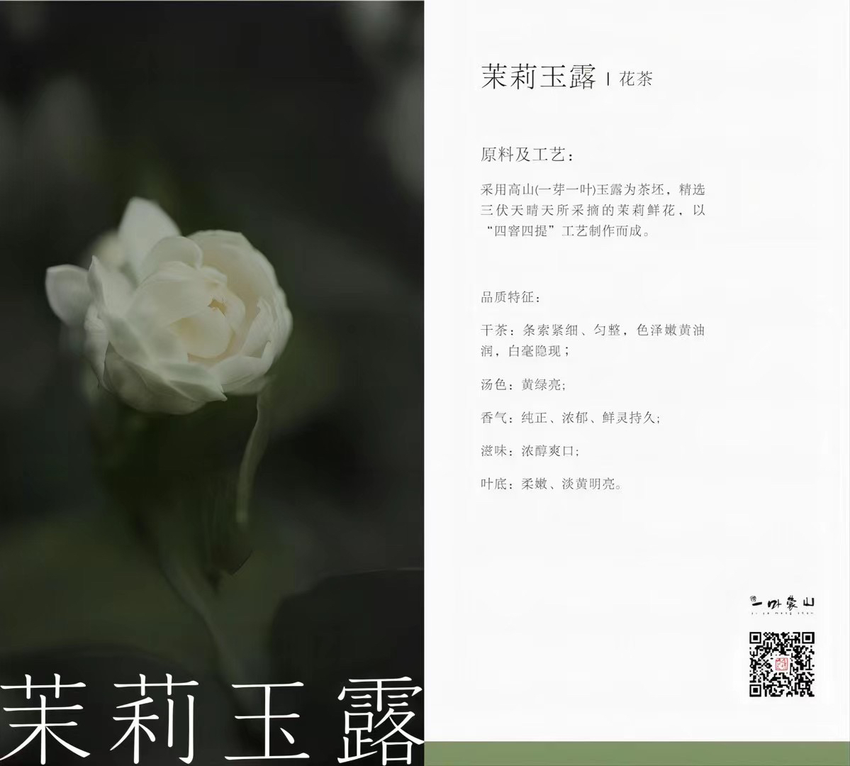 采用高山(一芽一叶)玉露为茶坯,精选三伏天腊天所采摘的莱莉鲜花,以〝四窖四握〞工艺制作而成。