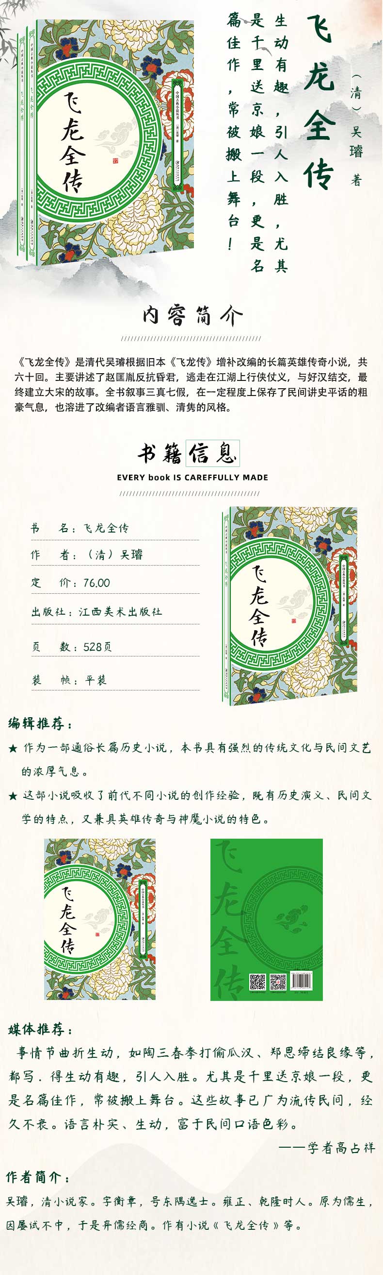 《飞龙全传》是清代吴璿根据旧本《飞龙传》增补改编的长篇英雄传奇小说,共六十回。主要讲述了赵匡胤反抗昏君,逃走在江湖上行侠仗义,与好汉结交,最终建立大宋的故事。全书叙事三真七假,在一定程度上保存了民间讲史平话的粗豪气息,也溶进了改编者语言雅驯、清隽的风格。