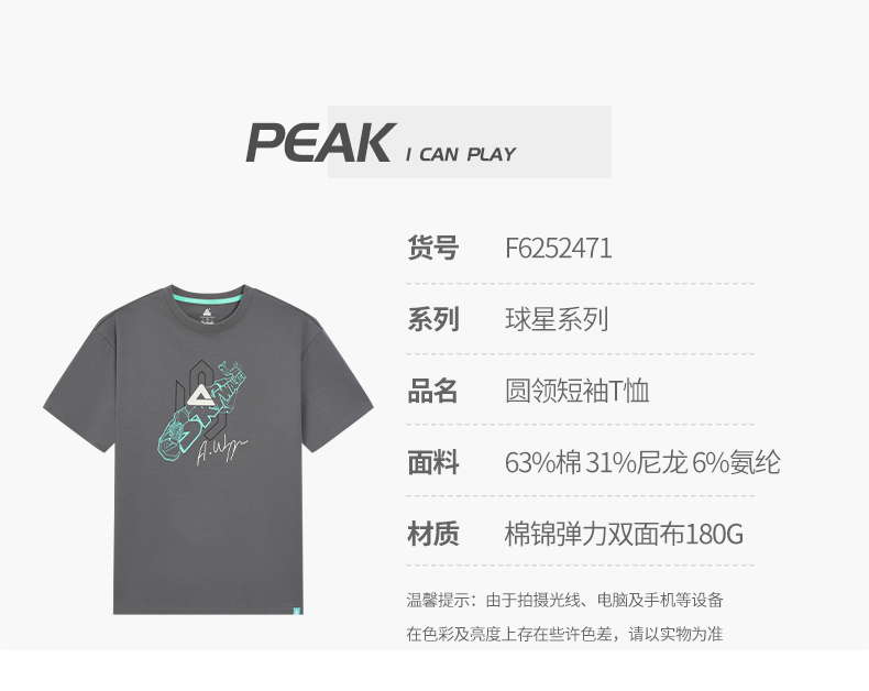 匹克2025年新款球星系列男款圆领短袖T恤F6252471