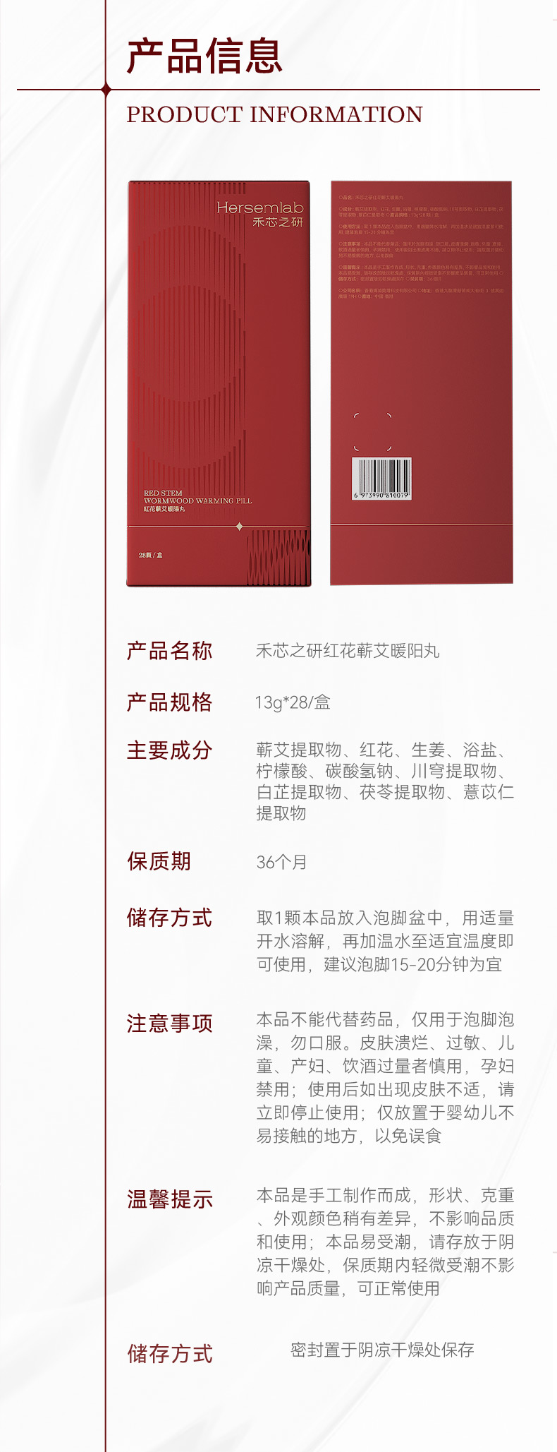 Hersemlab禾芯之研红花蕲艾暖阳丸藏红花精油泡脚丸 28颗/盒