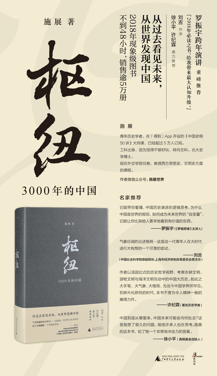 作者施展,外交学院世界政治研究中心主任。「得到」App大师课《中国史纲50讲》的主理人。《枢纽》是对这门已经有超过5万人学习的课程的思想更加系统的阐述。