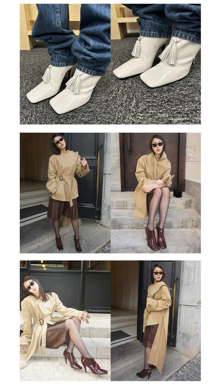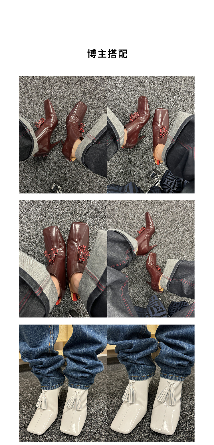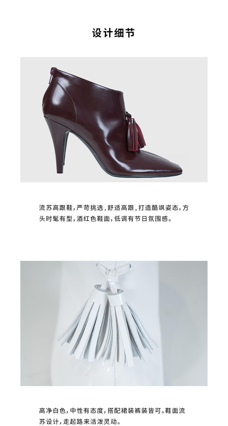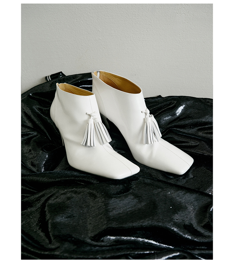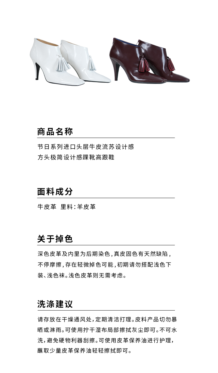 HIDEMI 节日系列进口头层牛皮流苏设计感方头极简设计感踝靴高跟鞋 白色/勃艮第红