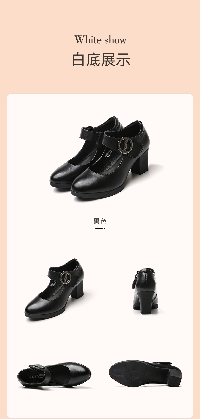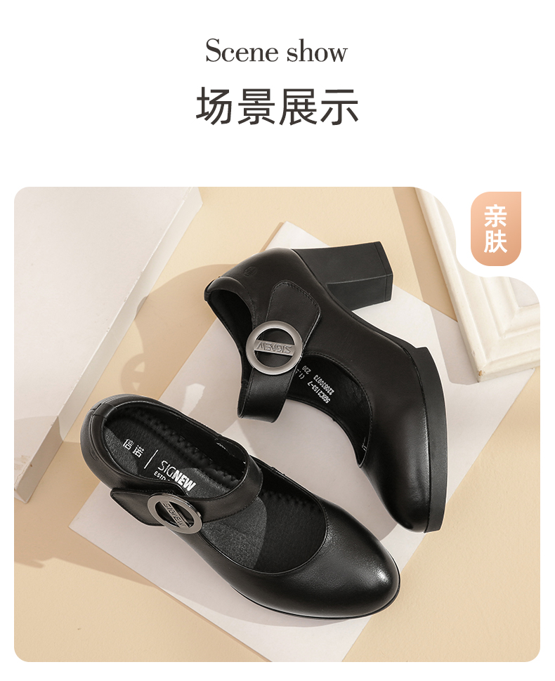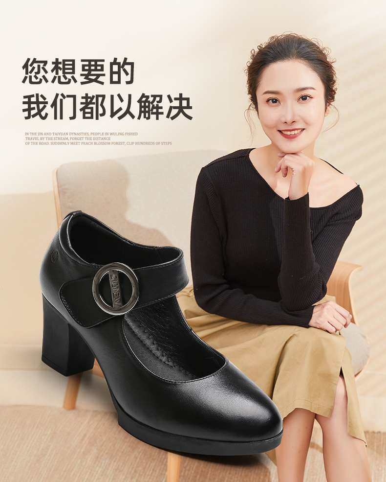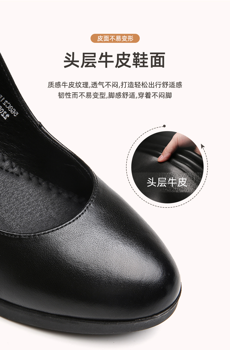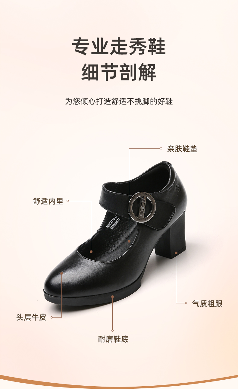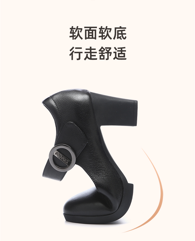 真皮走秀高跟鞋头层牛皮女鞋单鞋软底旗袍粗跟春秋季通勤妈妈皮鞋5C3153-7