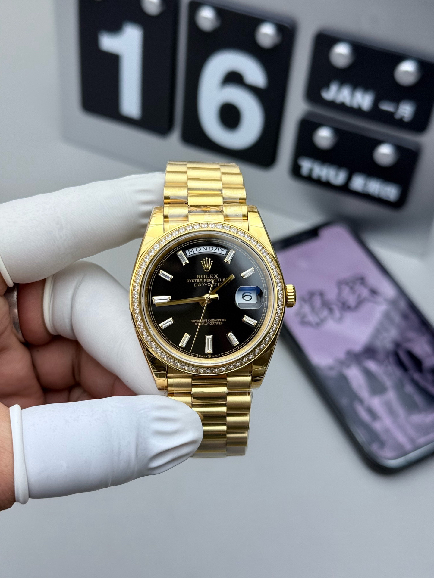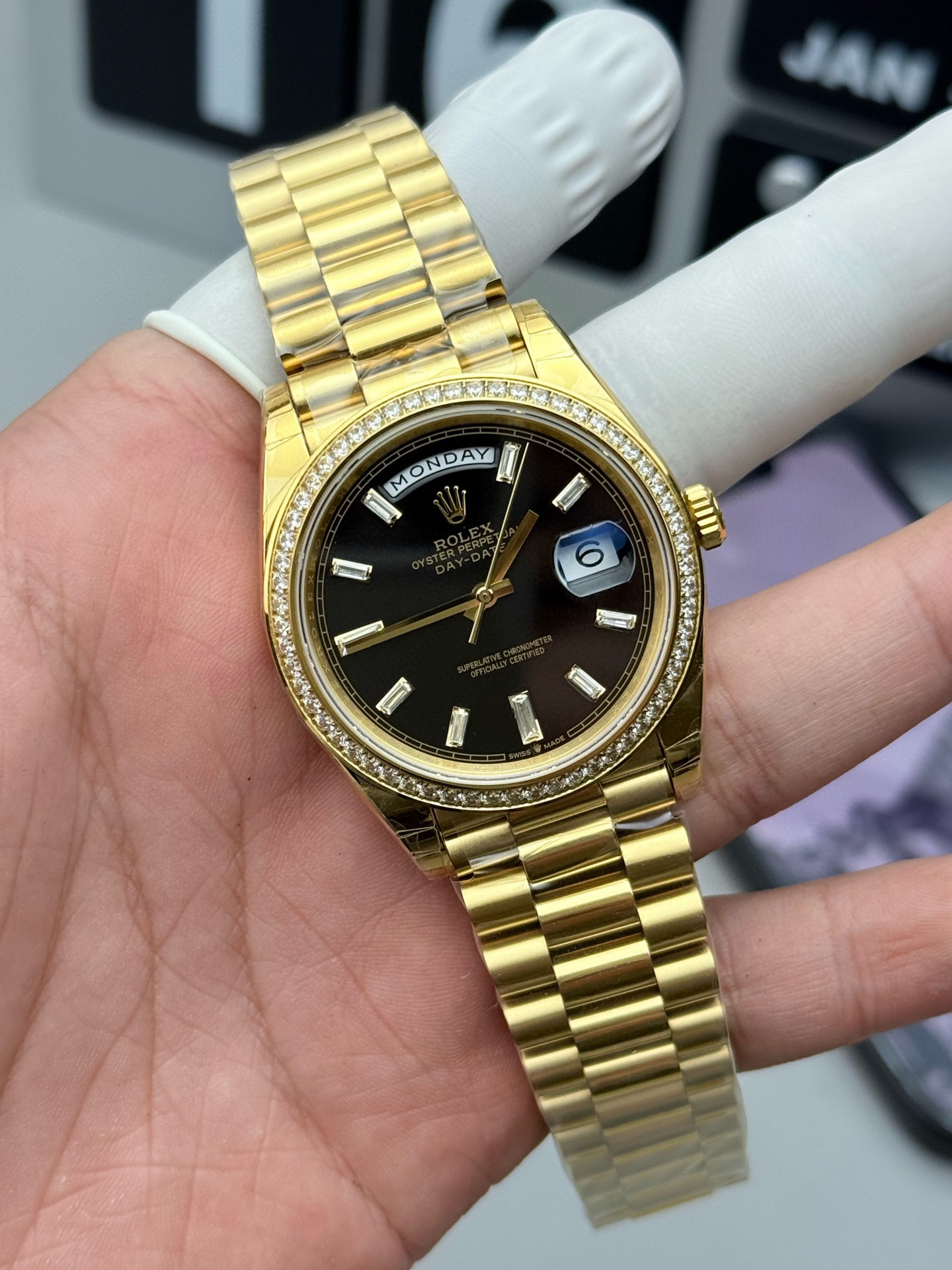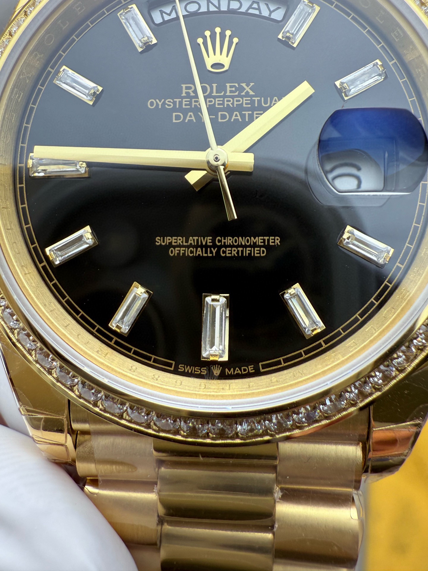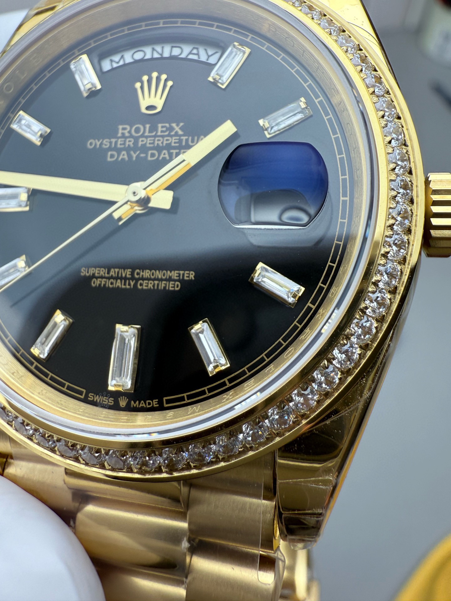 (黑冰糖圈口手工镶嵌钻石)NOOB Factory新力作V2升级版 劳力士Rolex星期日志型40mm 搭载原版3255自动机械机芯228239系列腕表,40毫米直径,研发耗时16个月!原版1比1开模