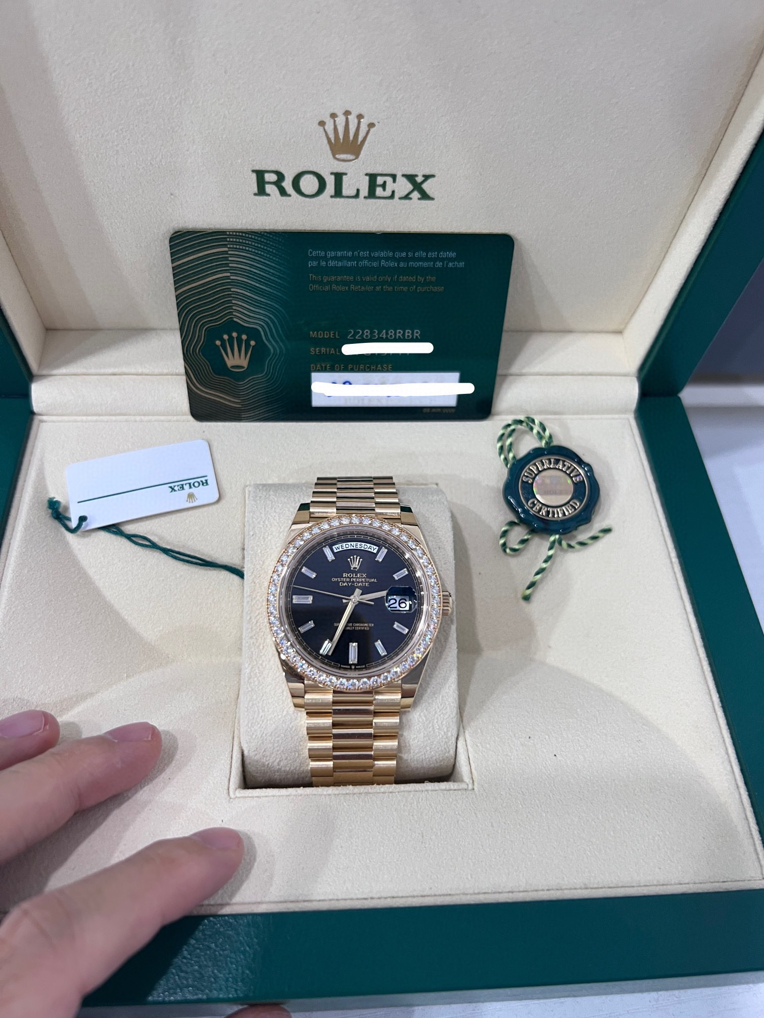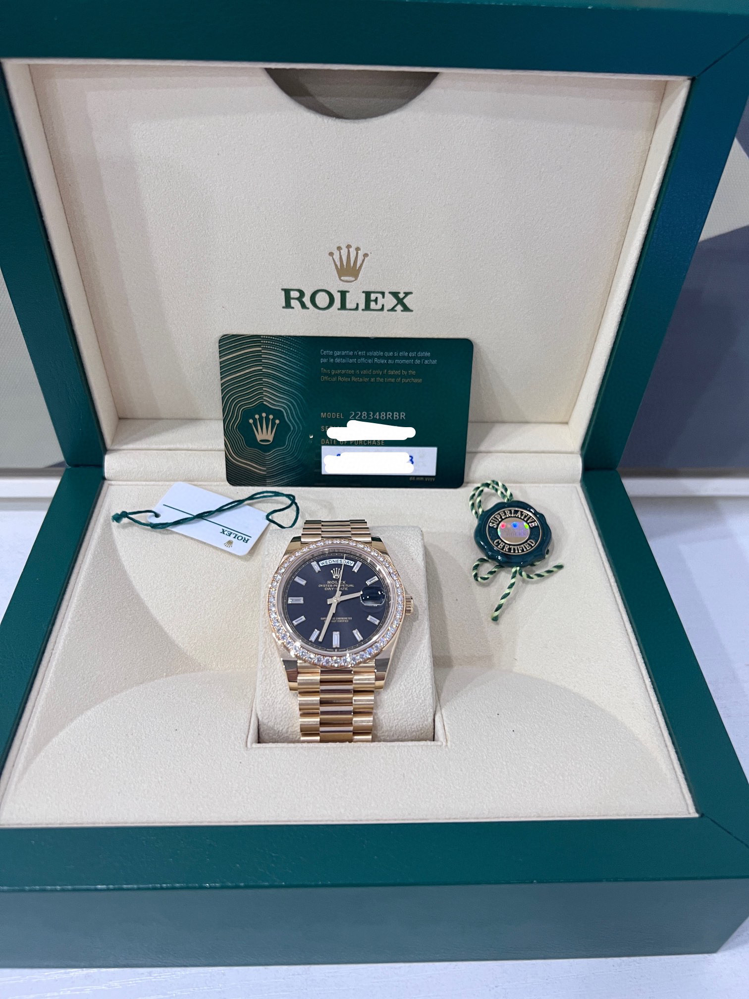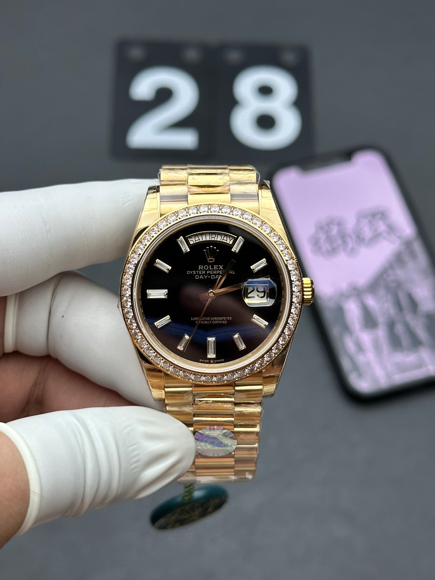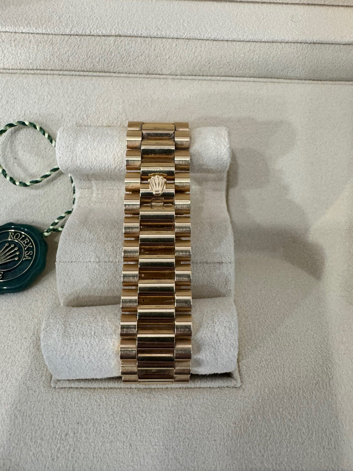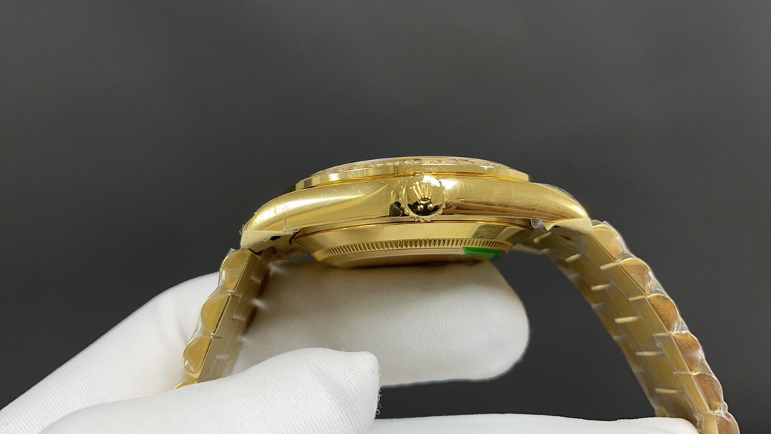 NOOB Factory新力作V2升级版 劳力士Rolex星期日志型40mm 搭载原版3255自动机械机芯228239系列腕表,40毫米直径,研发耗时16个月!原版1比1开模。重点升级了以下几个要点:1.表壳直径与2019最新版3255型系列一致40毫米。2.表带头粒与原装一致,5件拼装,难度非常高,表带与表壳交错型无缝连结。3.把头皇冠处下方修改为与原版一致的两个圆点。4.表扣与原版一致里面加装了弹簧,字体大小工艺和原装一致。5.表壳侧面与原版一致增加二维码防伪、底盖有验货二维码。6.表壳与表带连接处的壳身刻有与原版一致的型号数字228239。7.表的内影圈刻上了与保修卡一致的产品流水数字,而且做到了正品一致的一表一卡一码 绝不重复)8.附全套原版套装配置包括(保修卡,说明书,型号条型码与正品一致)全套包装与正品一致(市面上真正的原装一比一星期日历型)