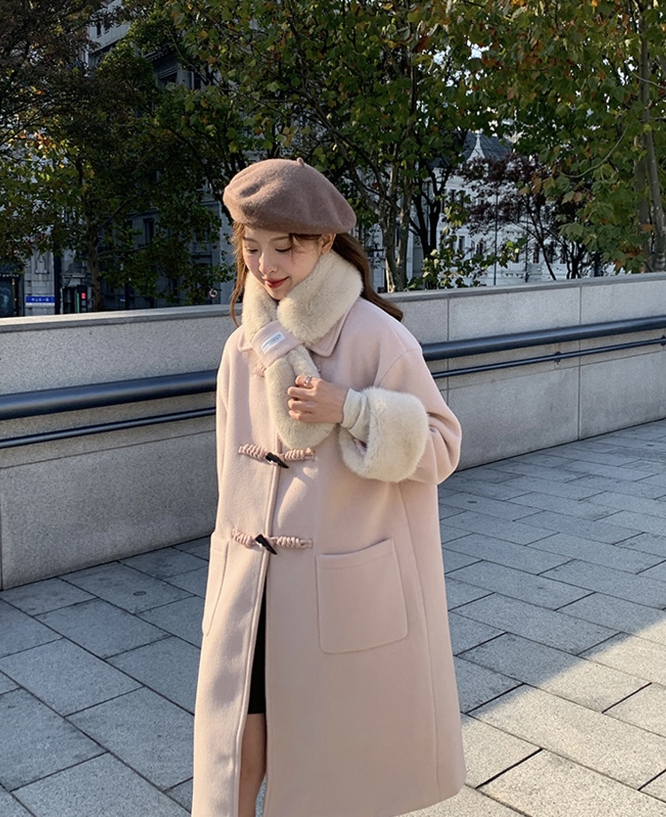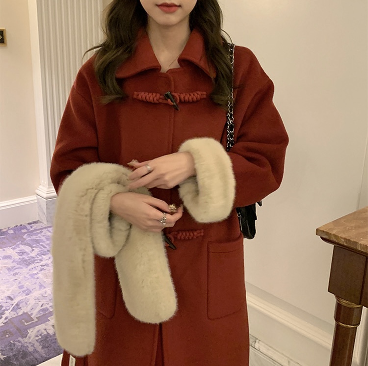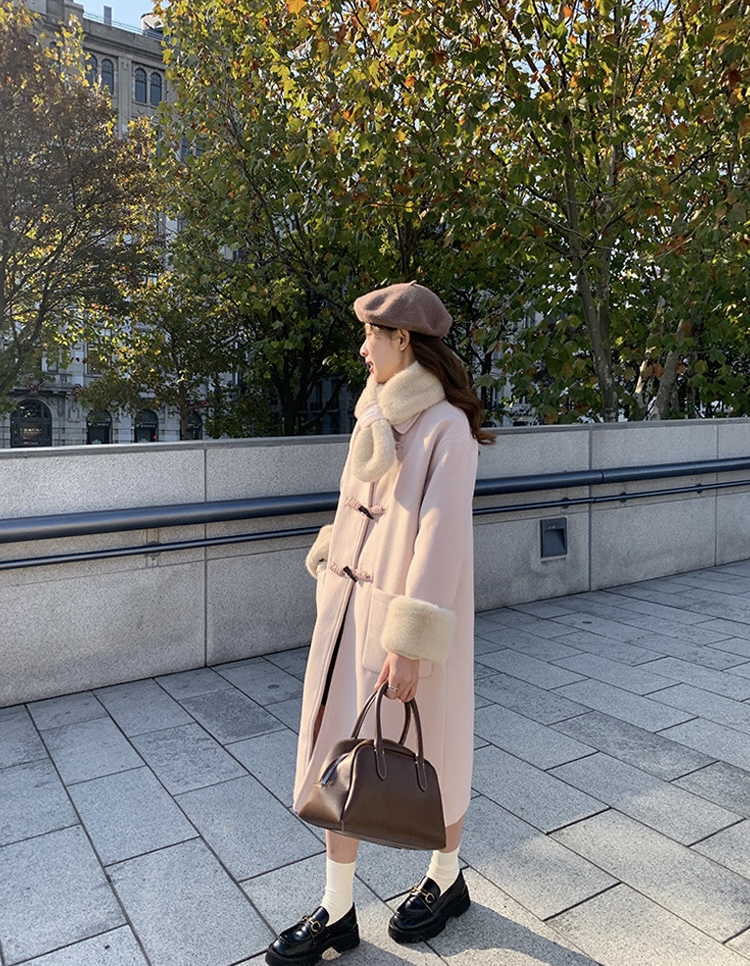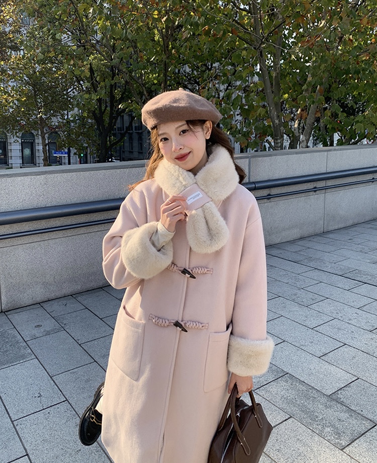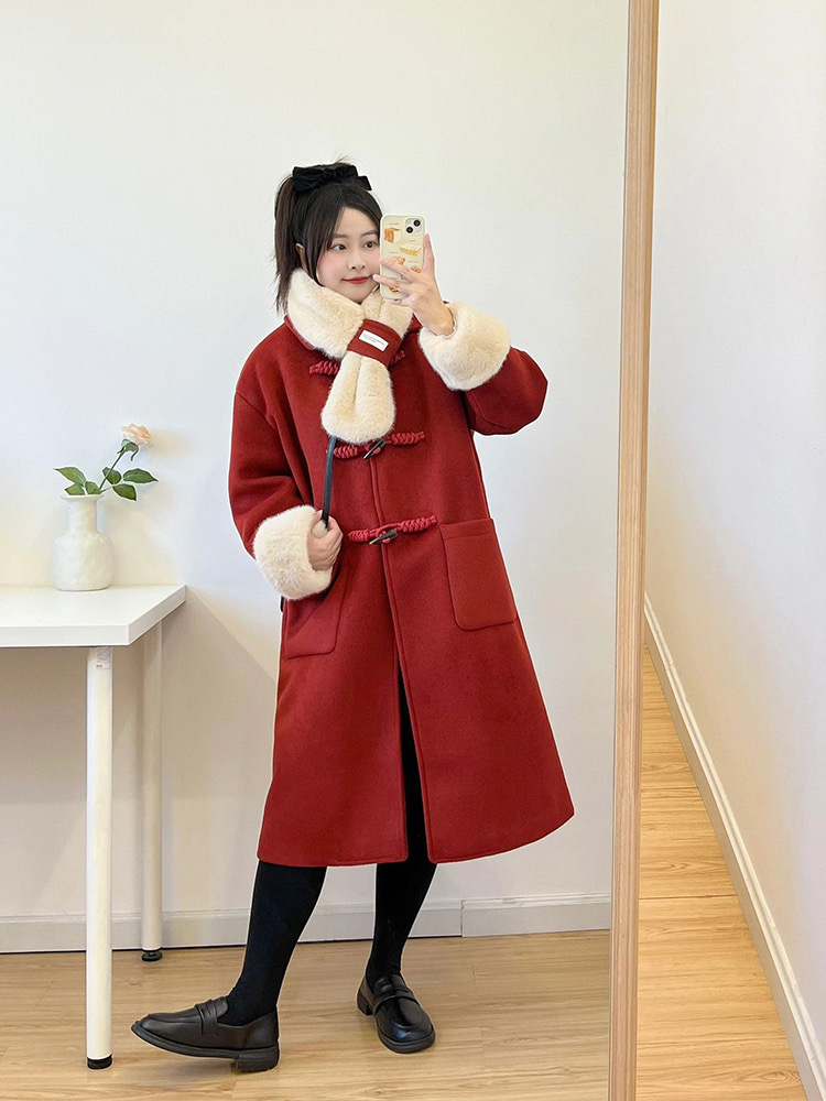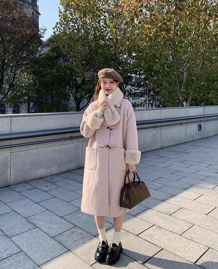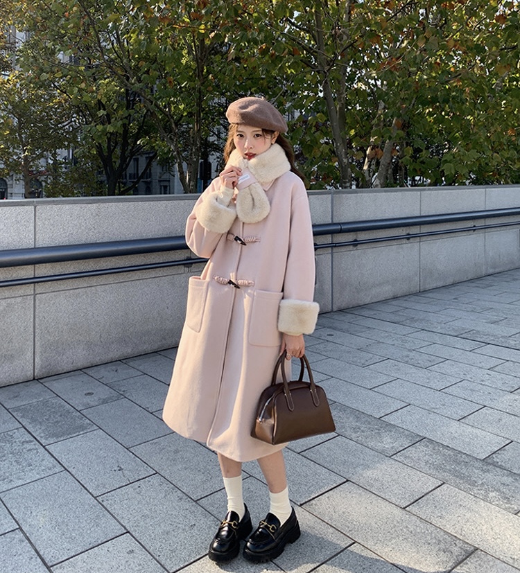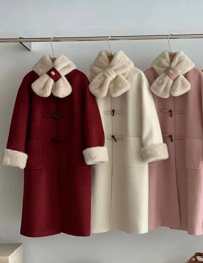 【GZ】无忧购韩系温柔宽松显瘦中长款围巾牛角扣加绒毛呢大衣9020# (截单后7天发货)25年清仓捡漏
