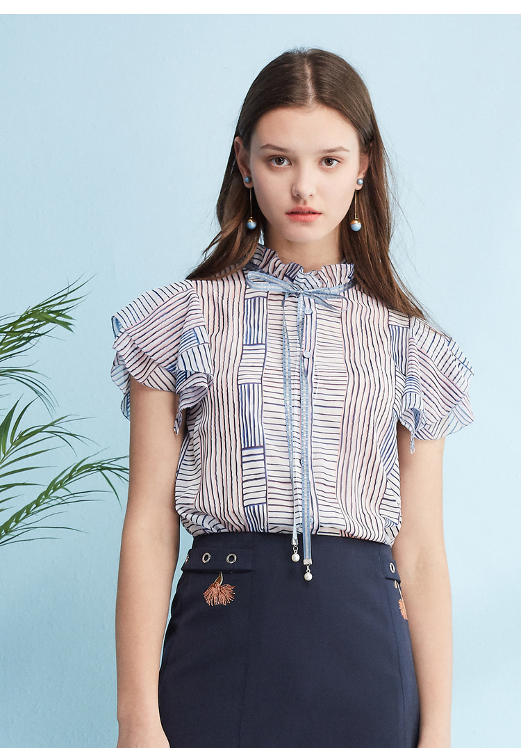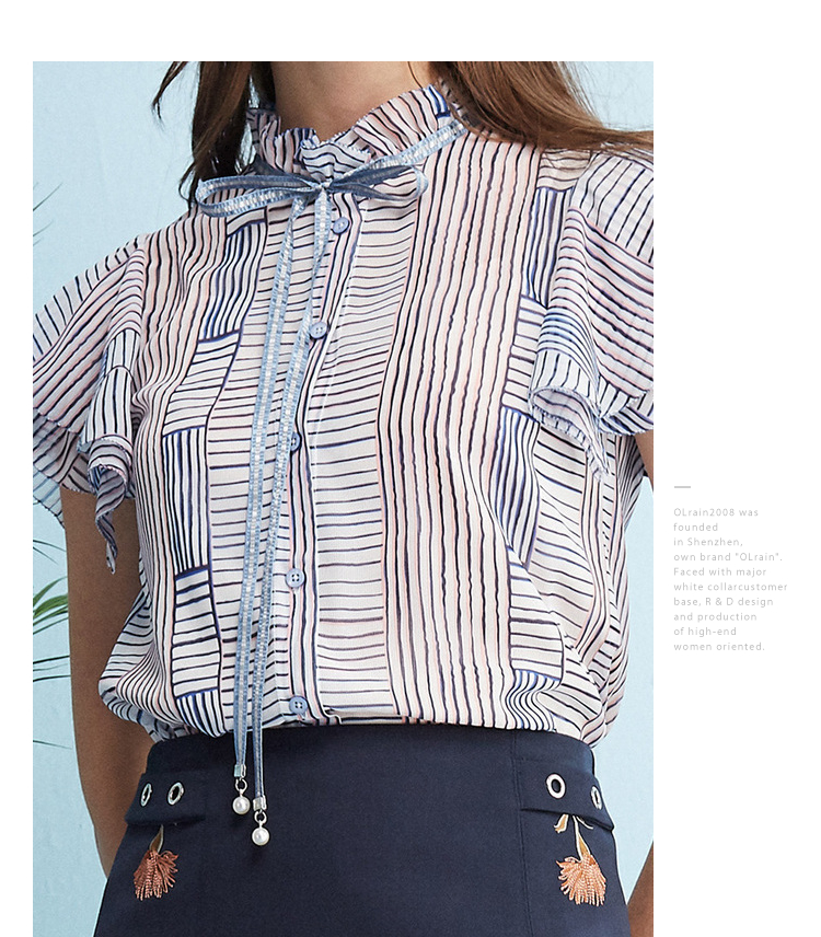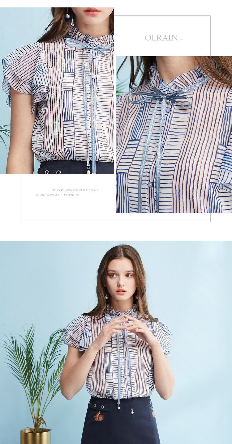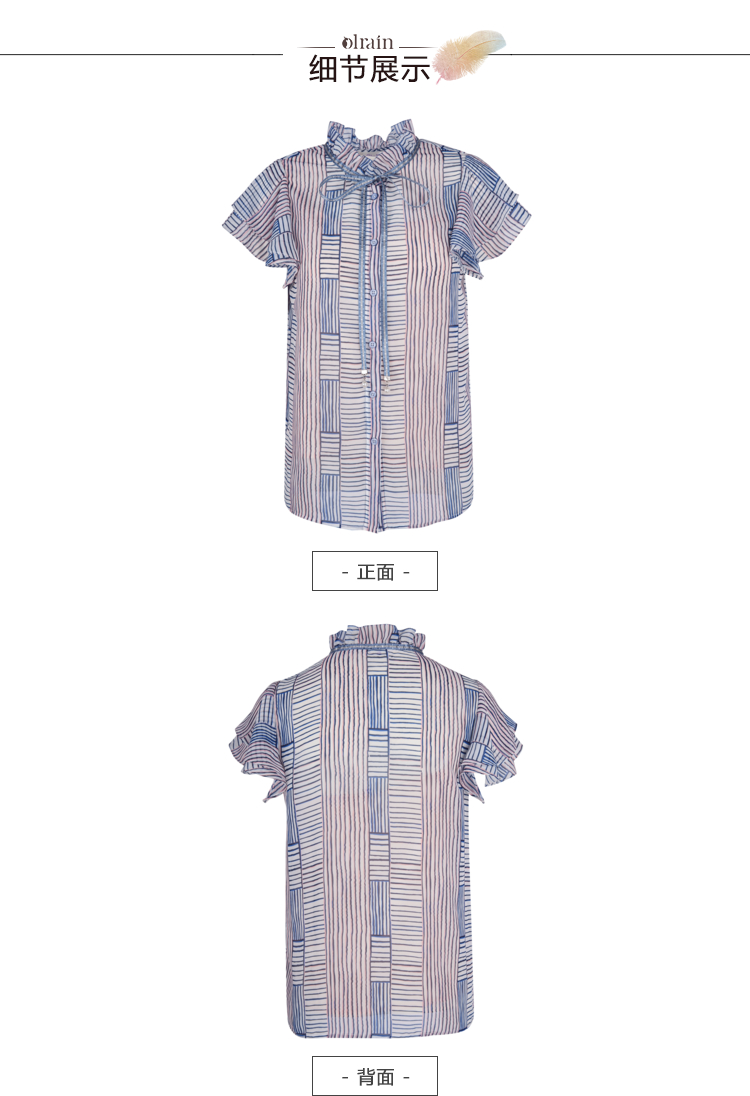 欧芮儿2019夏装新款蝴蝶结小衫衬衣女荷叶袖条纹雪纺衫女短袖