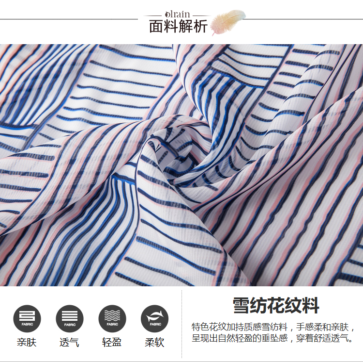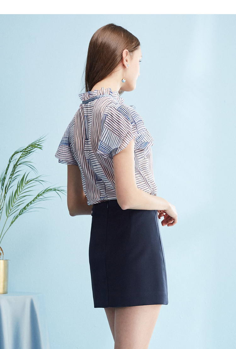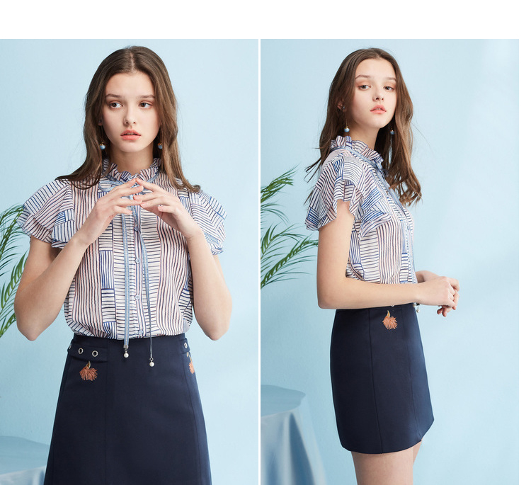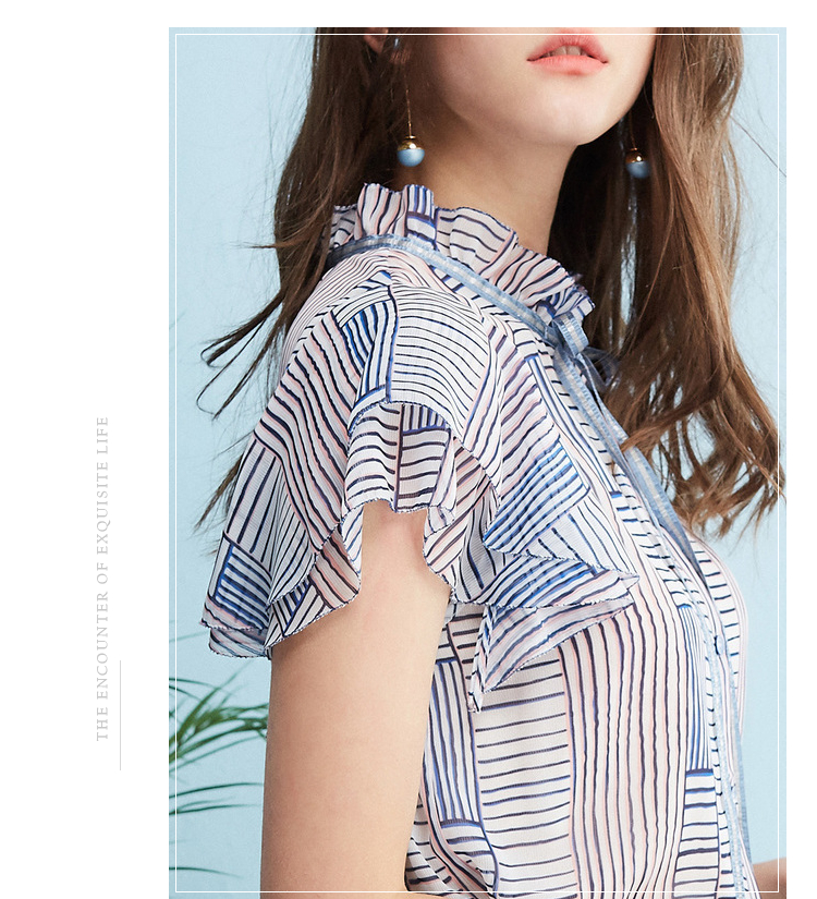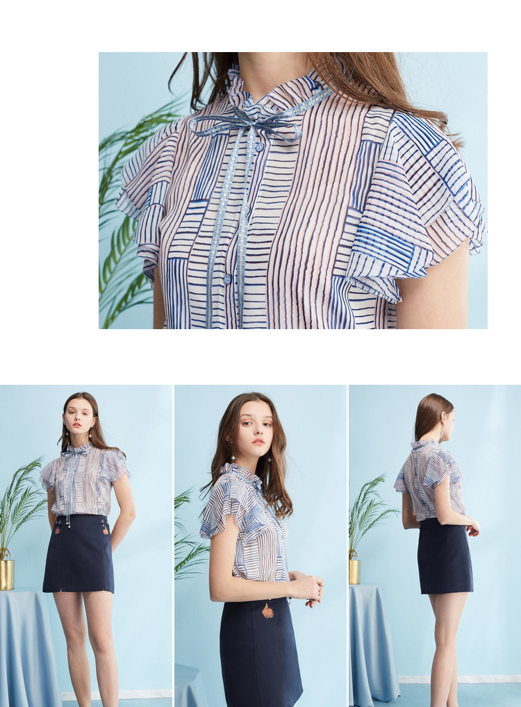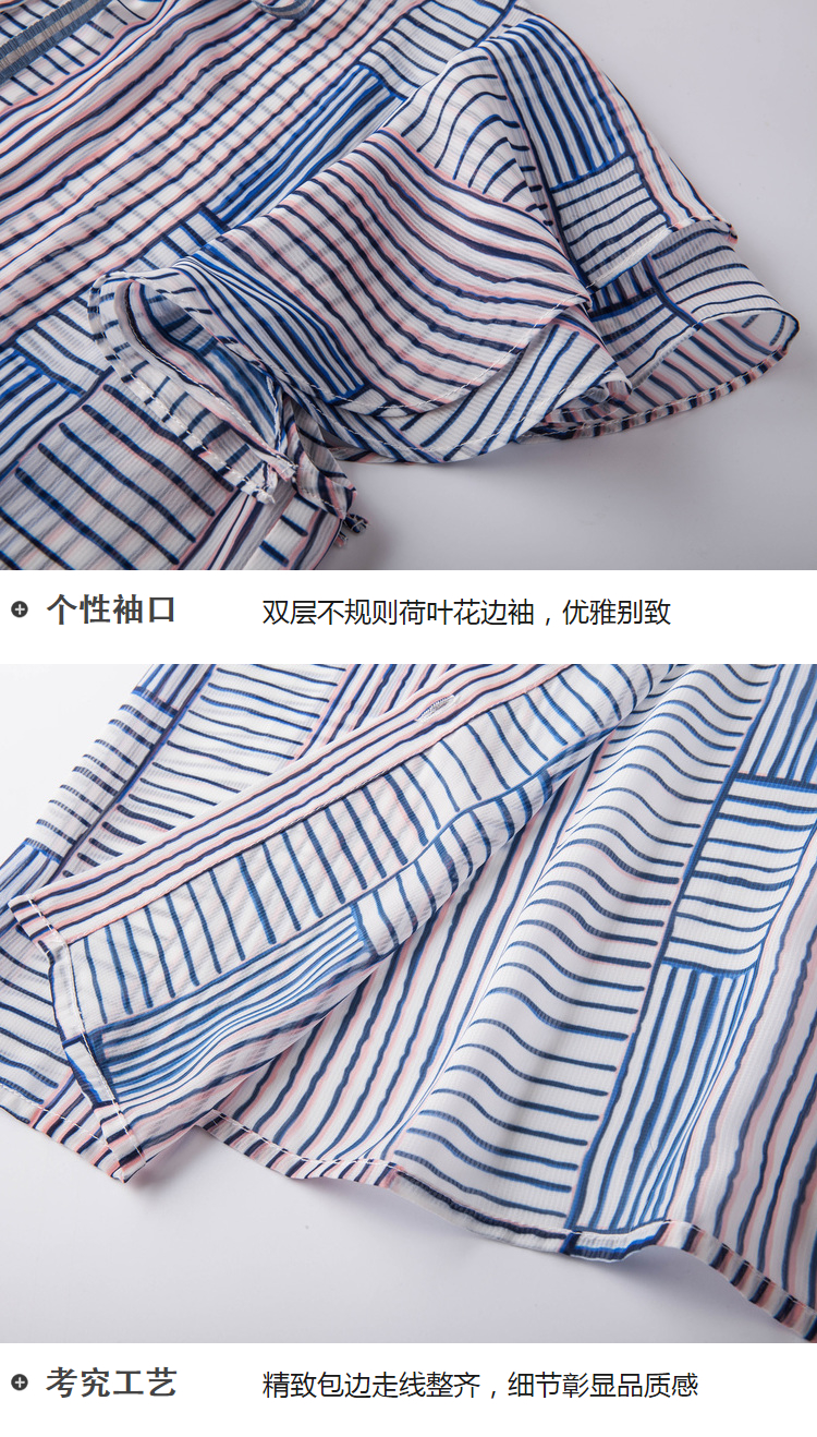 欧芮儿2019夏装新款蝴蝶结小衫衬衣女荷叶袖条纹雪纺衫女短袖