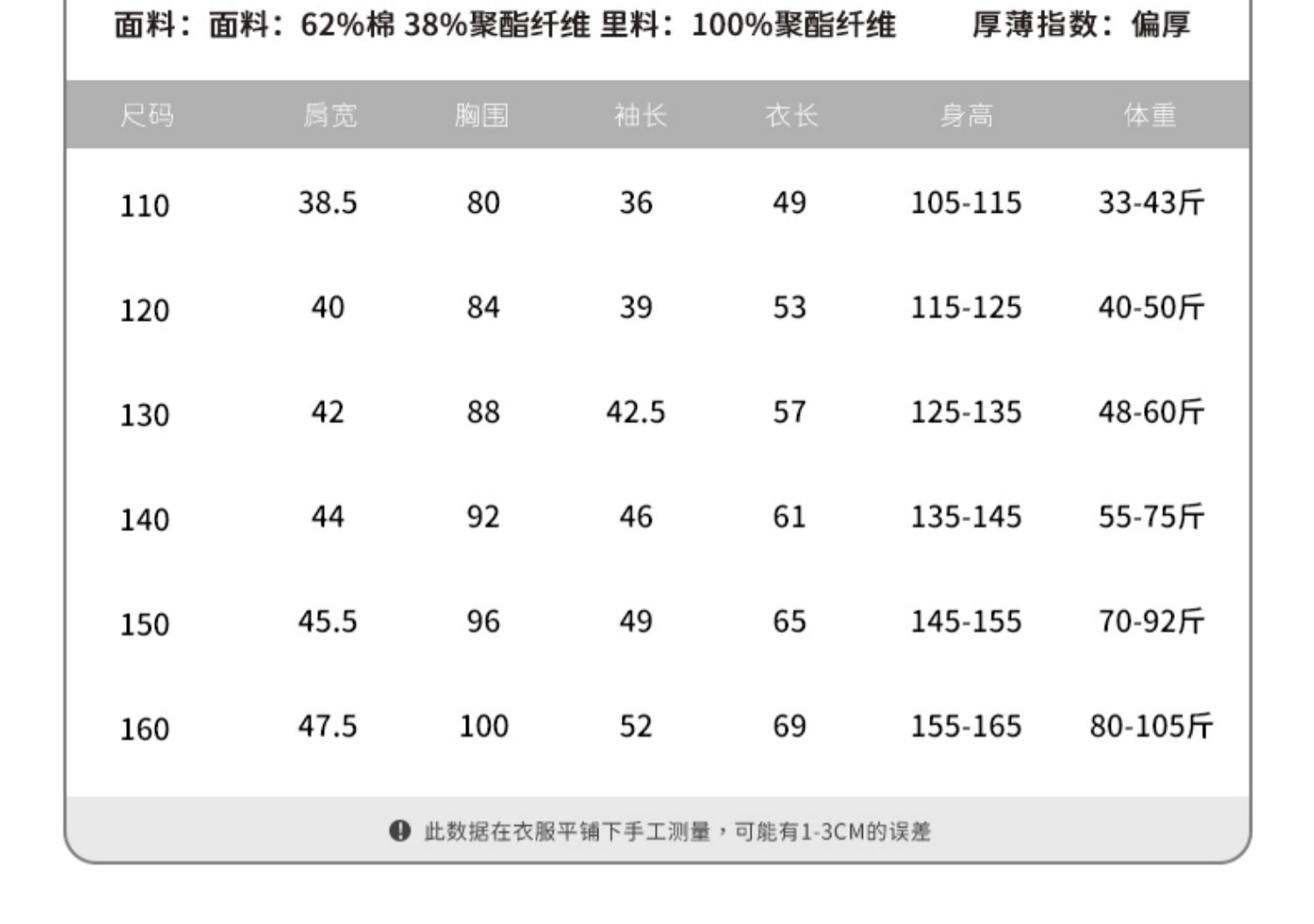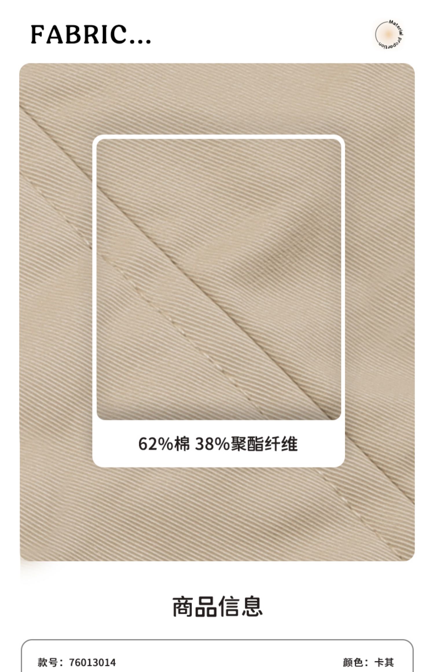 | 材质成分: 棉62% 聚酯纤维38% | 里料材质成分: 聚酯纤维100% |