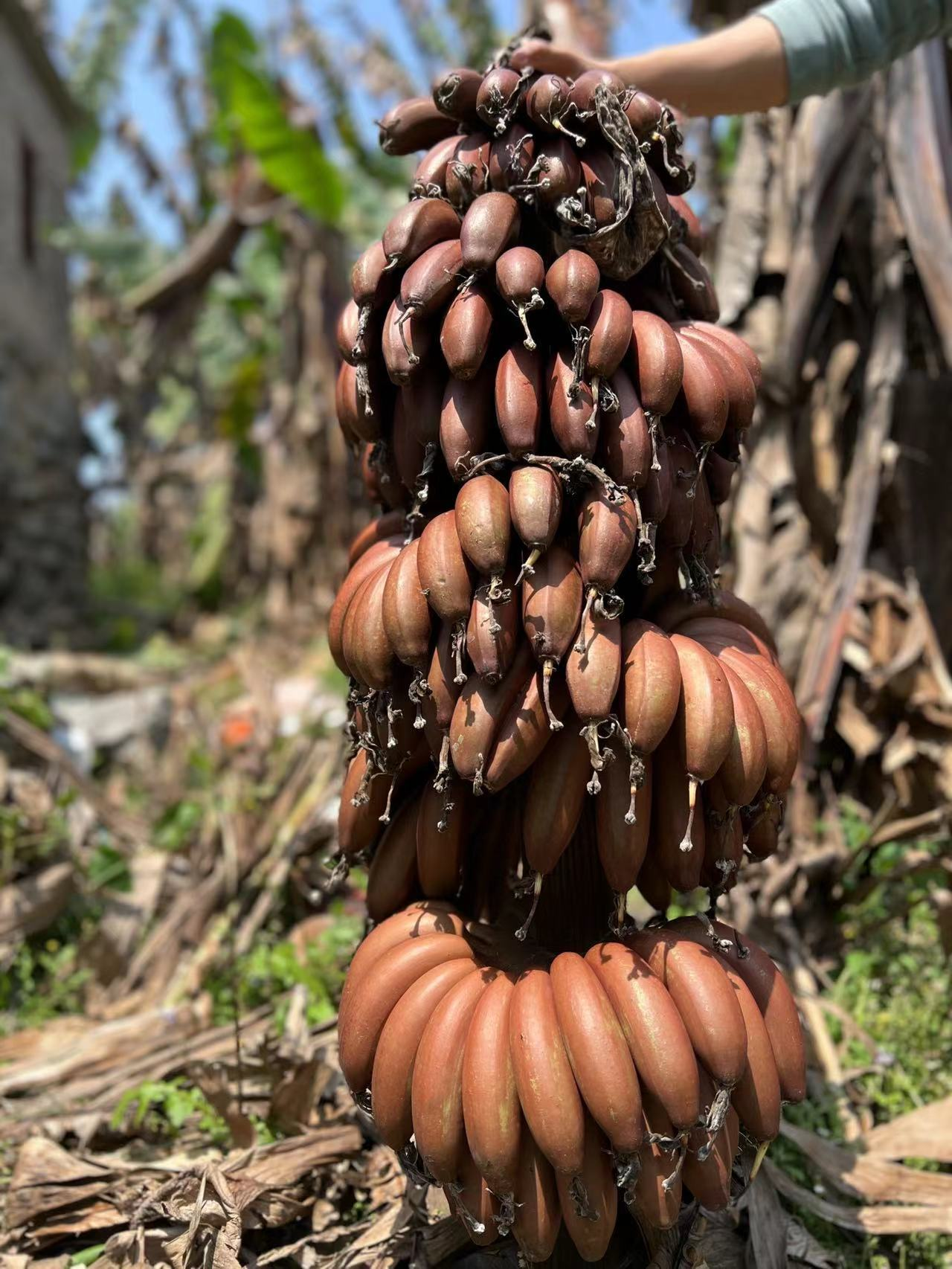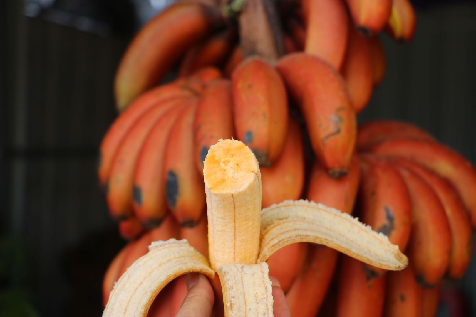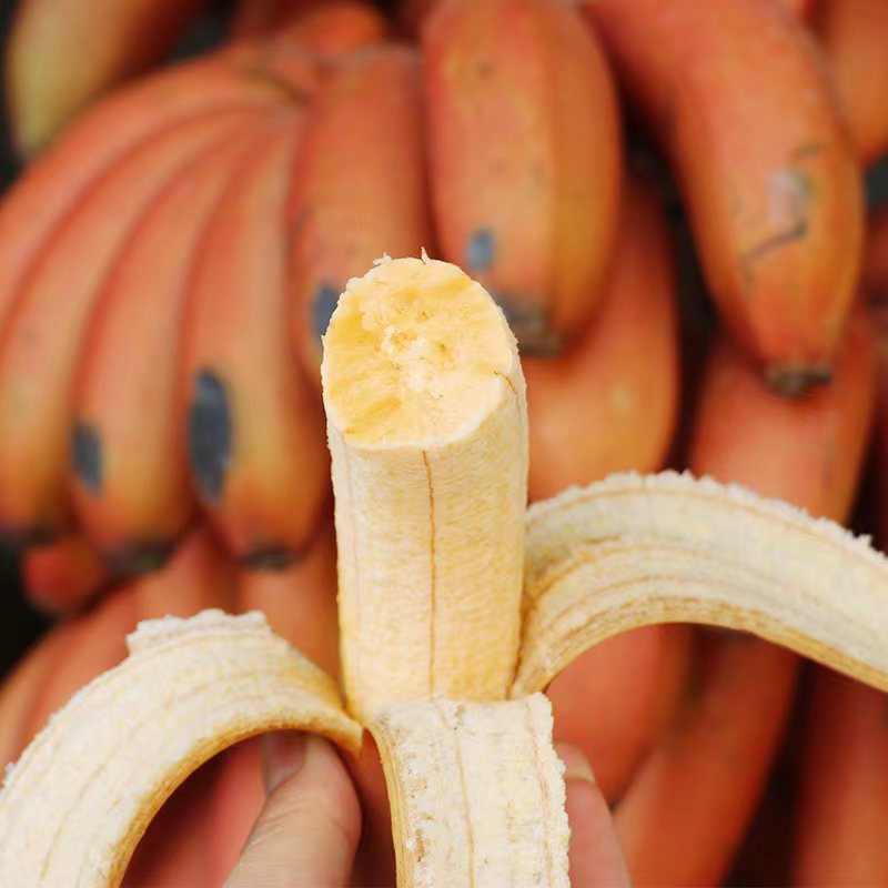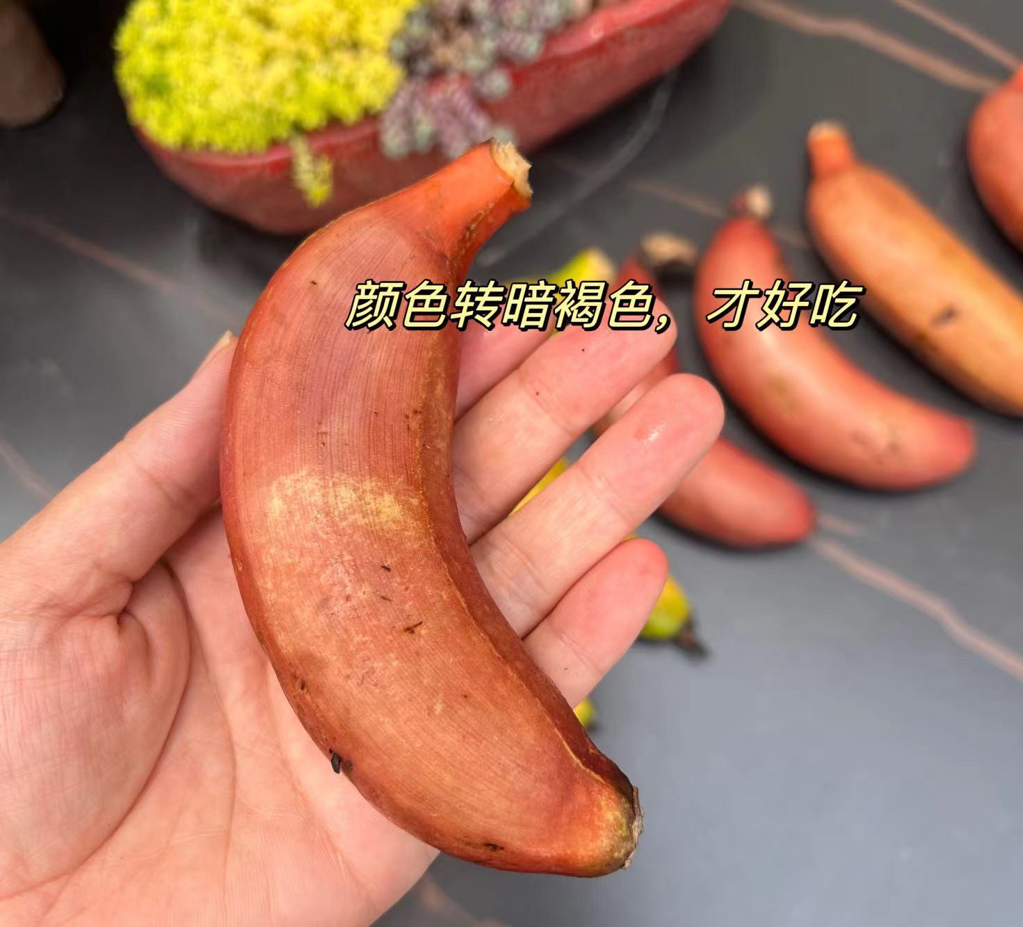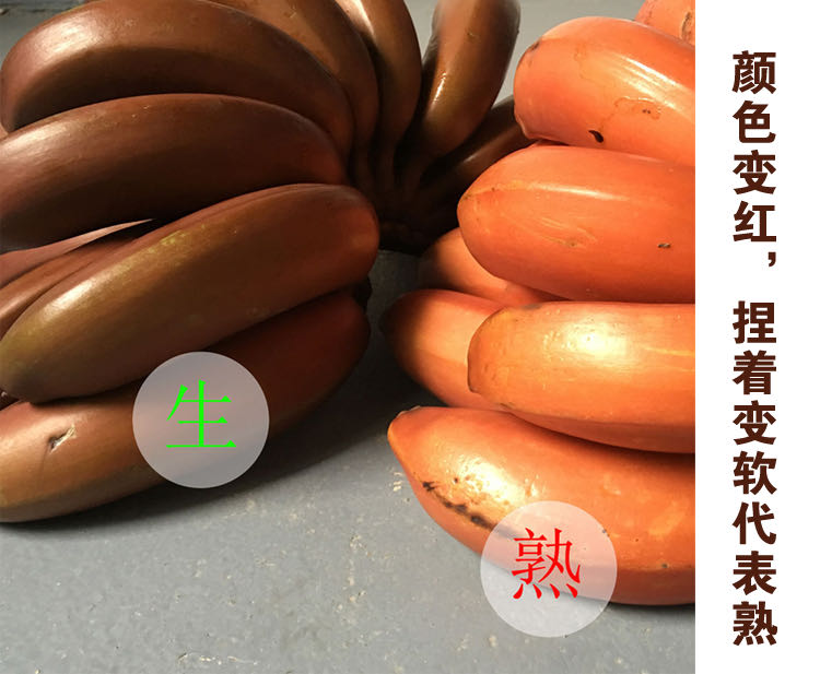 美人蕉红色的,这是不一样的品种,美人蕉的树比一般香蕉高大,果树高达5-6米多,果树也自带红色,果实从生长出来就是红色的,所以颜色也并不是染上去的,自然生长,可以放心食用