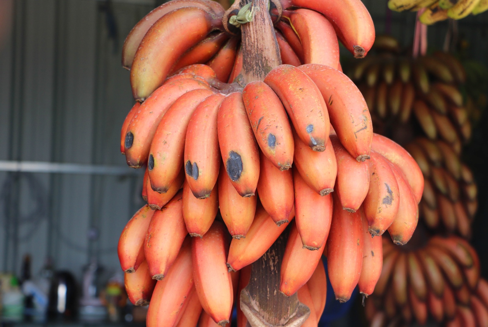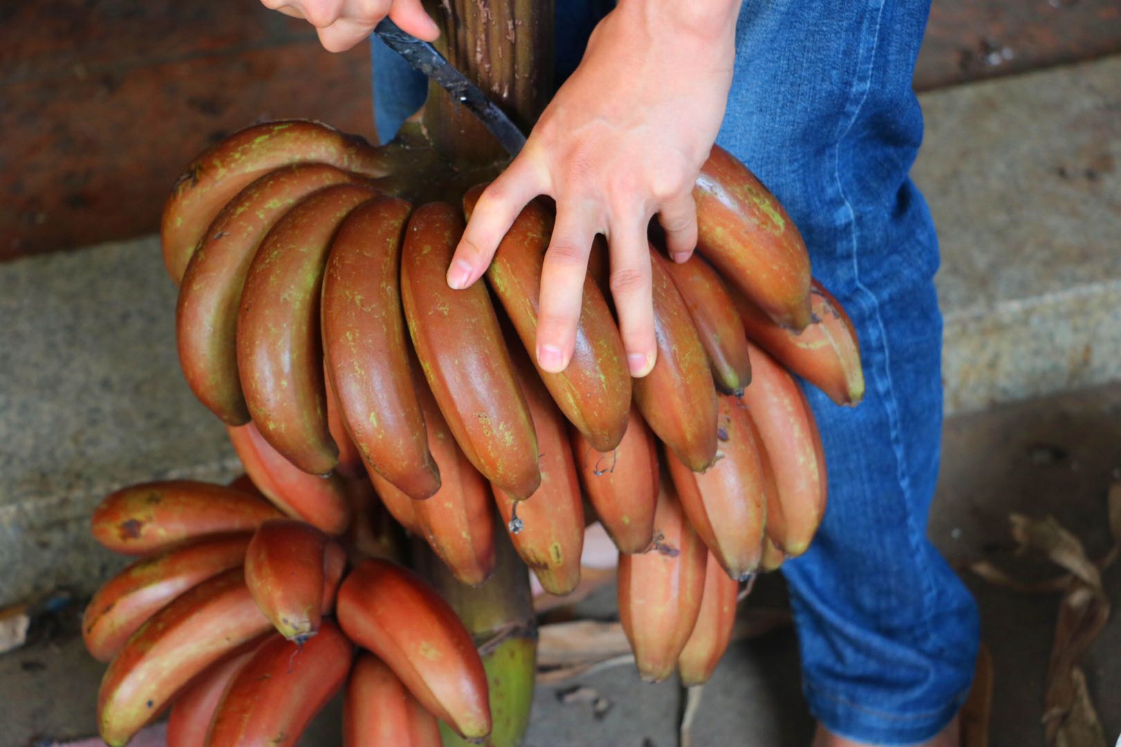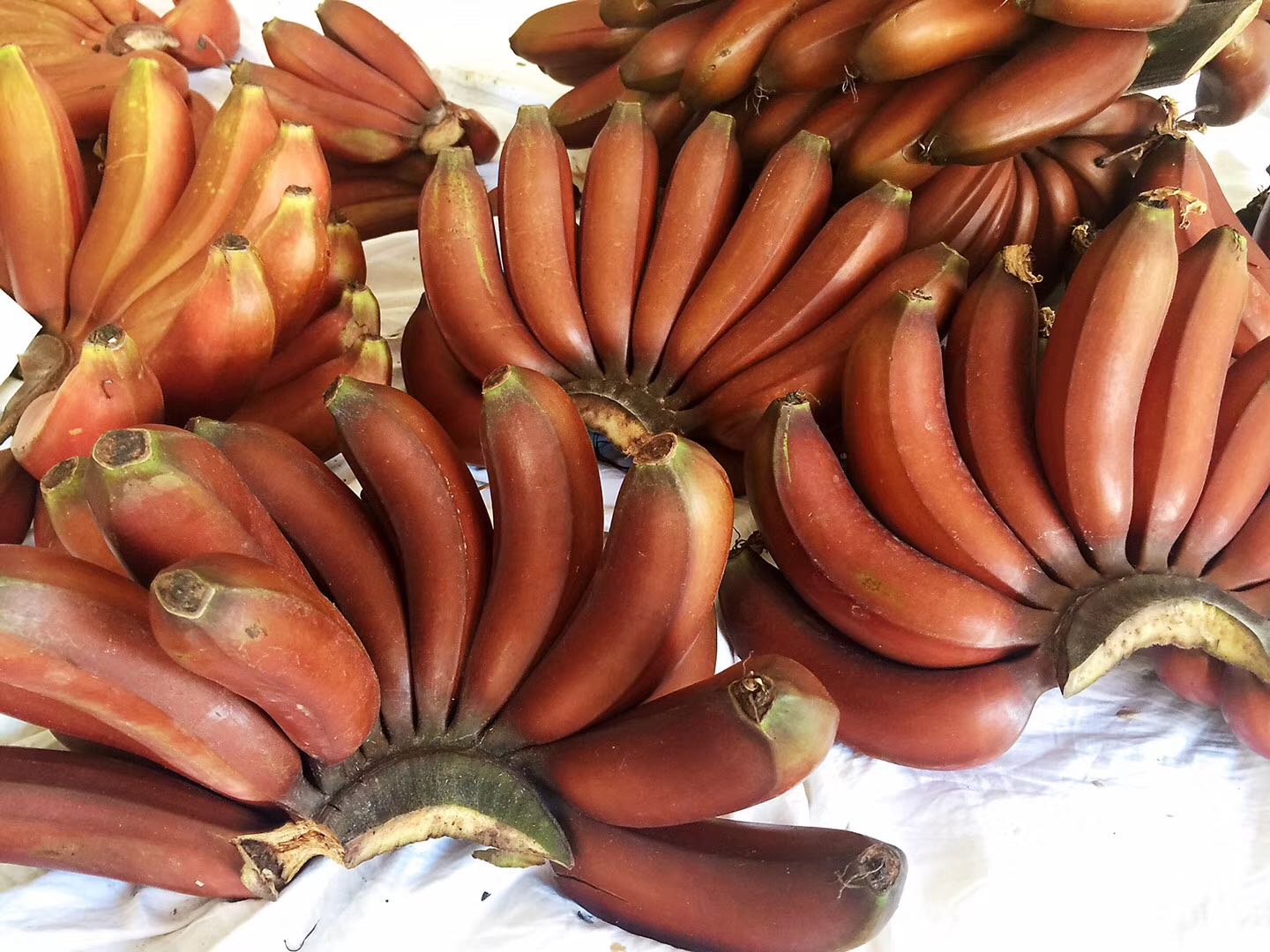 美人蕉红色的,这是不一样的品种,美人蕉的树比一般香蕉高大,果树高达5-6米多,果树也自带红色,果实从生长出来就是红色的,所以颜色也并不是染上去的,自然生长,可以放心食用