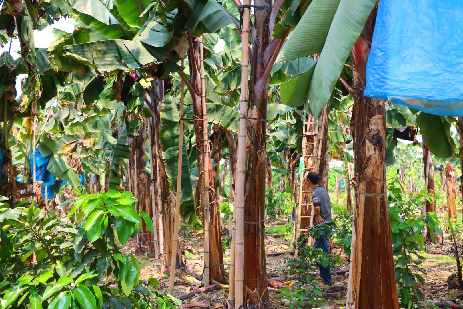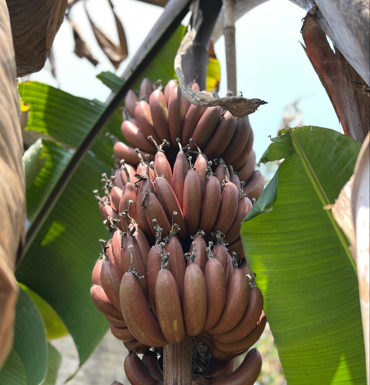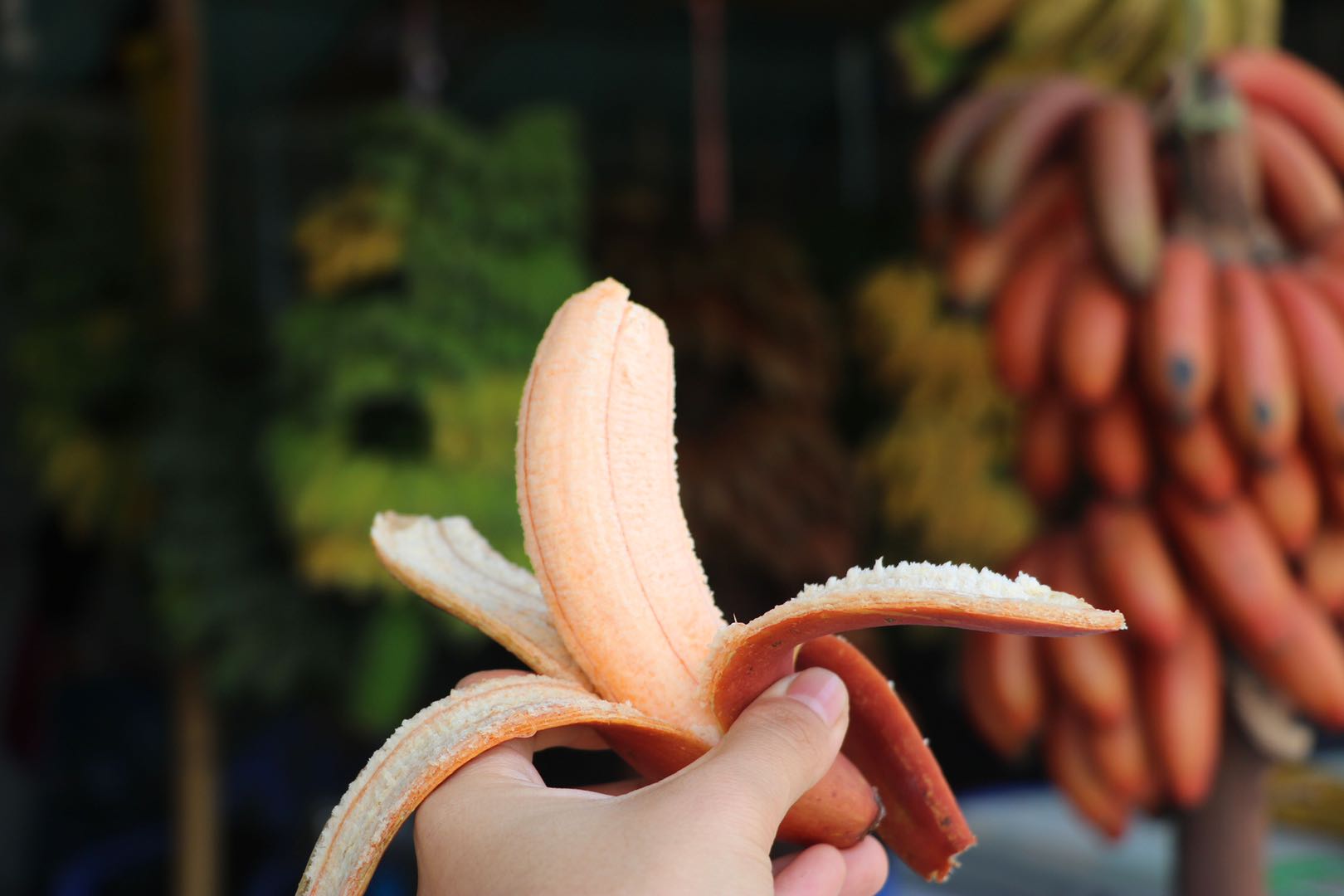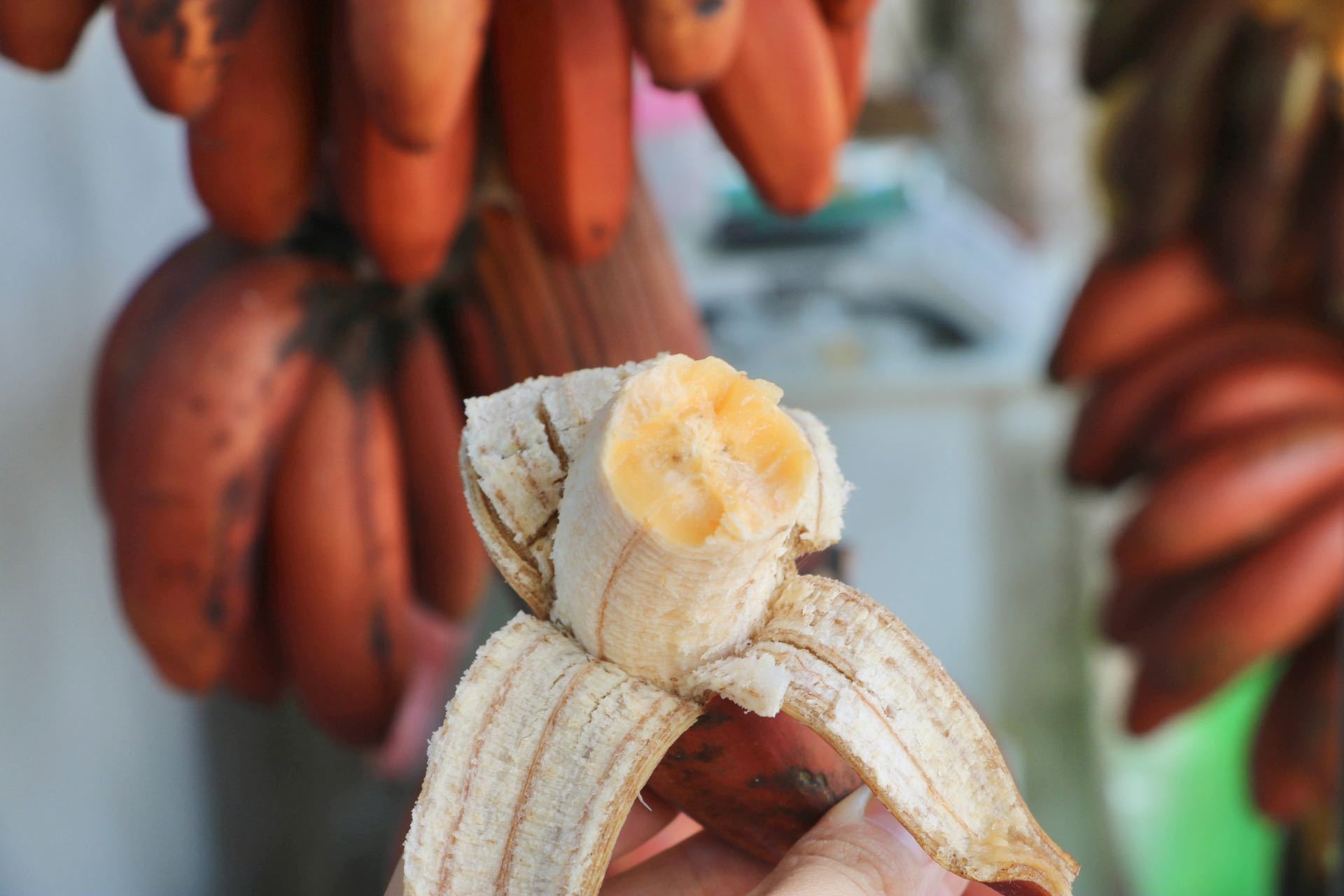 美人蕉红色的,这是不一样的品种,美人蕉的树比一般香蕉高大,果树高达5-6米多,果树也自带红色,果实从生长出来就是红色的,所以颜色也并不是染上去的,自然生长,可以放心食用