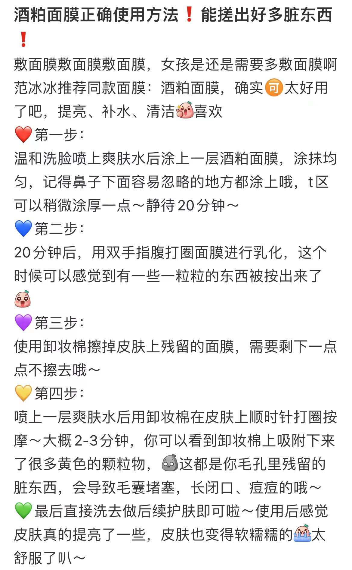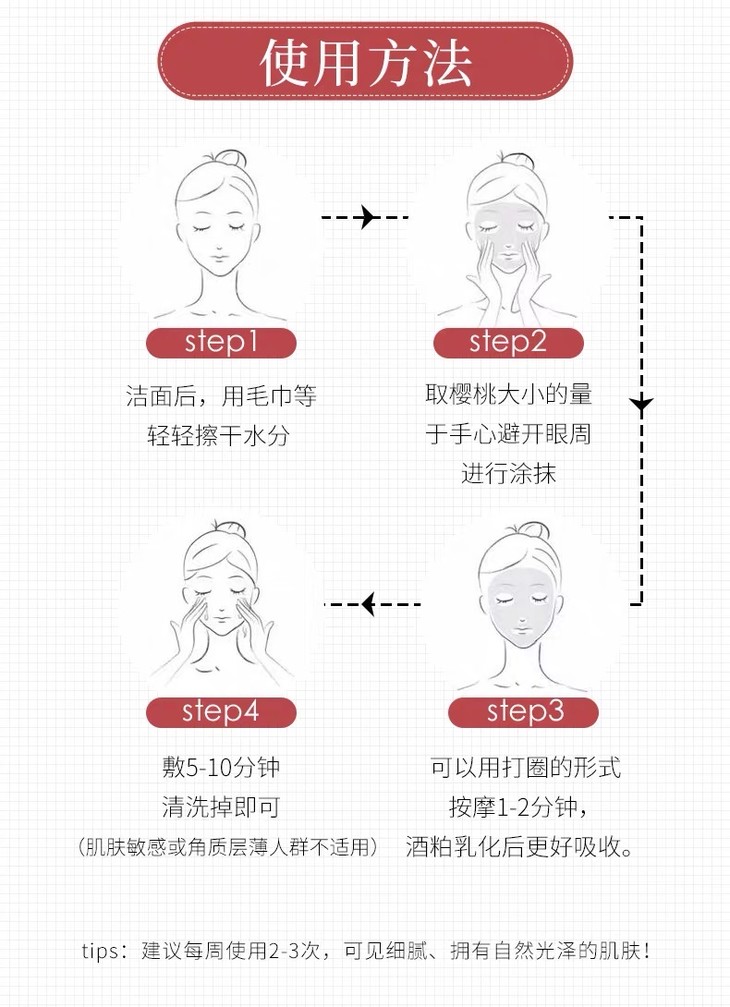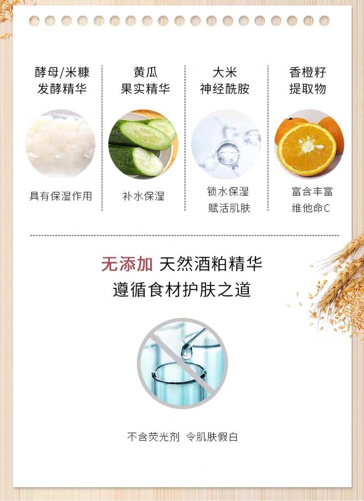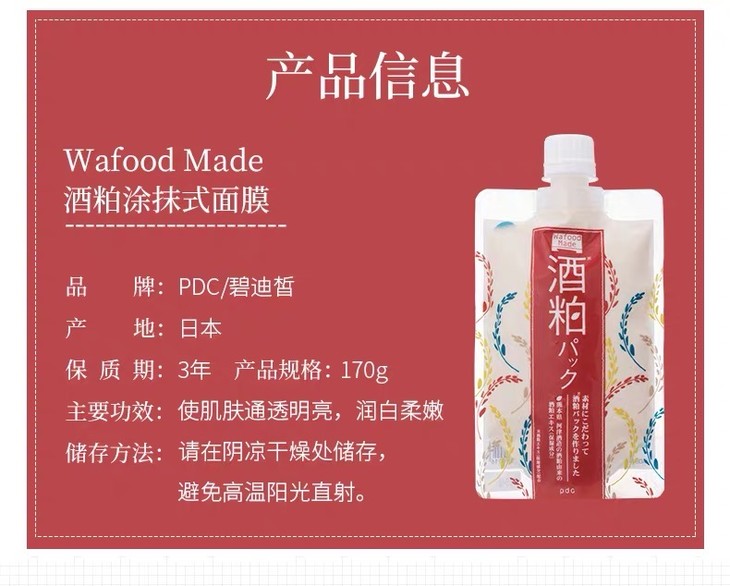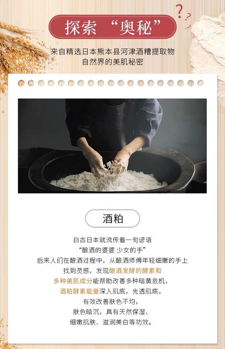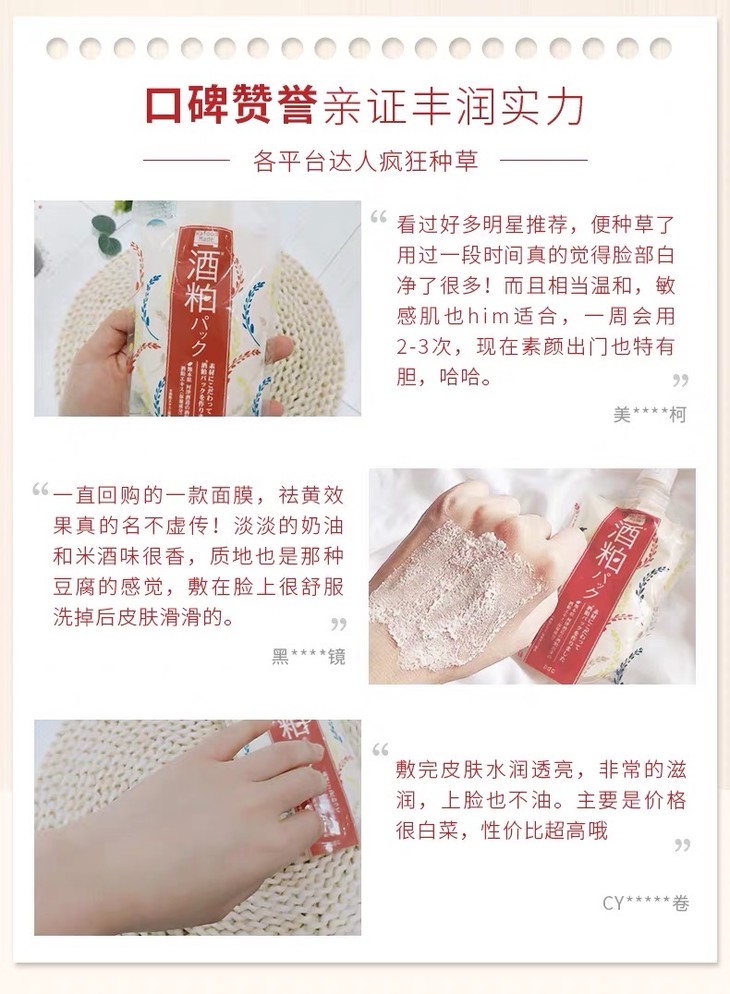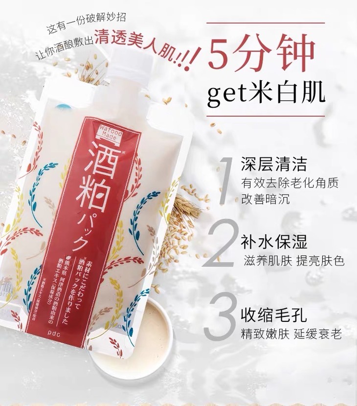 3、功效:酒粕涂抹面膜,来自熊本县的纯天然酒糟和酵母,保湿美白,有淡淡酒糟香。非常好用!调整毛孔和细腻皮肤纹理,洗掉以后皮肤又亮又白,不输lamer10分钟急救面膜!范冰冰小红书推荐!帮助皮肤保湿美白,还有淡淡酒糟香,一周2-3次即可。