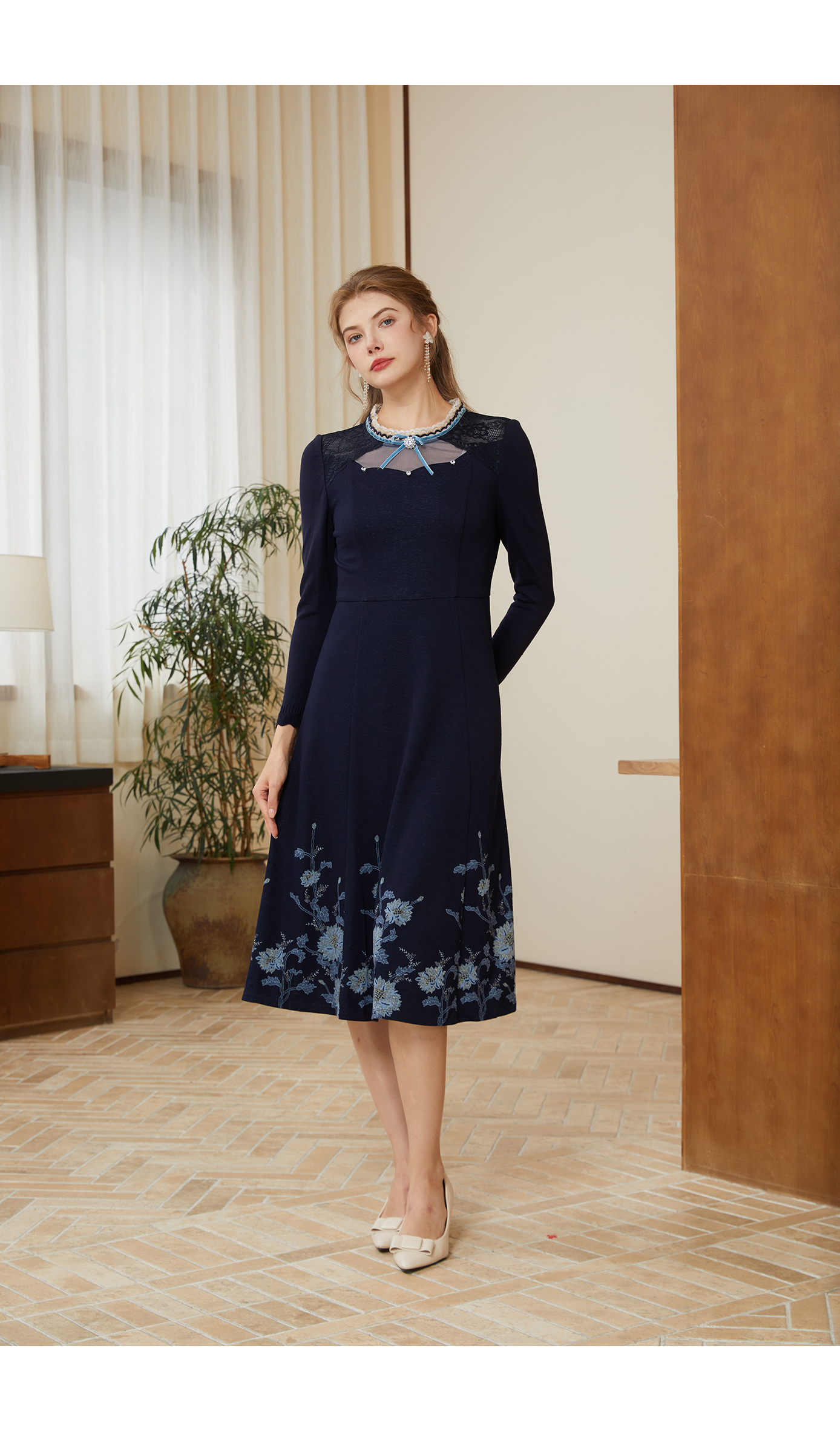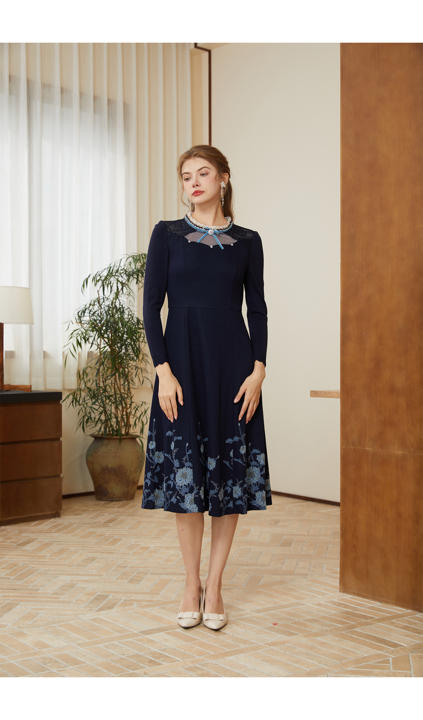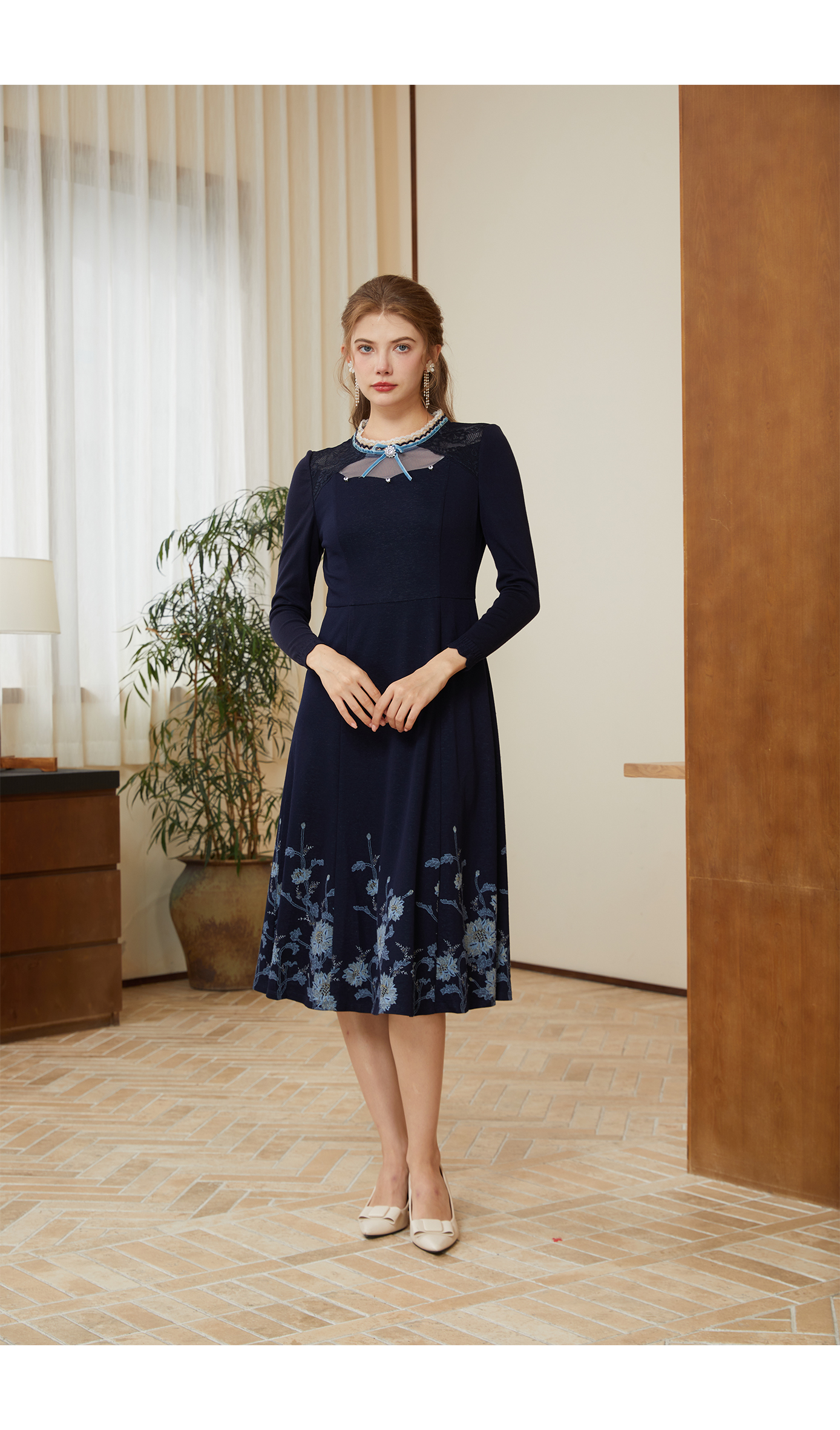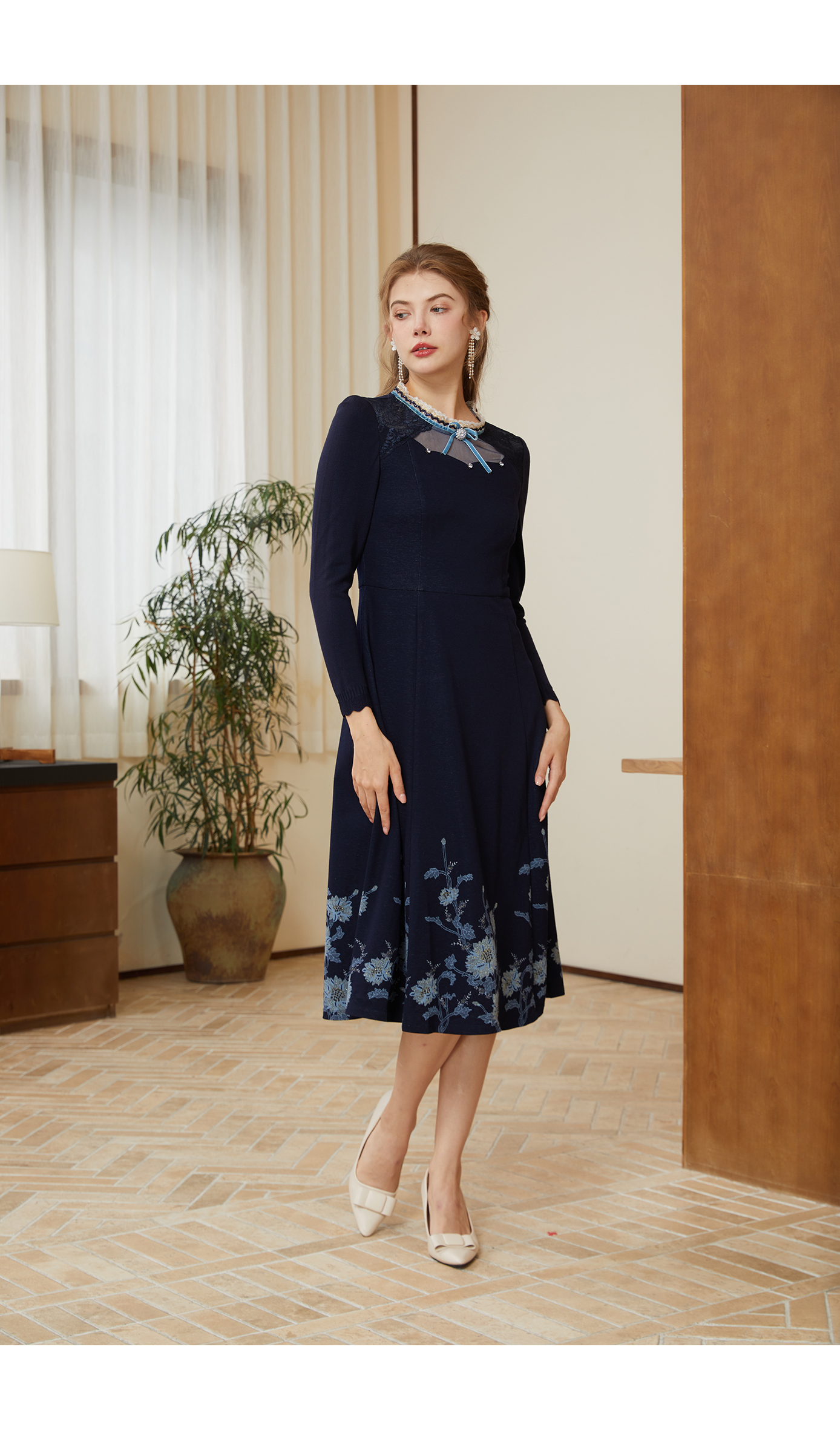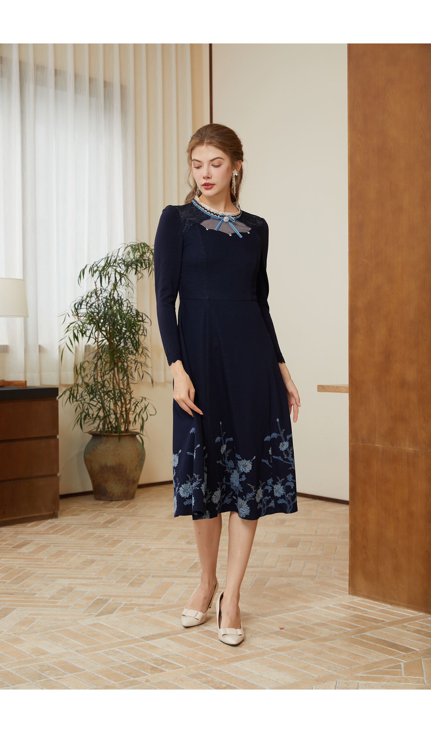 司歌弹力拼毛织收腰冬连衣裙绣花复古优雅A901122X