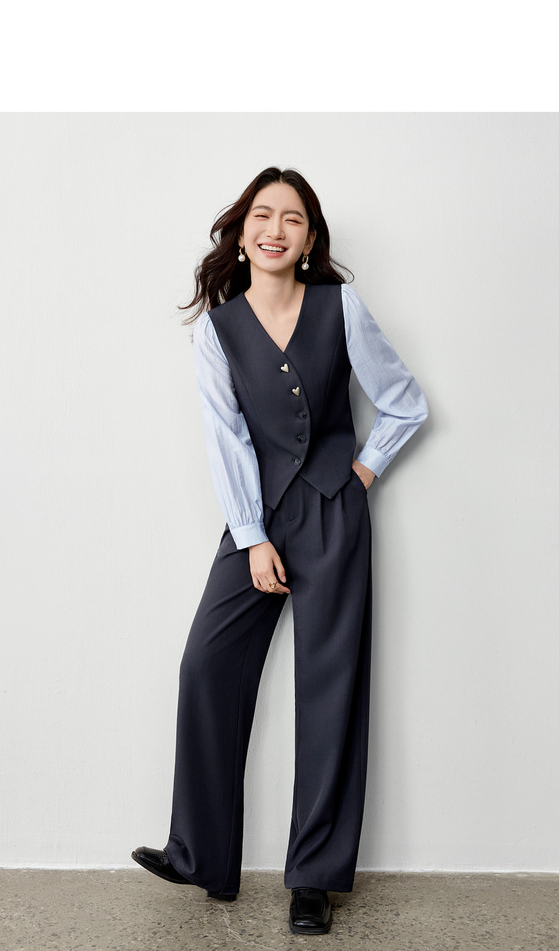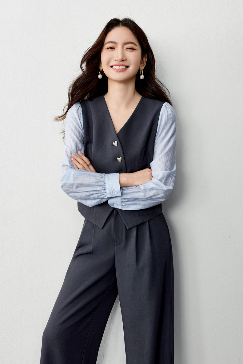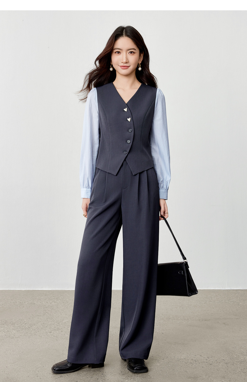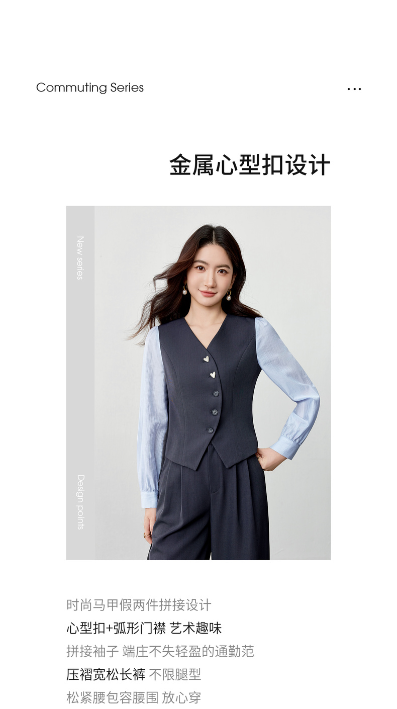 【内购】【拼接袖设计】金属心型扣弧形门襟松紧腰直筒裤马甲假两件套装-153ZA2601