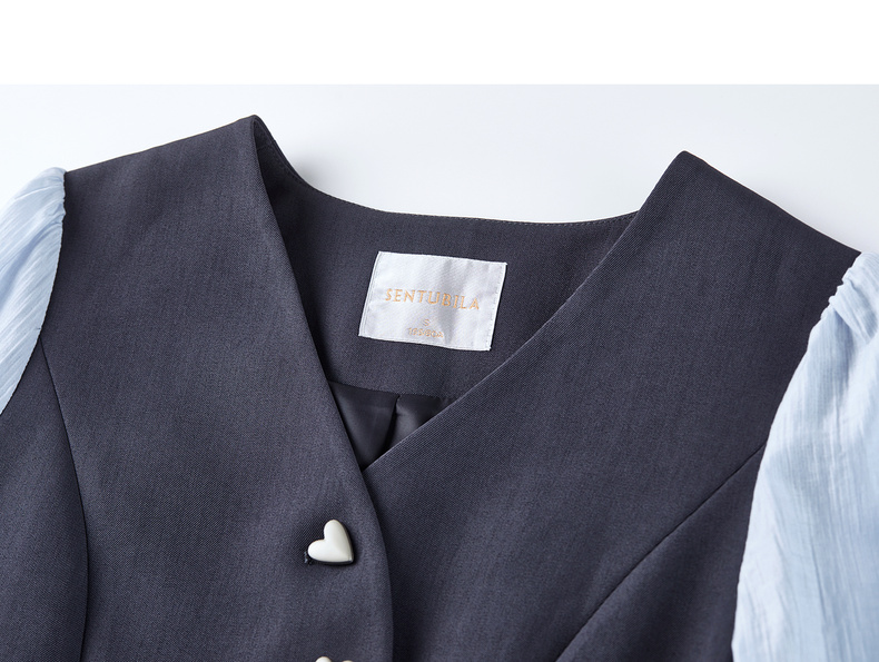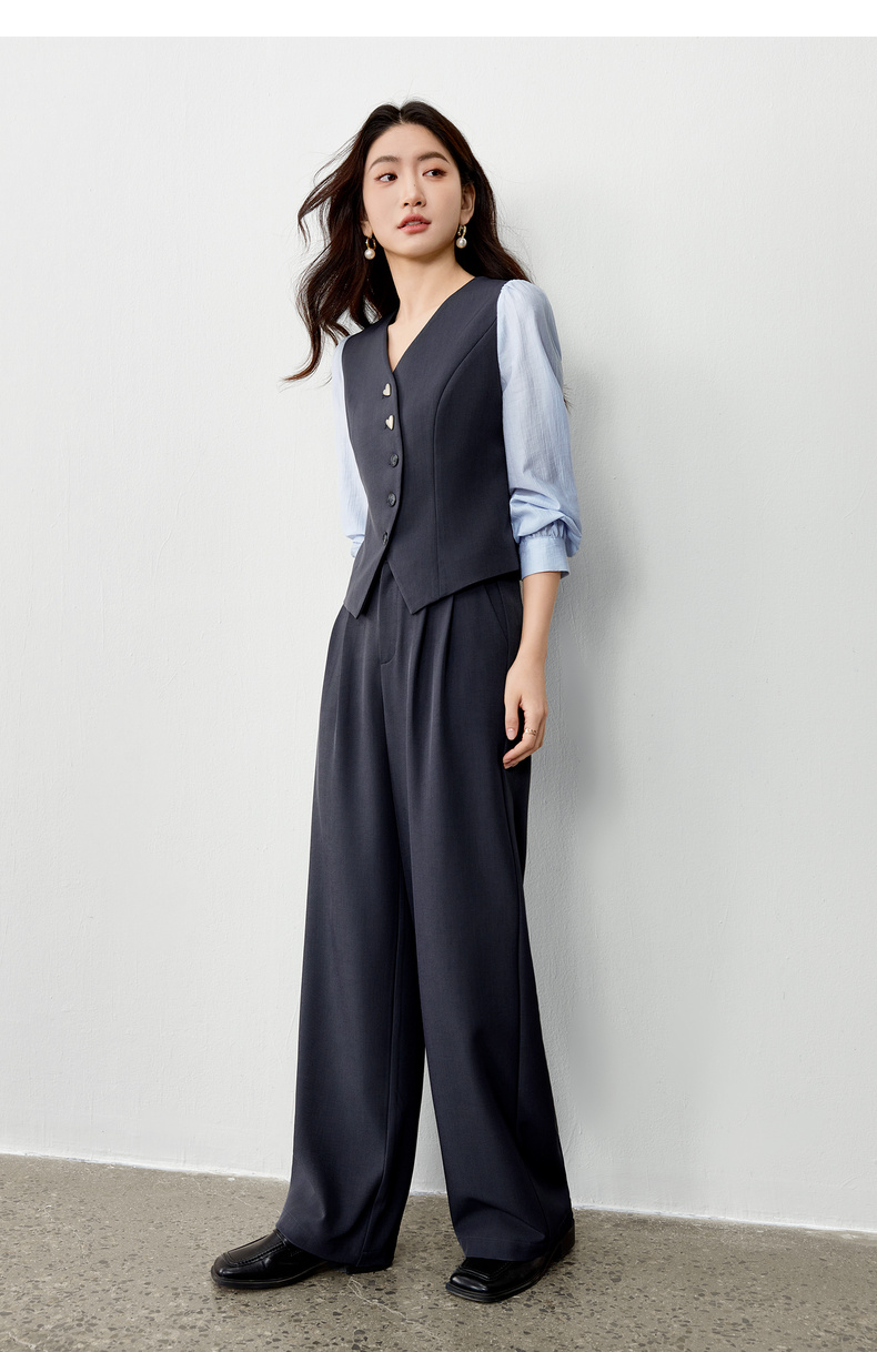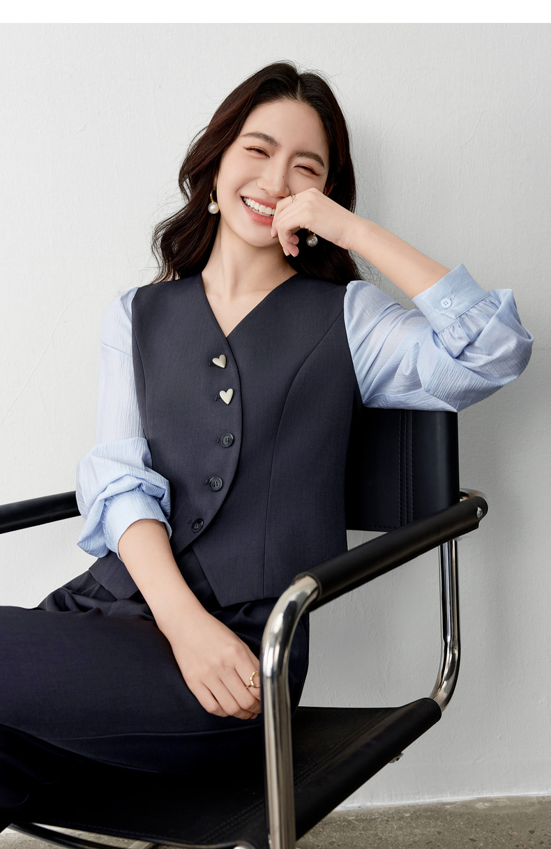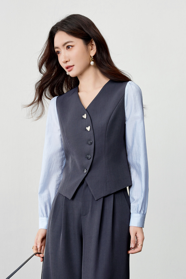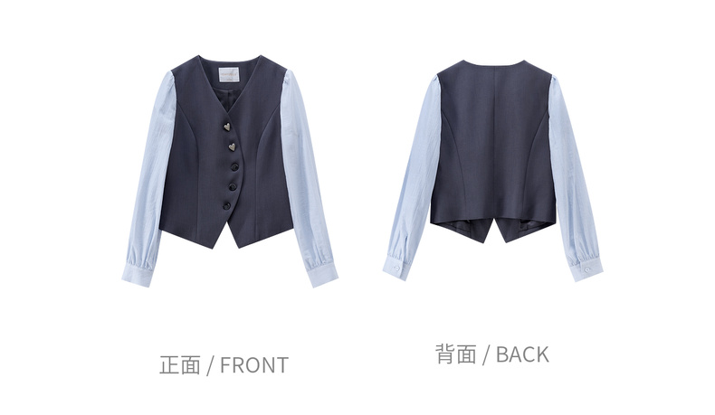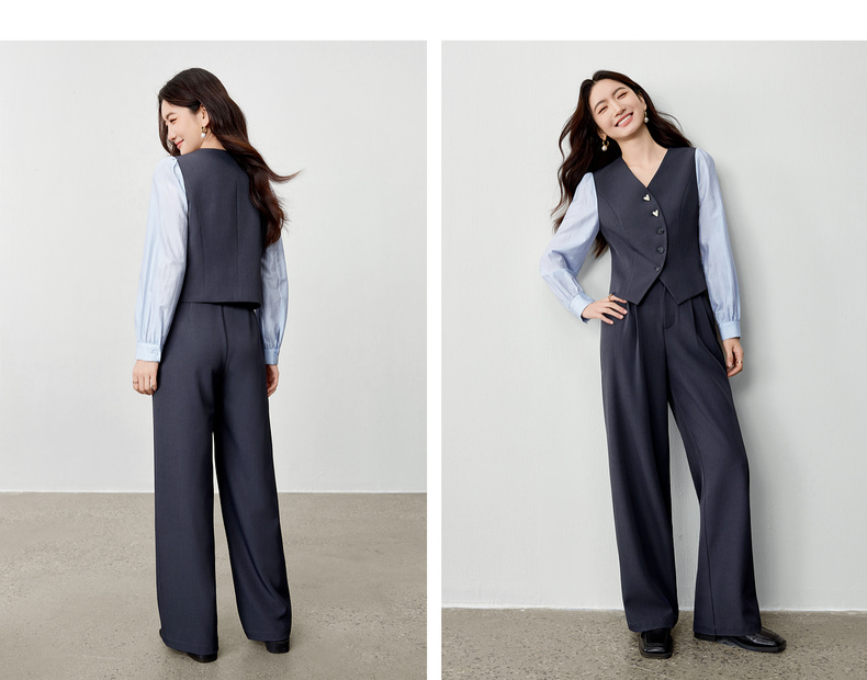 【内购】【拼接袖设计】金属心型扣弧形门襟松紧腰直筒裤马甲假两件套装-153ZA2601