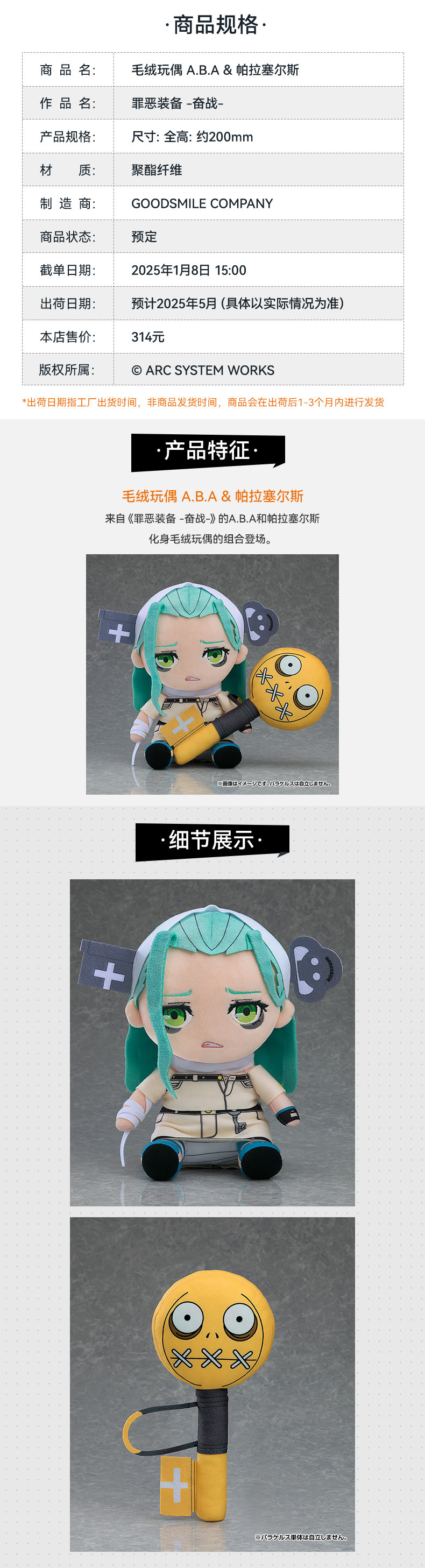 【GSC现货】毛绒玩偶 A.B.A & 帕拉塞尔斯 罪恶装备 -奋战-