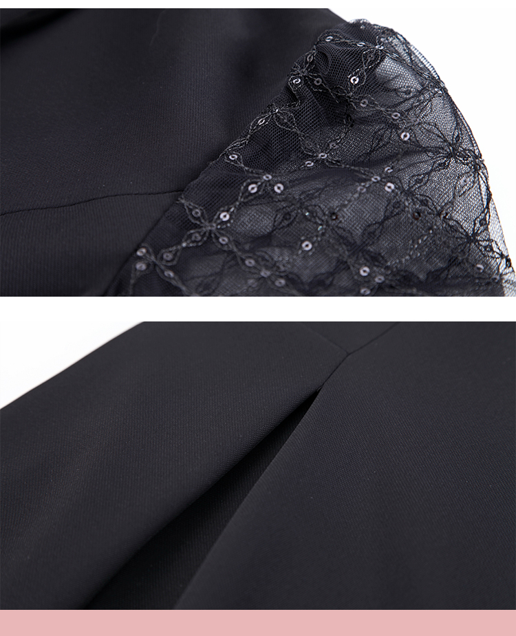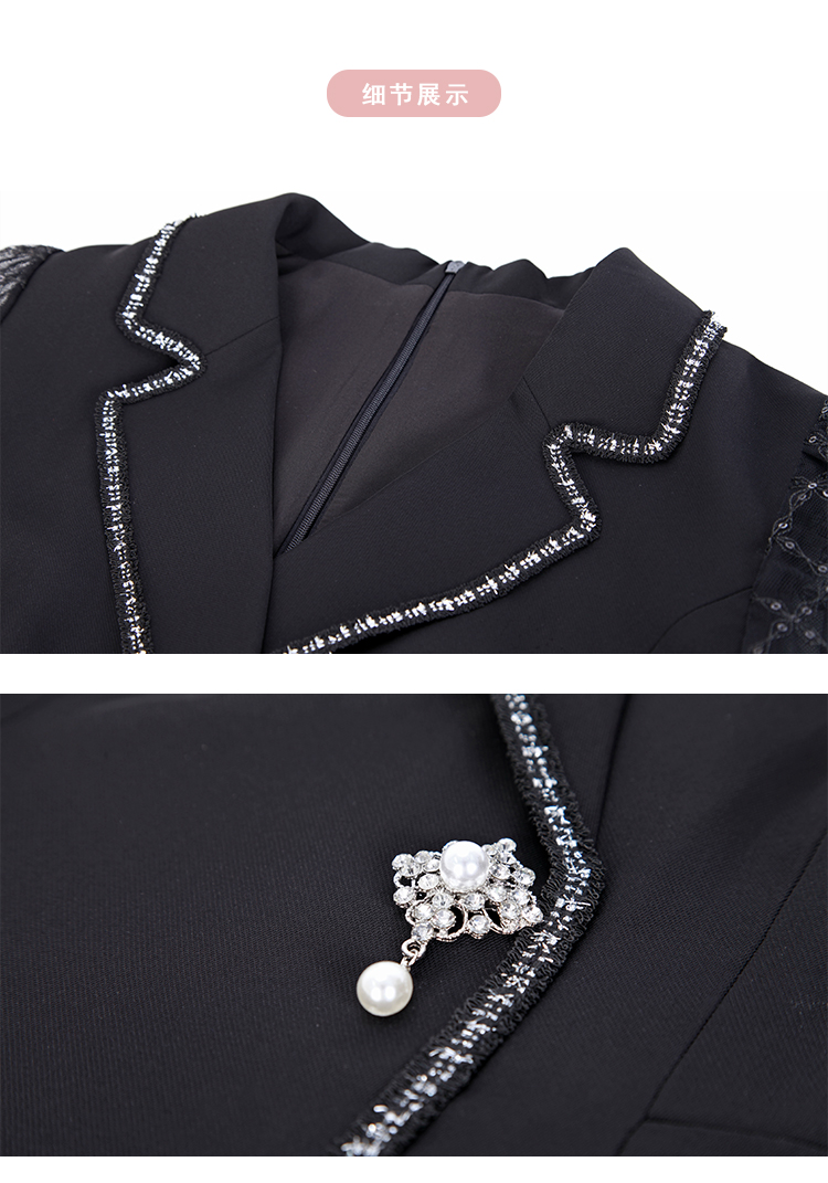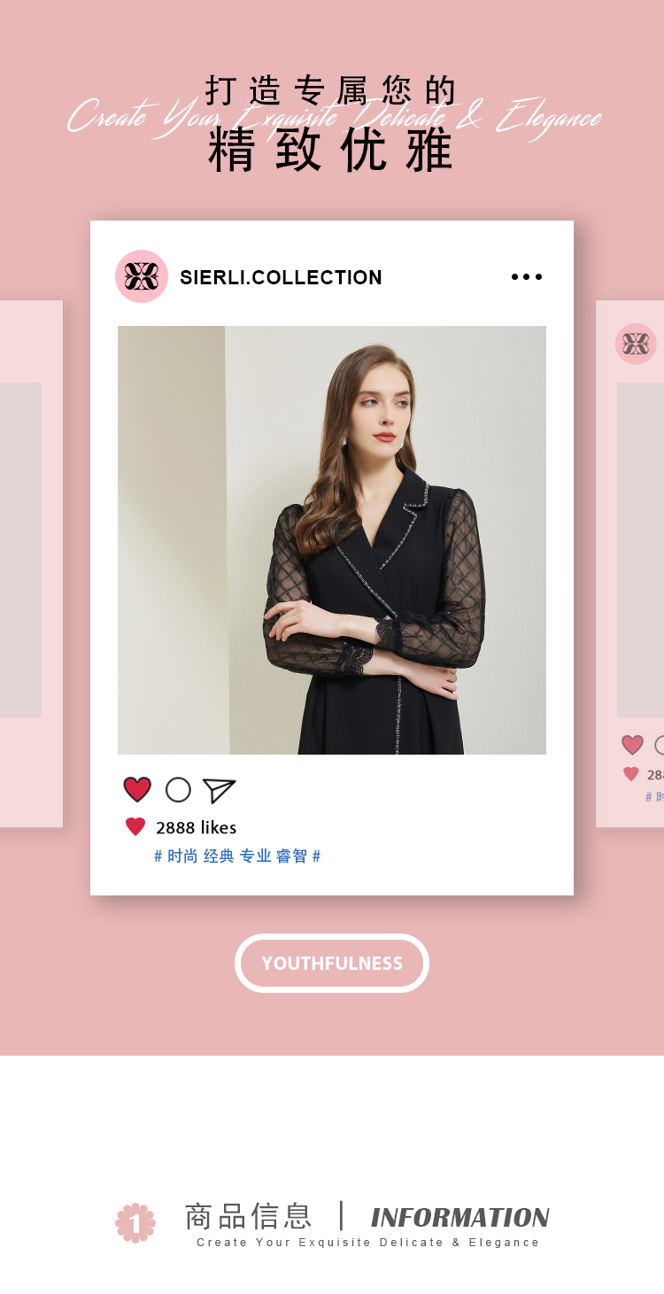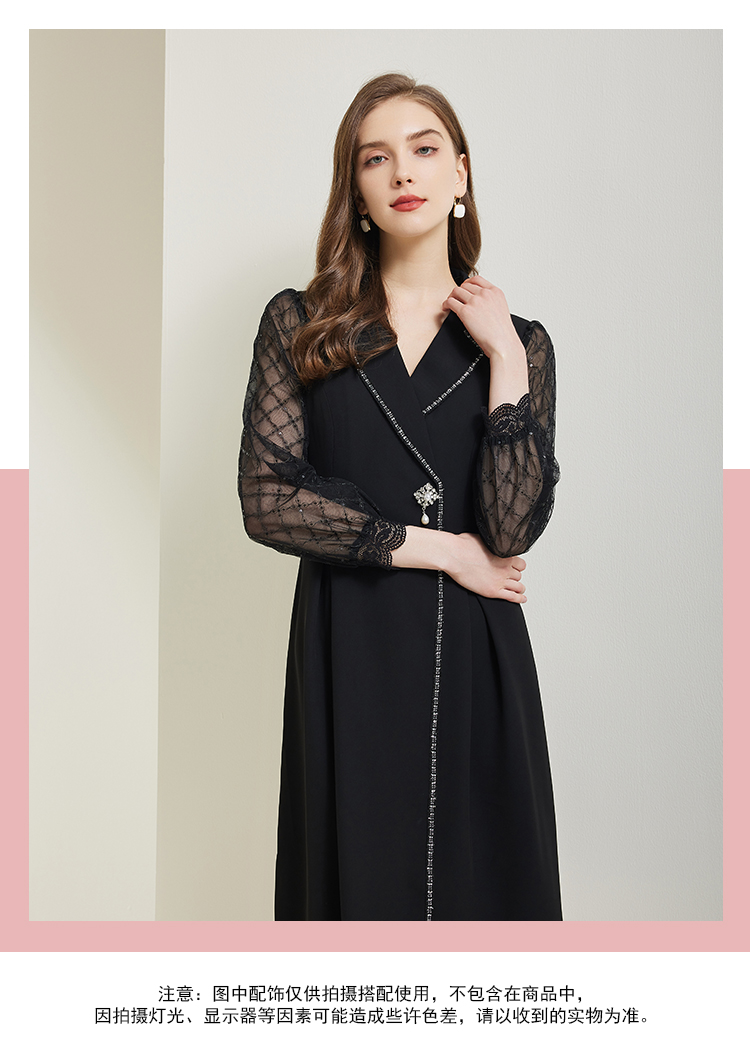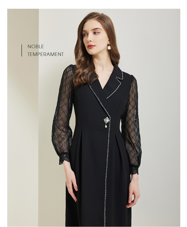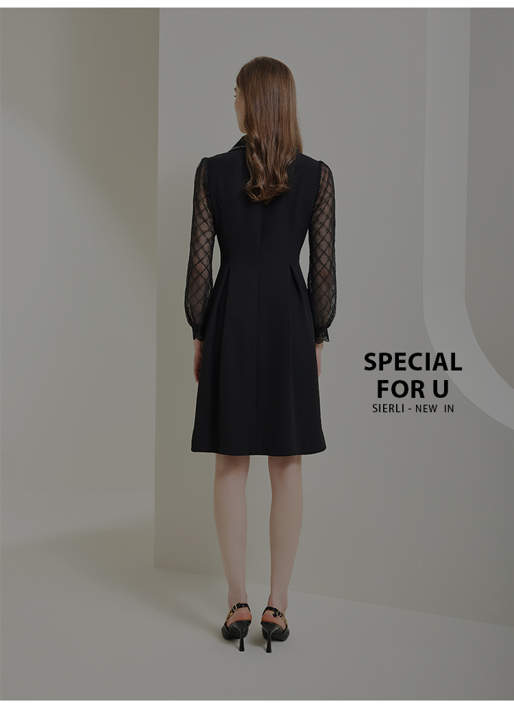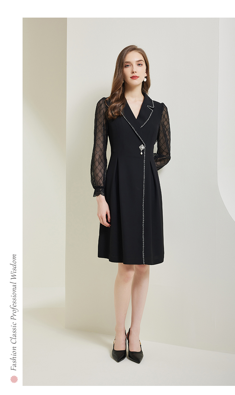 QE84C斯尔丽瑟俪2023新款小西装领镶边钻扣浪漫蕾丝袖褶裥显瘦连衣裙