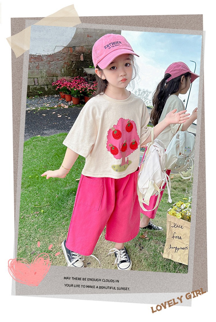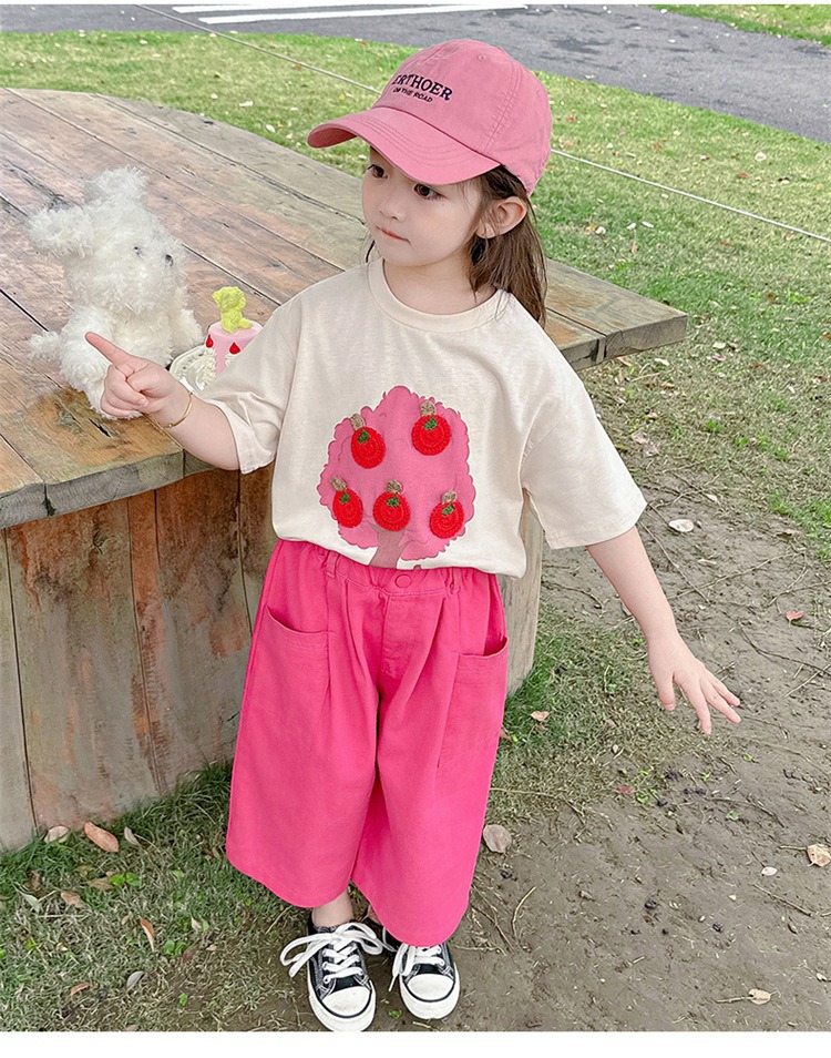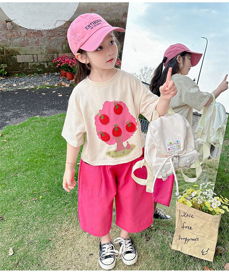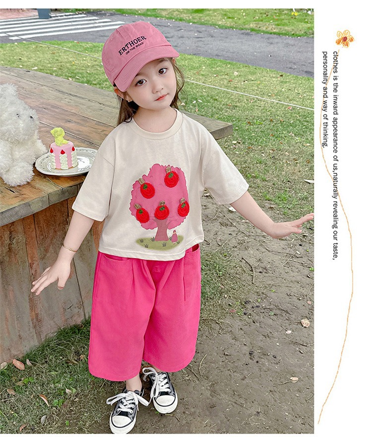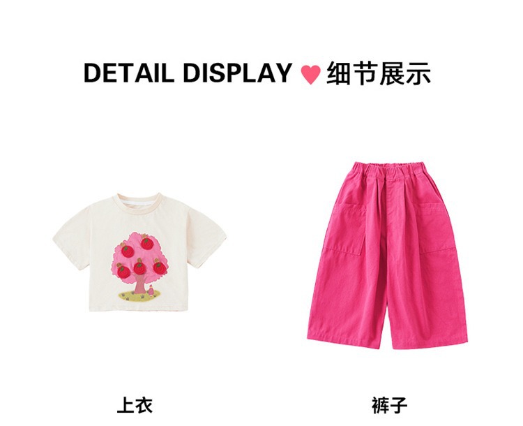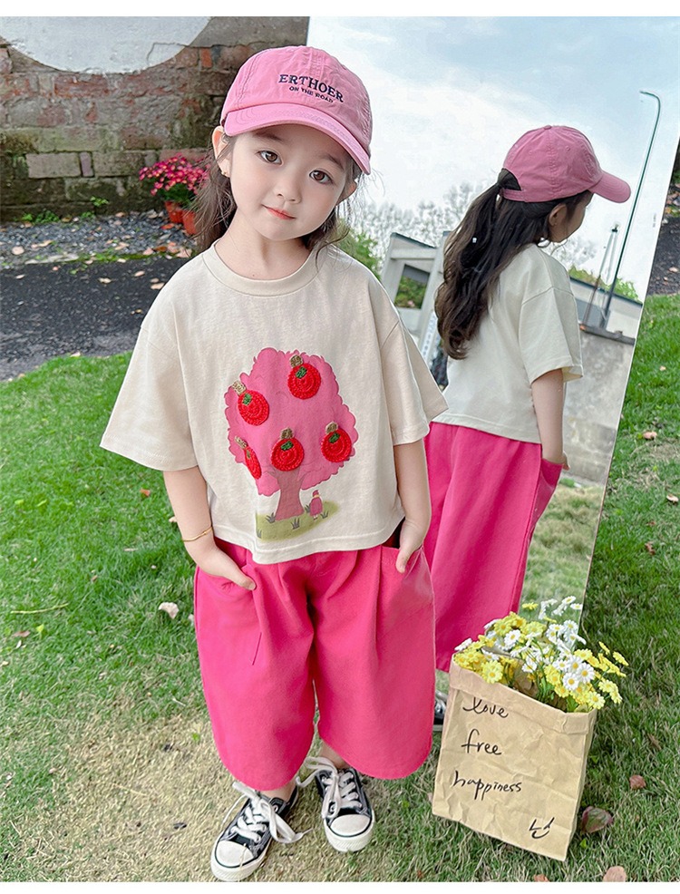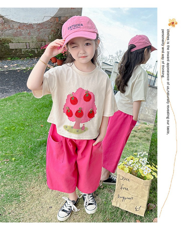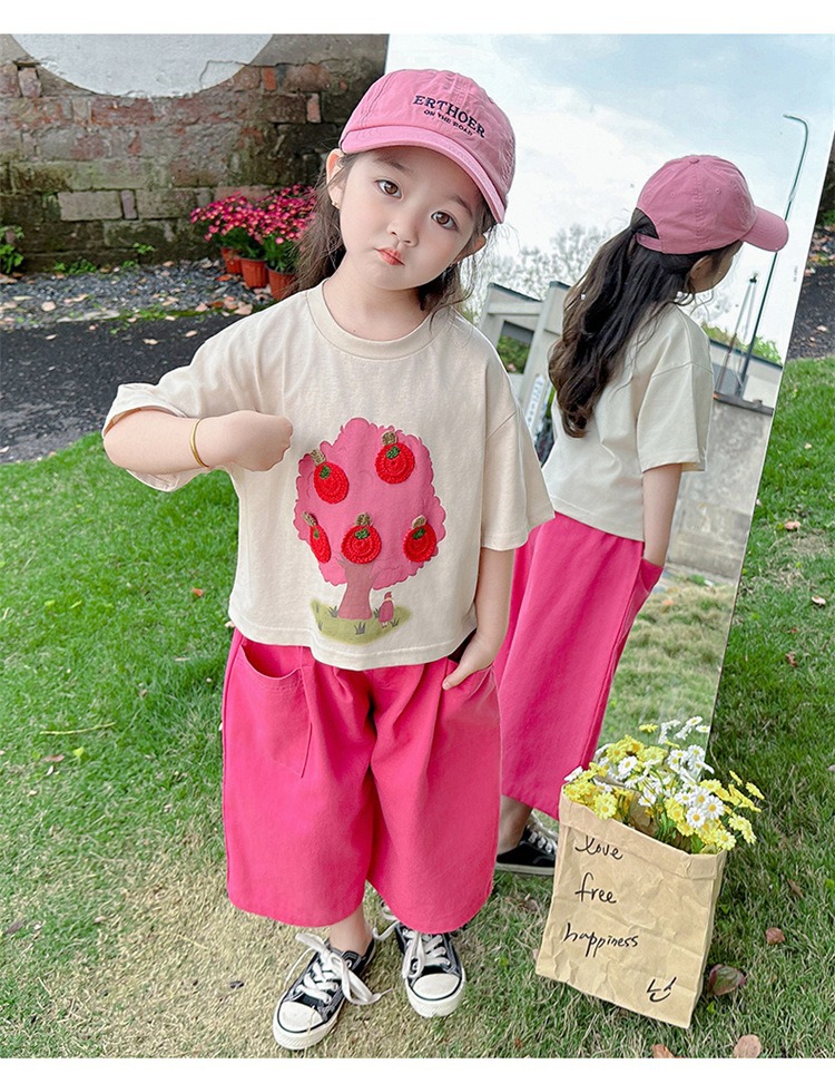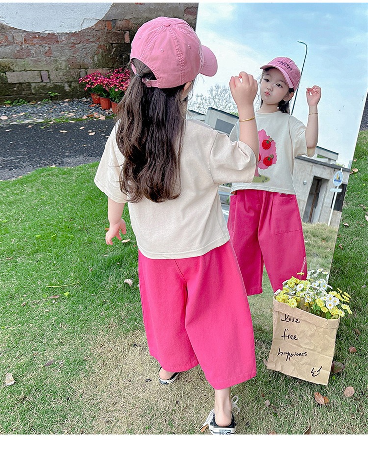 童洛萌女童夏季纯棉短袖套装t恤阔腿休闲工装裤时尚洋气两件套100-160