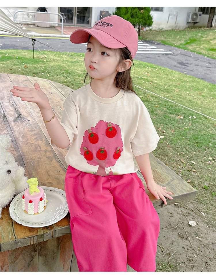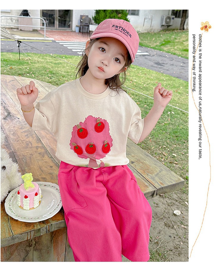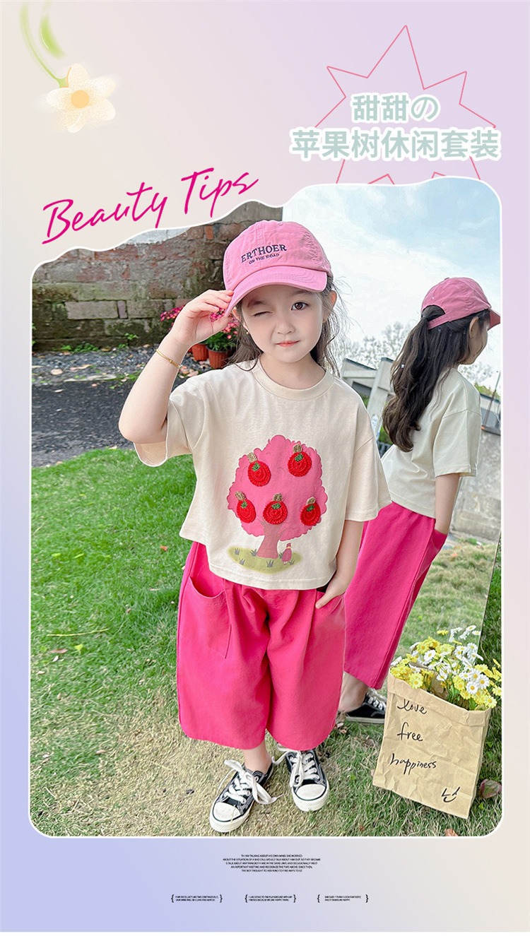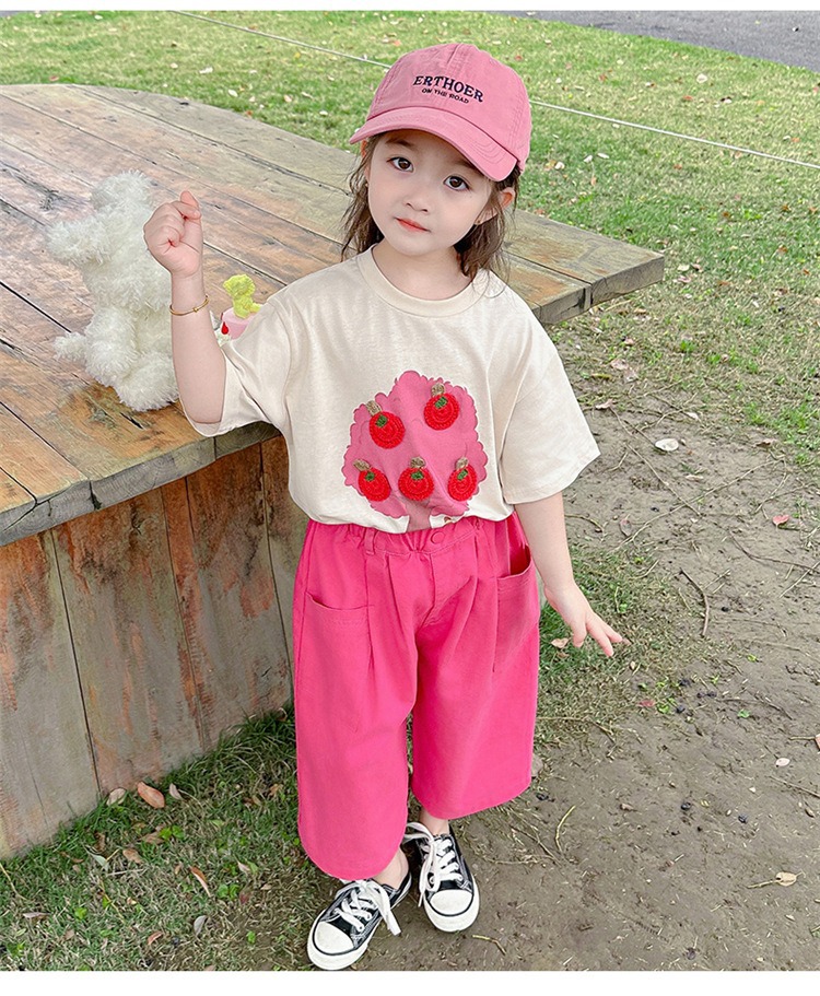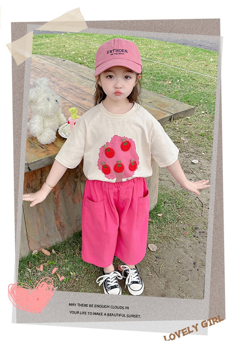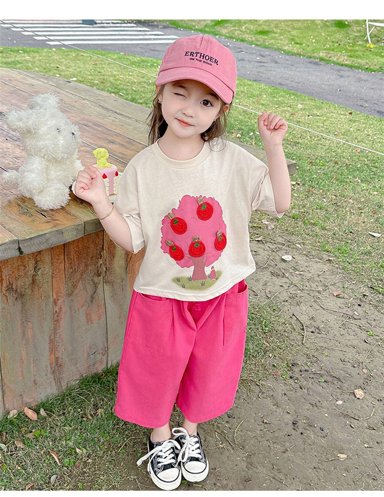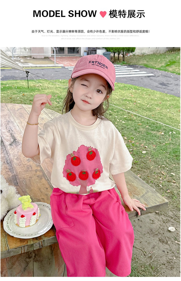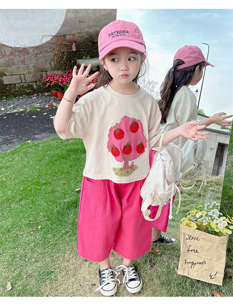 童洛萌女童夏季纯棉短袖套装t恤阔腿休闲工装裤时尚洋气两件套100-160