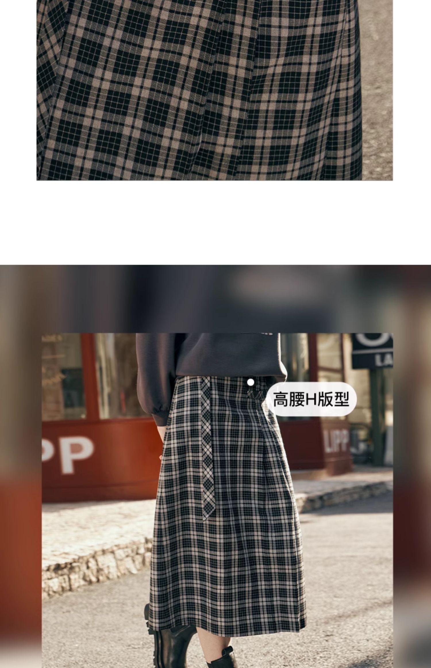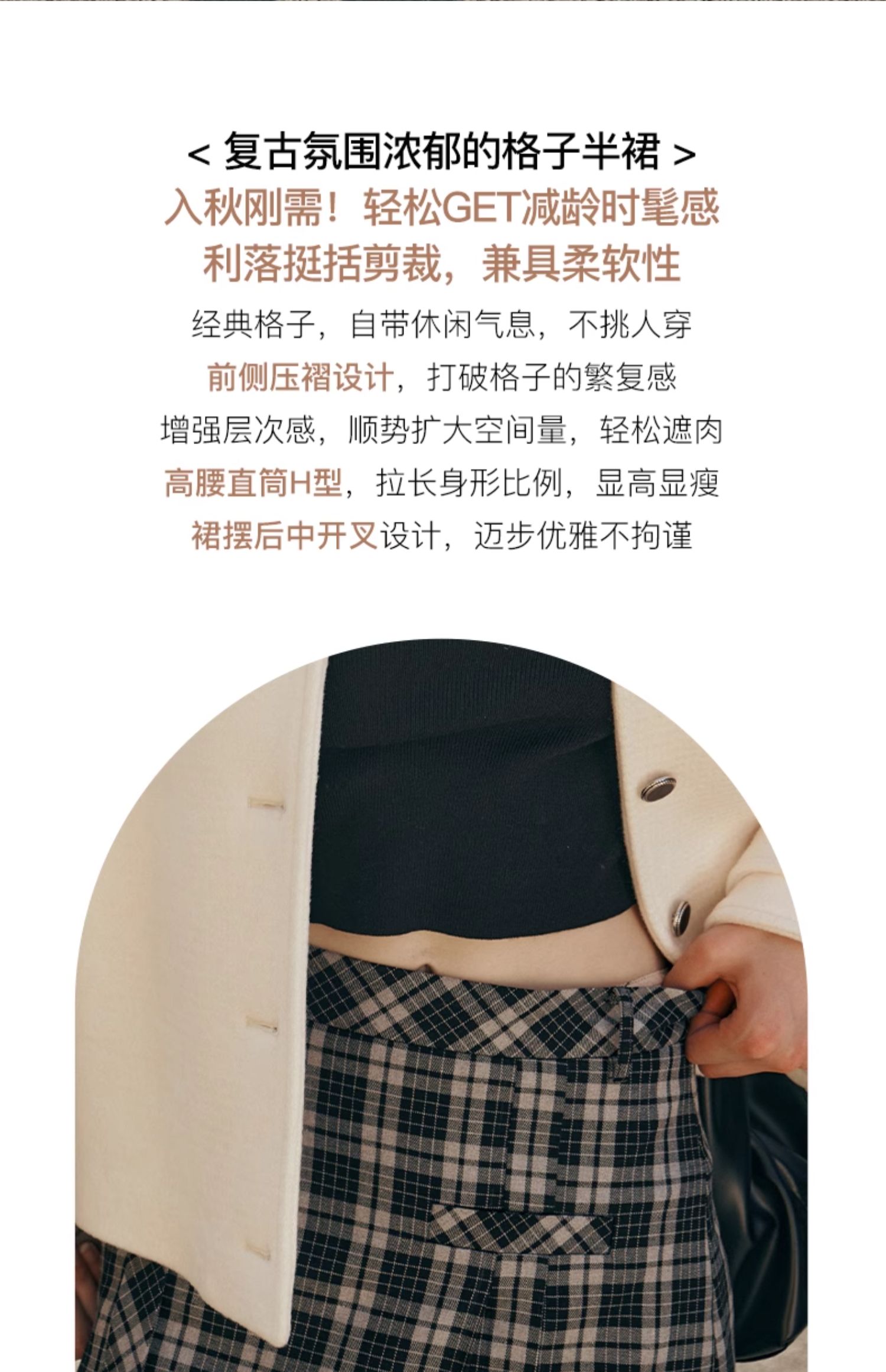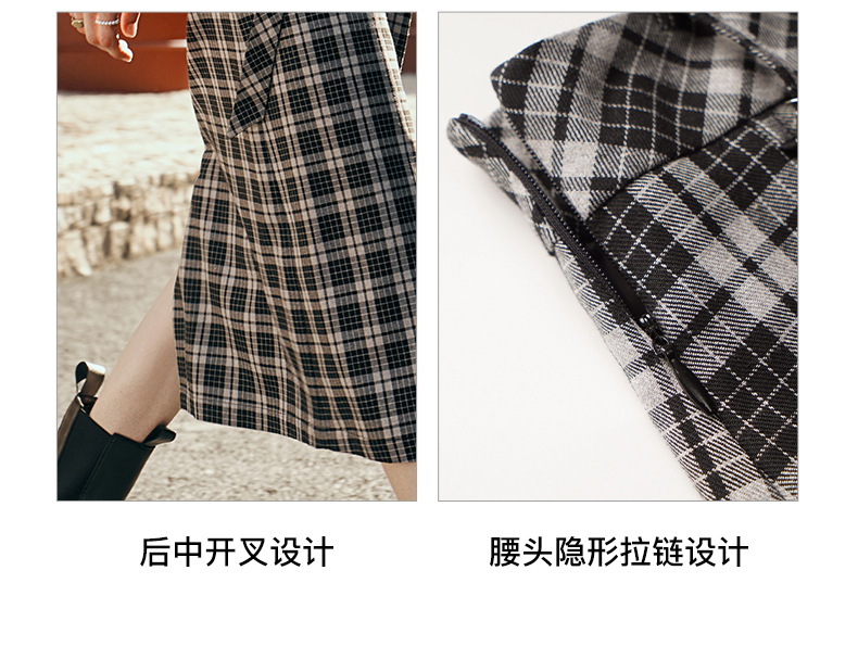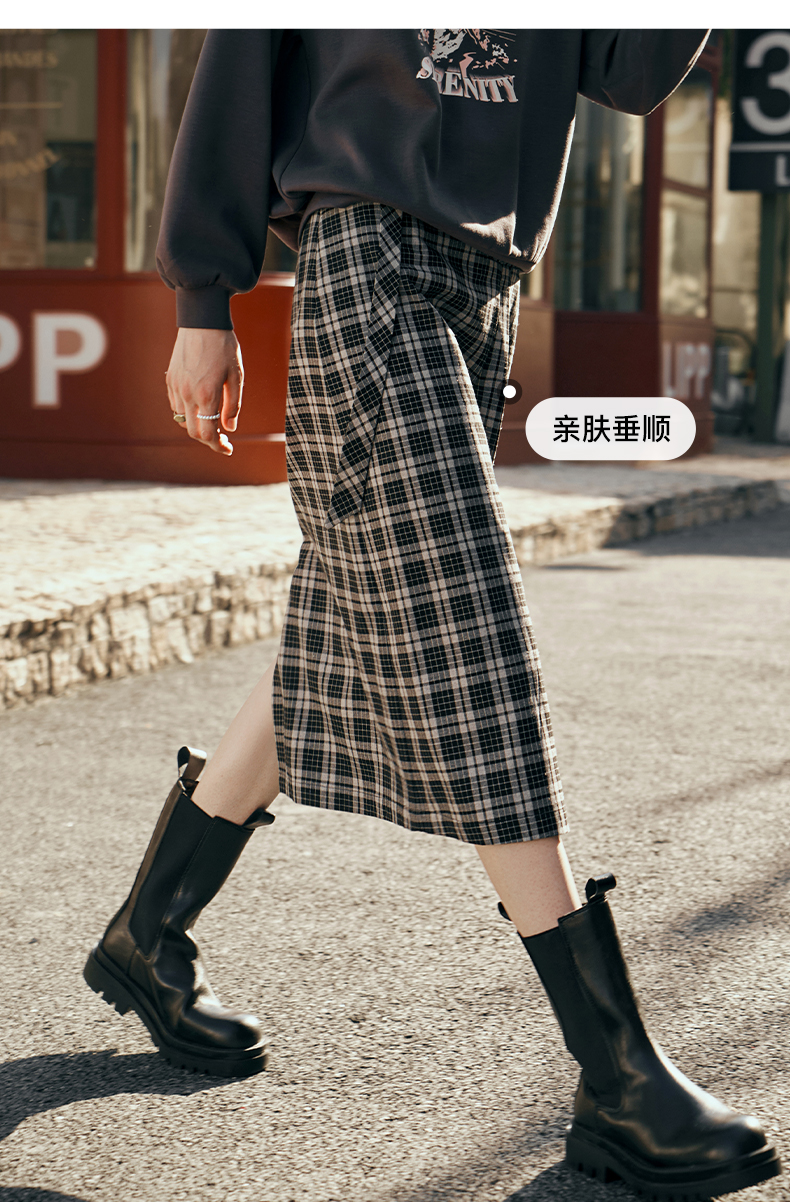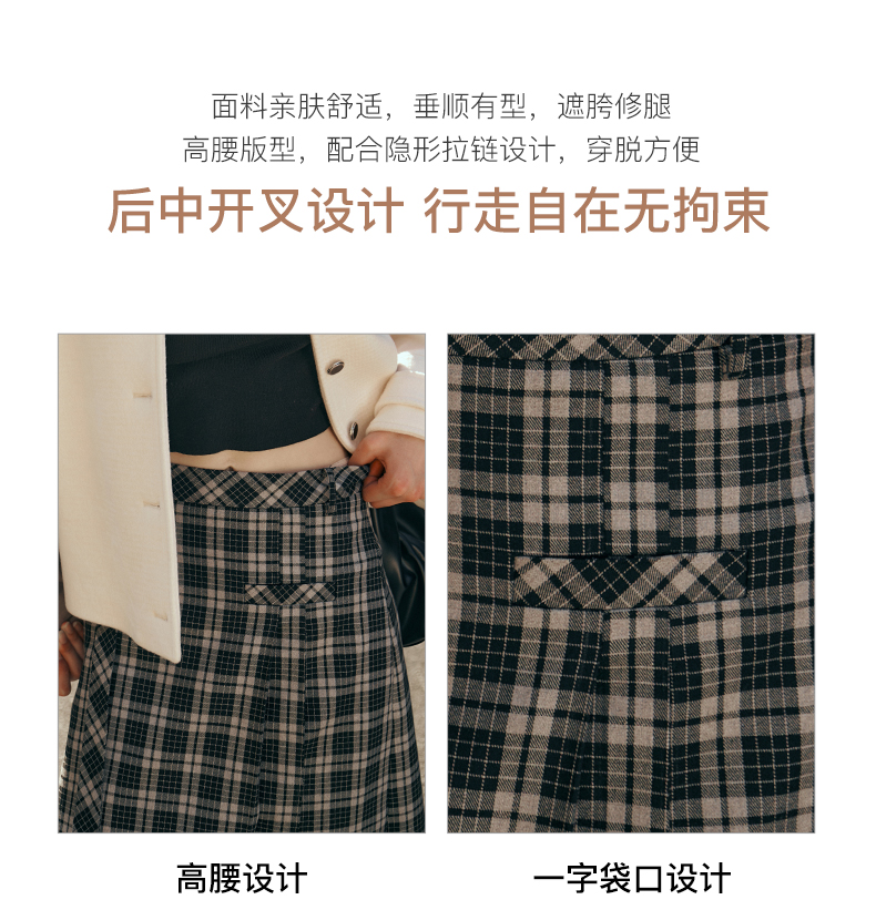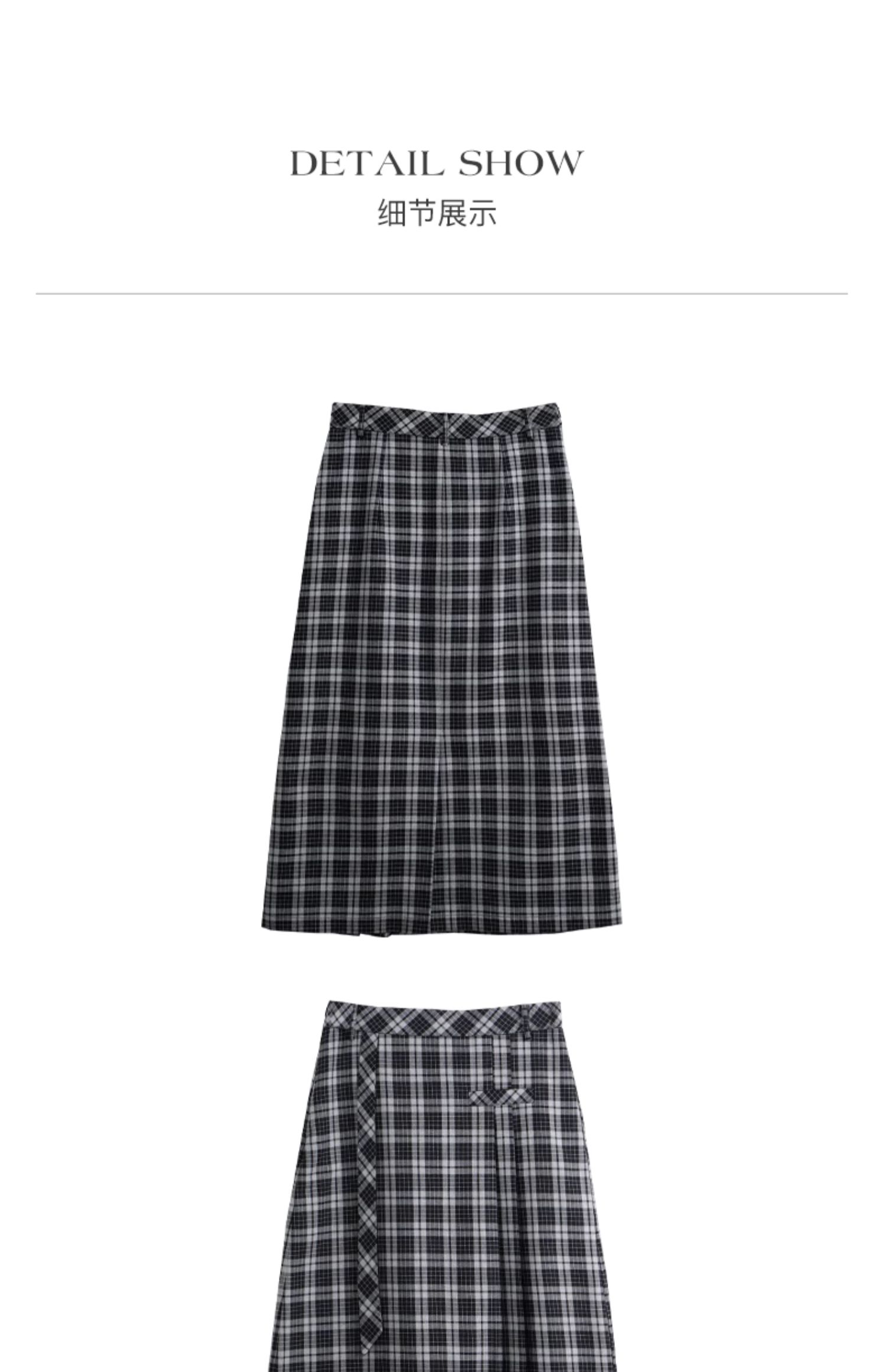 OLrain欧芮儿格子半身裙女秋季2023新款高腰美式复古压褶直筒裙子