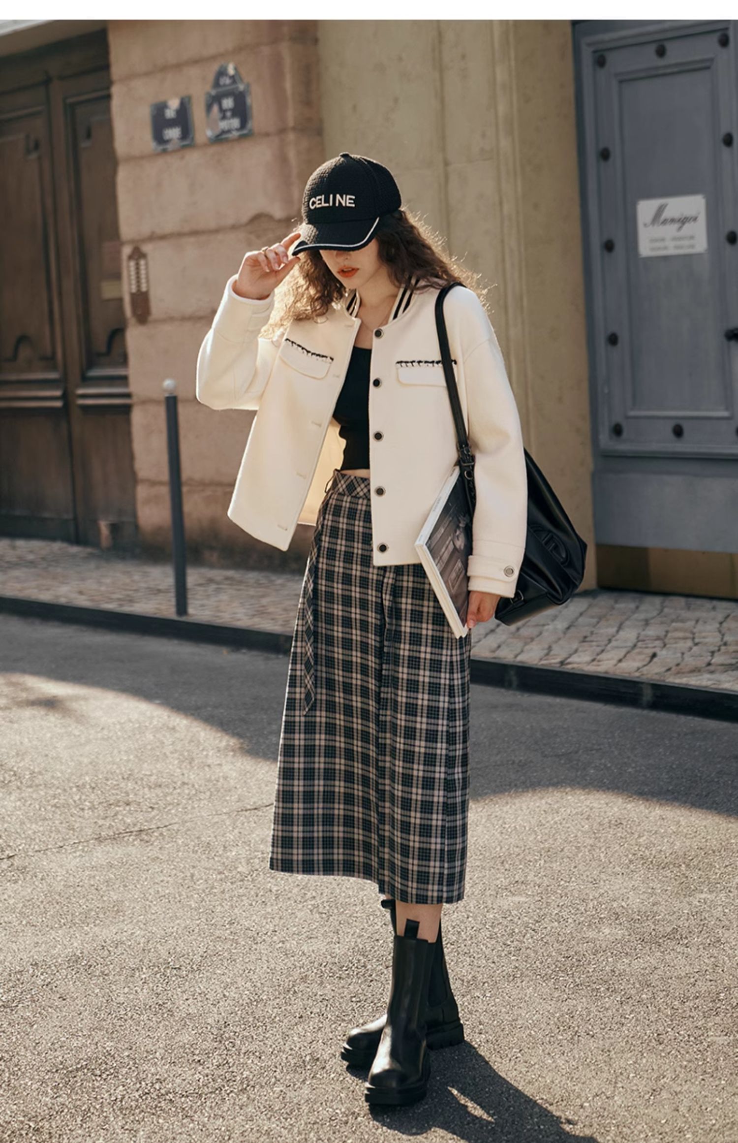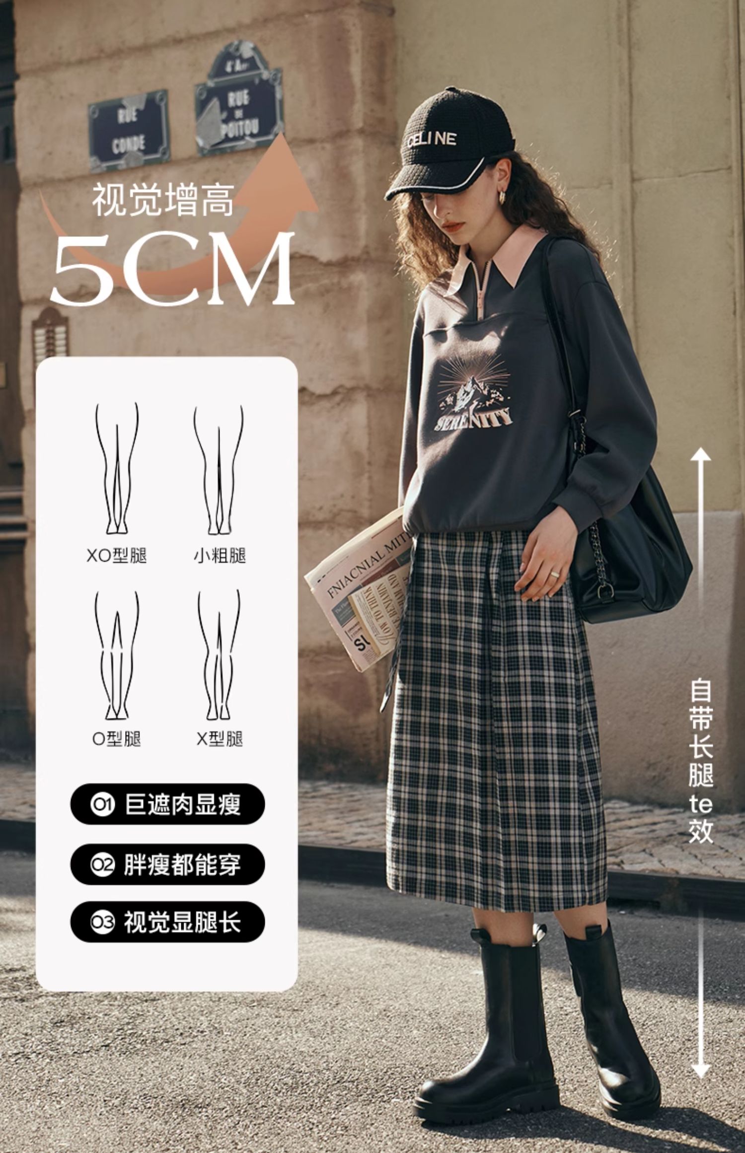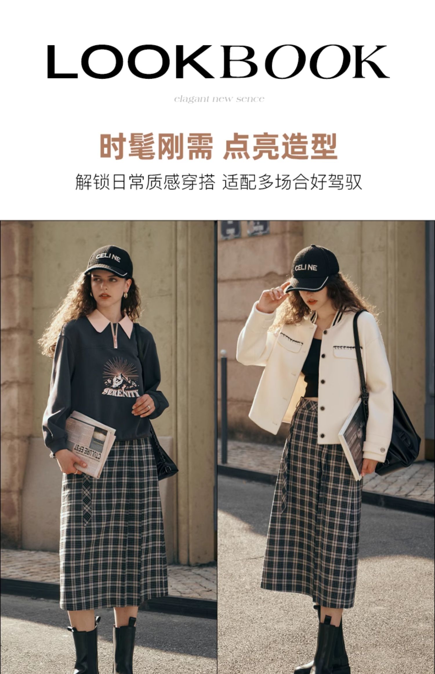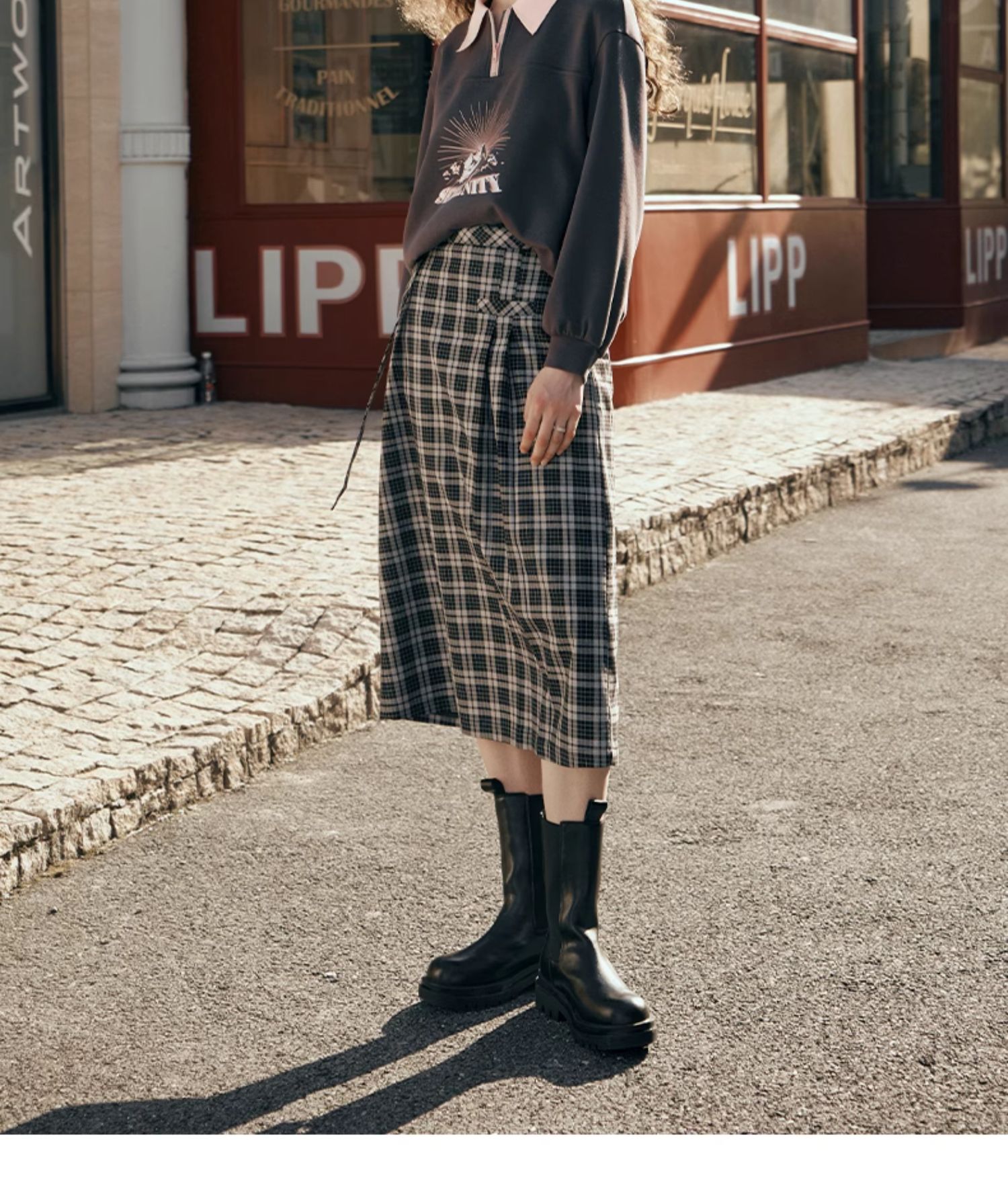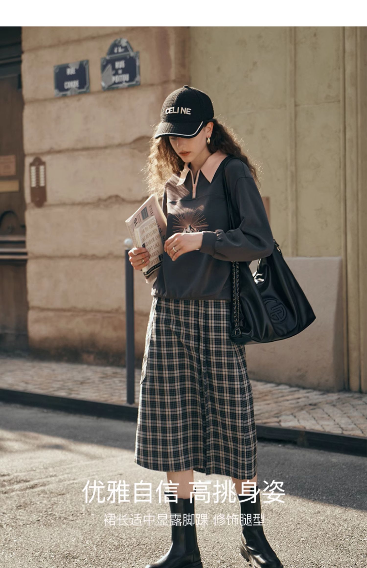 OLrain欧芮儿格子半身裙女秋季2023新款高腰美式复古压褶直筒裙子