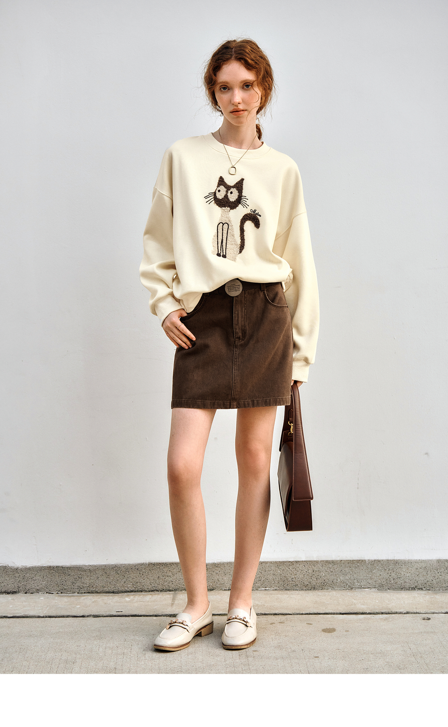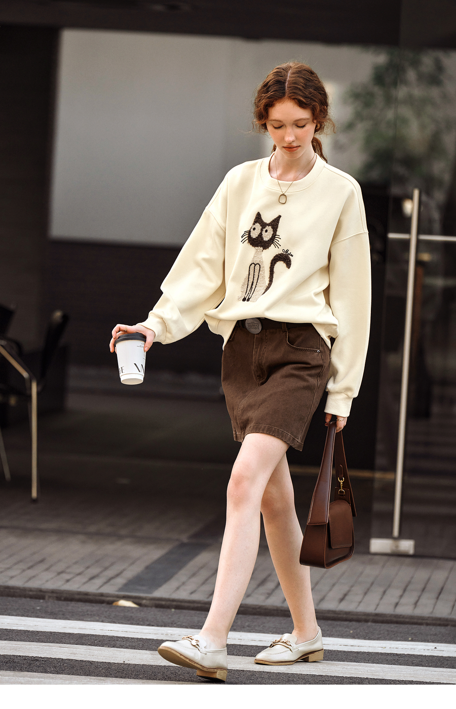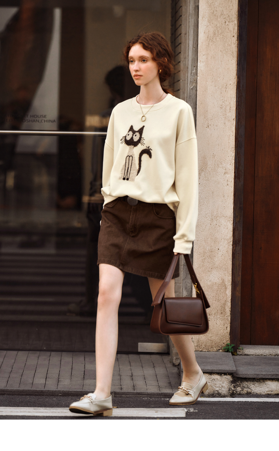 OLrain欧芮儿休闲趣味猫咪印花圆领长袖T恤女秋季2025年新款上衣