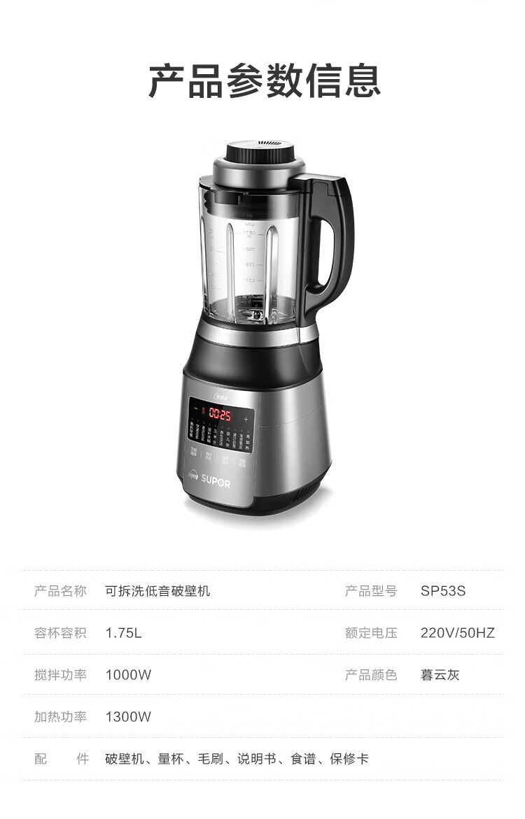 苏泊尔 ZMD安心系列 破壁机 低音破壁家用智能预约加热破壁料理机 榨汁机豆浆机绞肉机搅拌机辅食机SP53S