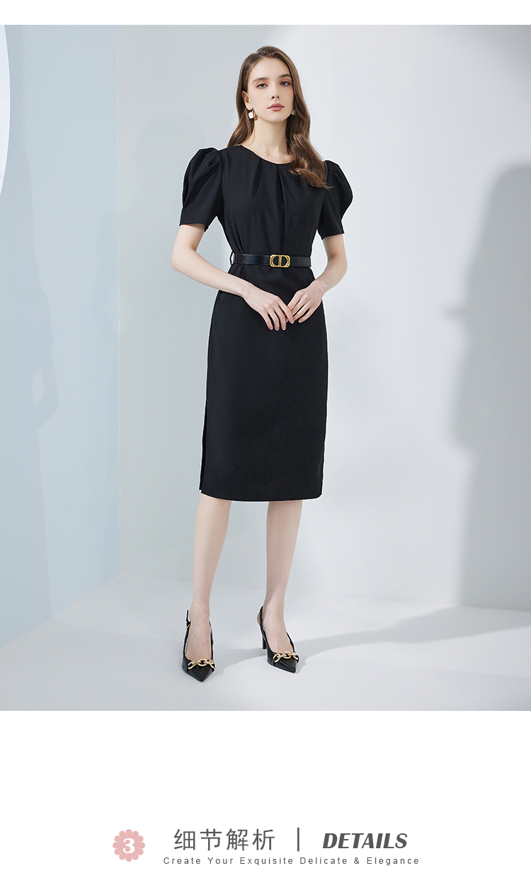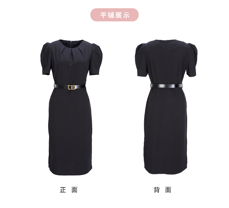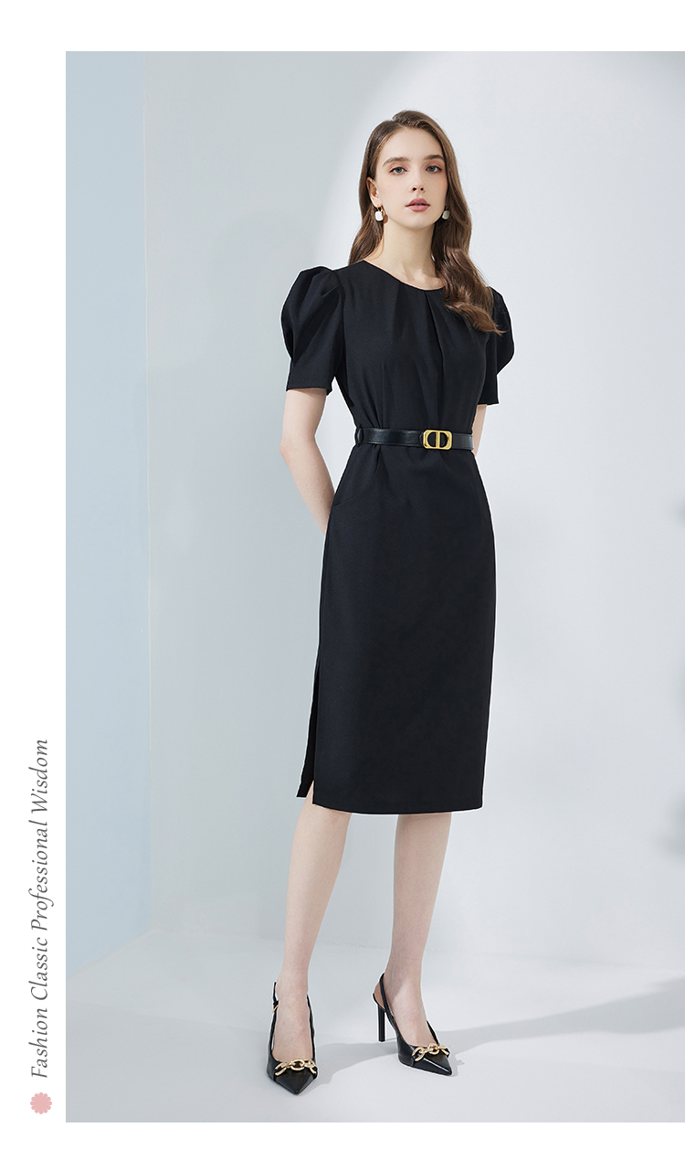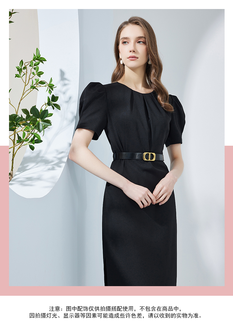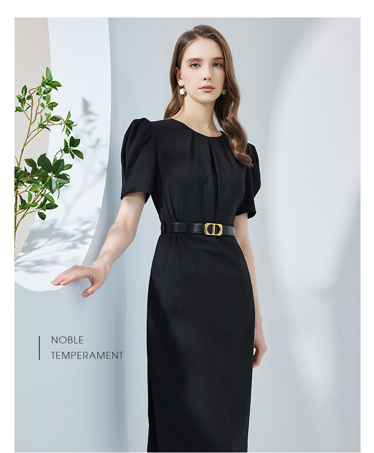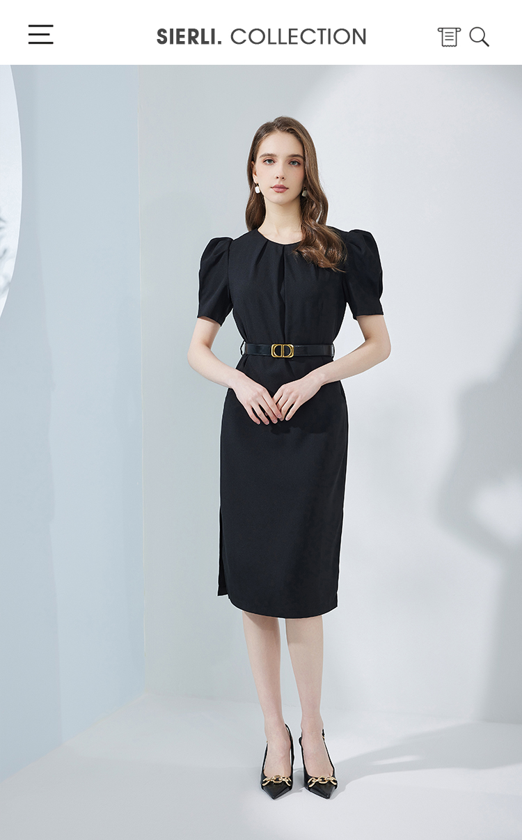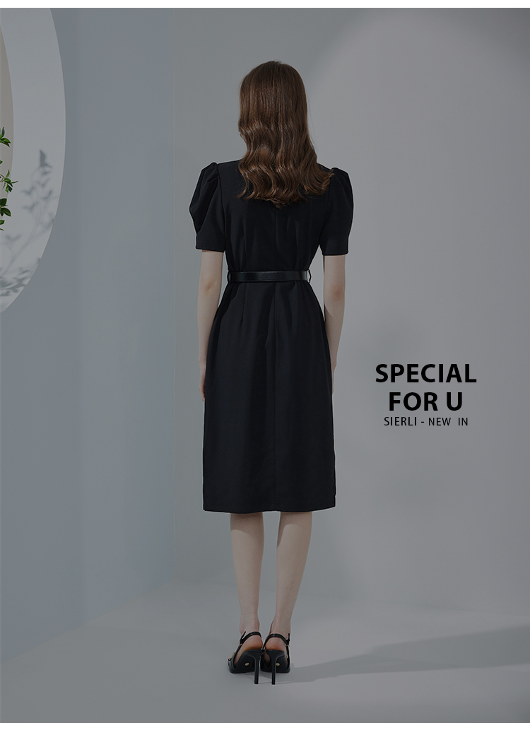 NF8F9斯尔丽瑟俪2023夏季新款领口收褶中长款搭配腰带名媛OL职场连衣裙