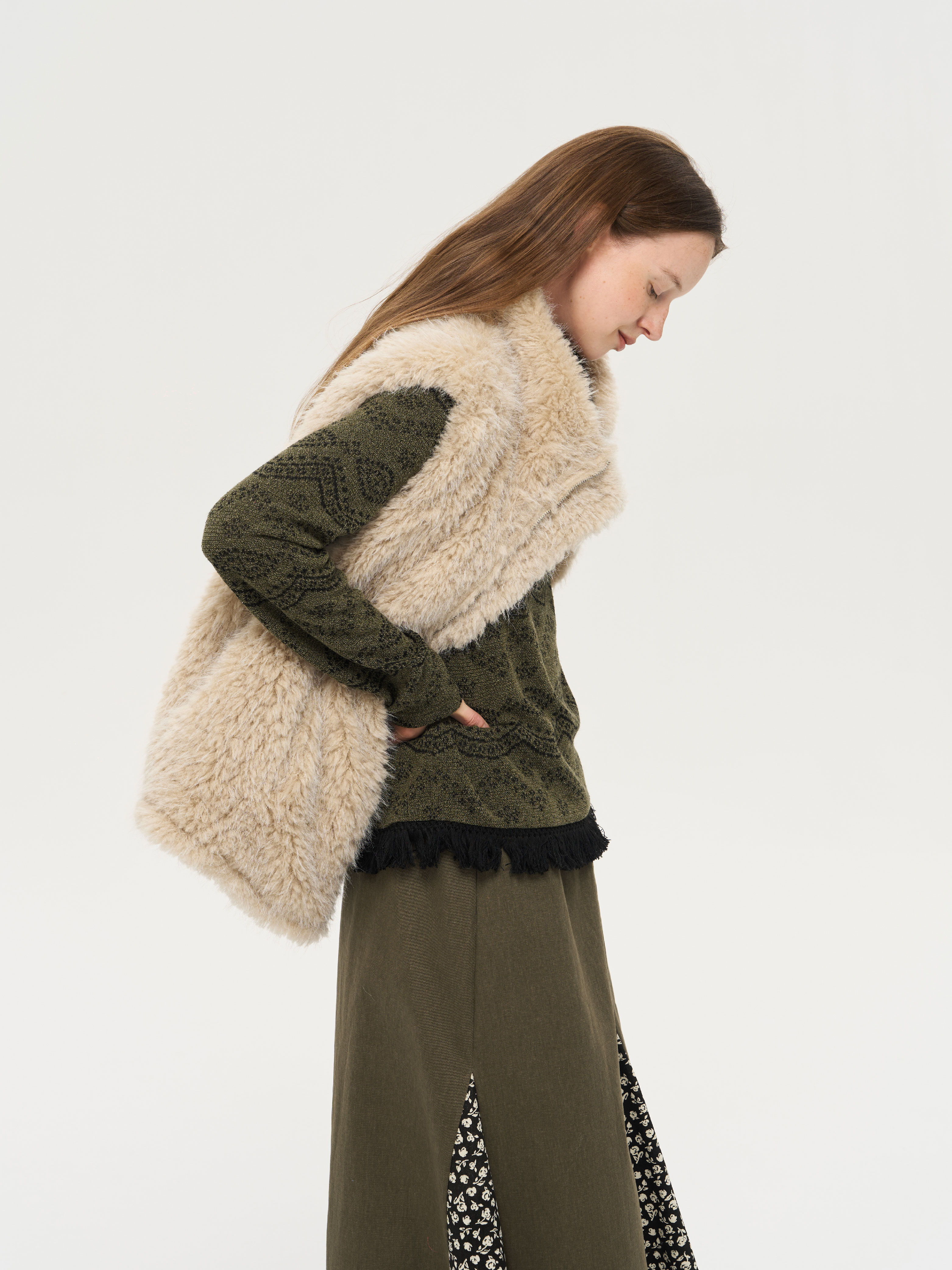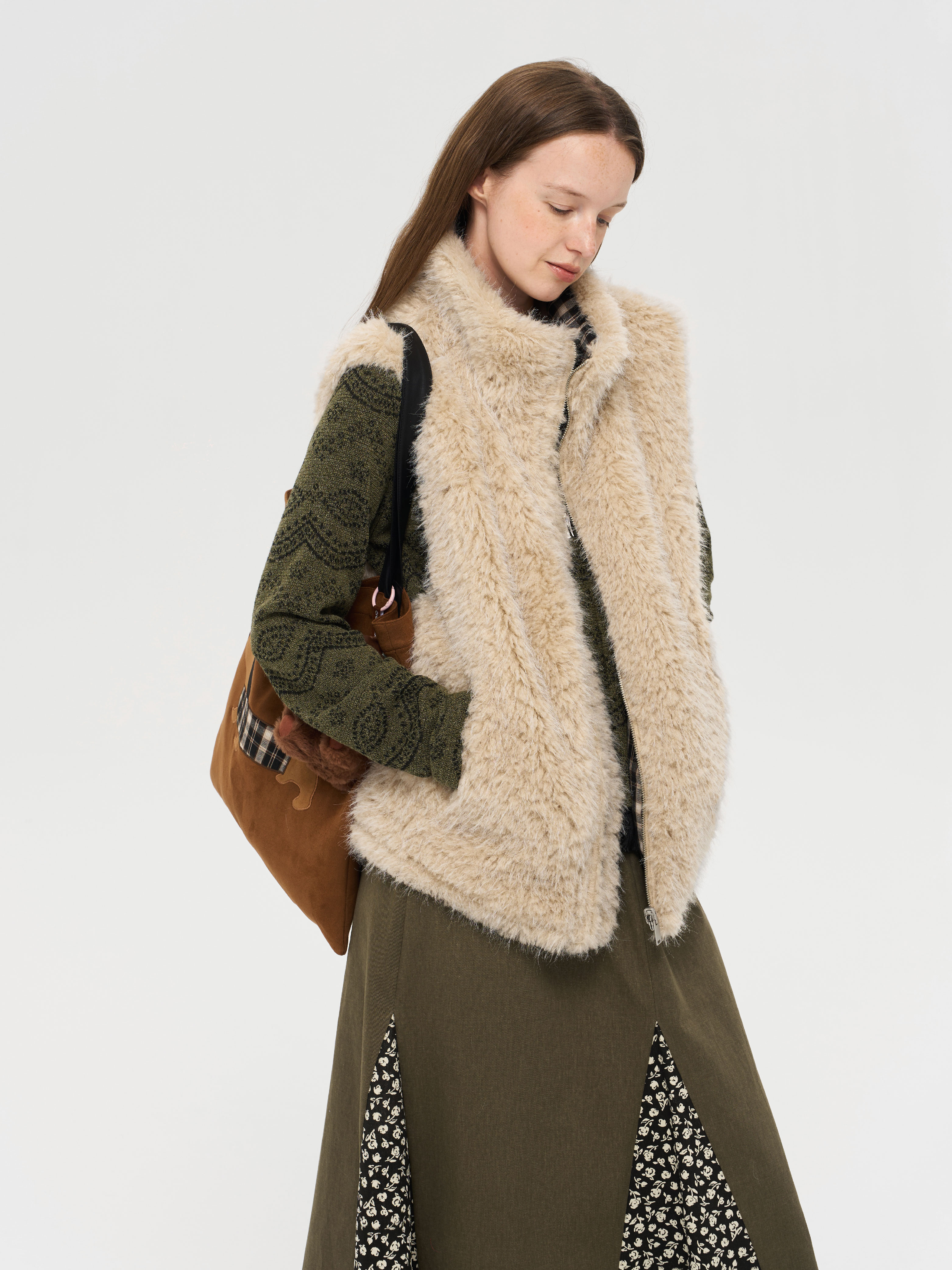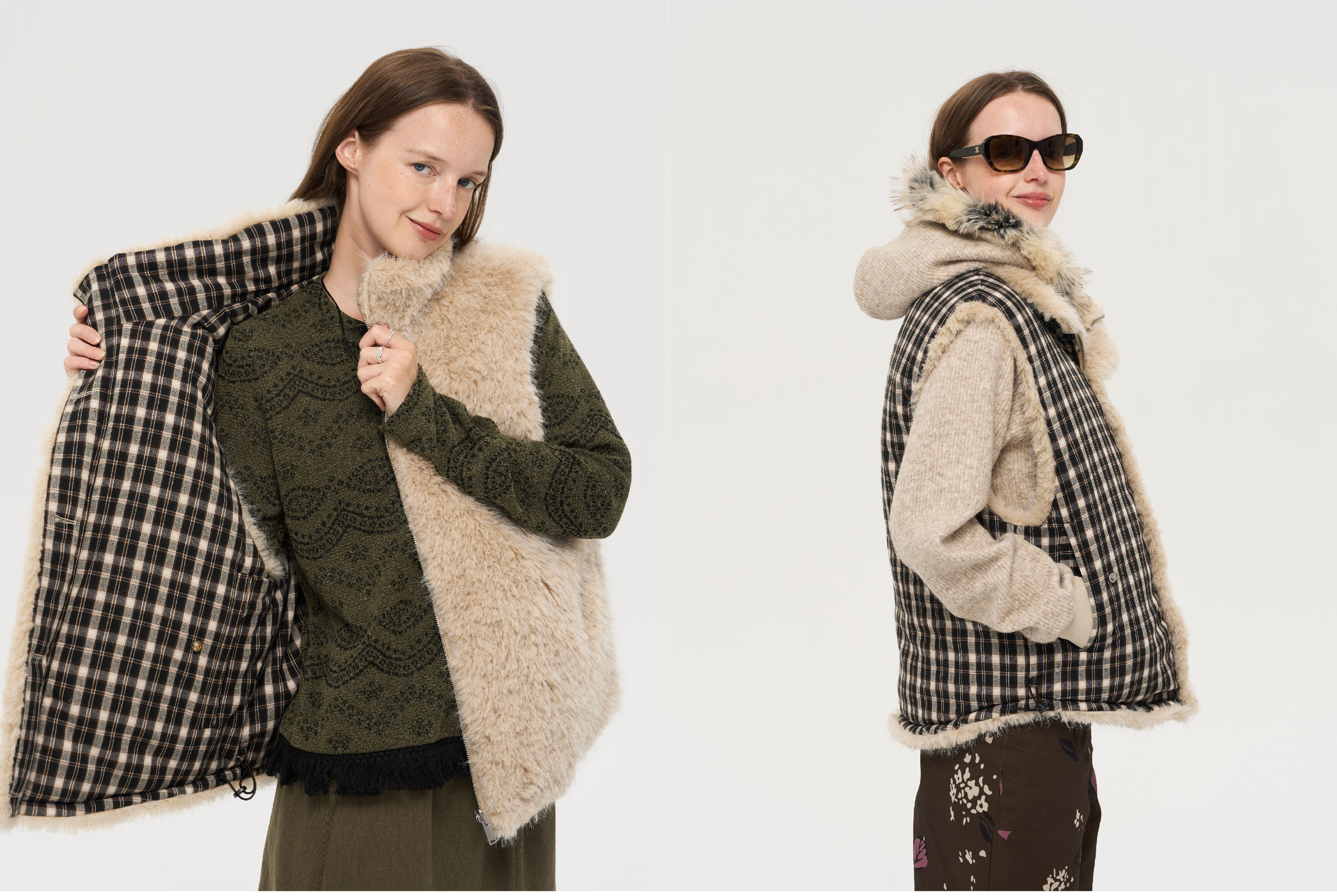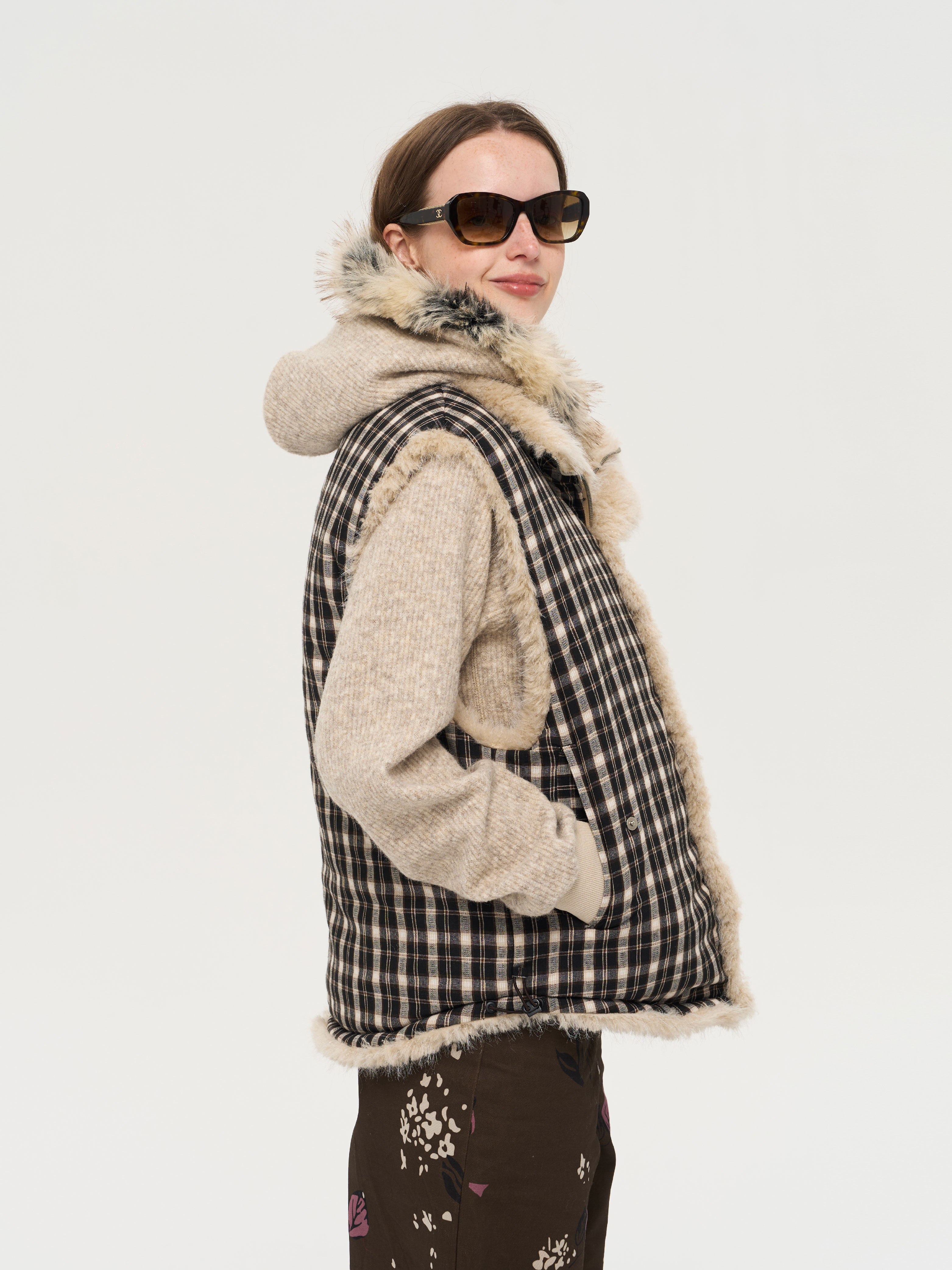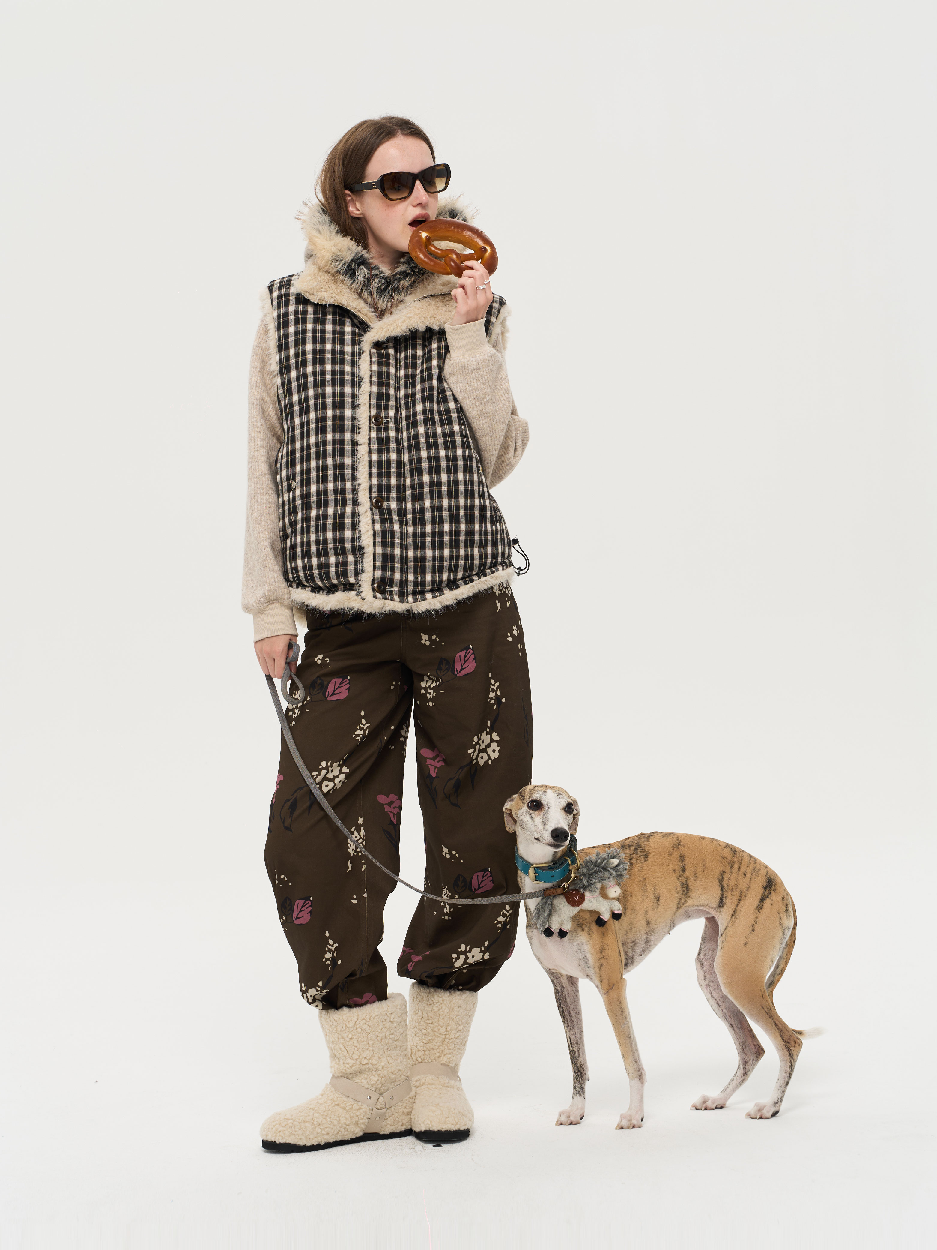 local tag/lt25awk53/雪地旅行日 松软毛绒搭配色织格纹夹棉双面马甲