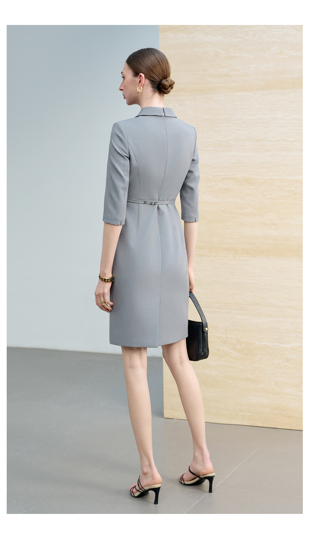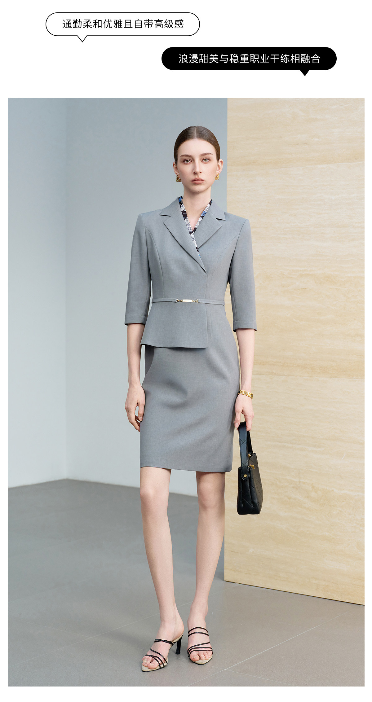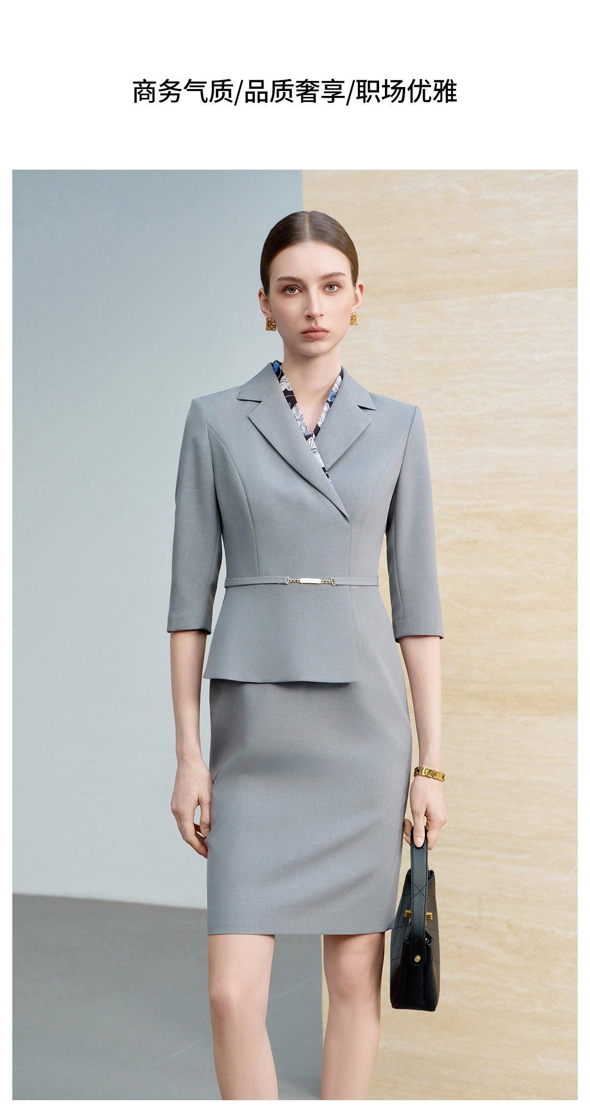 IWY/气质灰色七分袖西装连衣裙女假两件高级感职业装通勤工作服6Q08