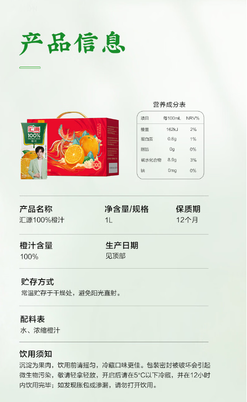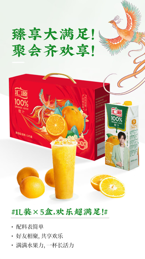 【清凉节】汇源100%果汁橙汁1Lx5盒浓缩果汁饮料整箱礼盒装礼盒