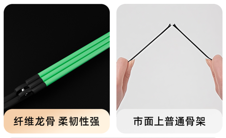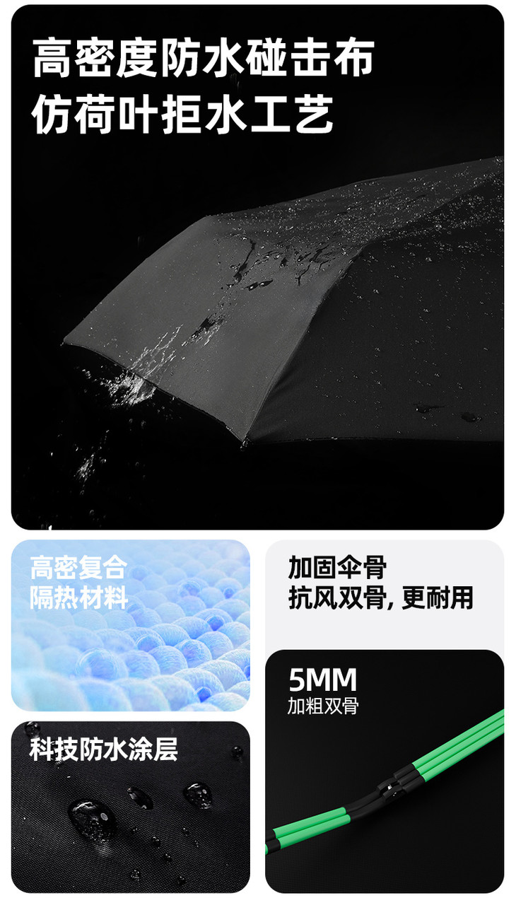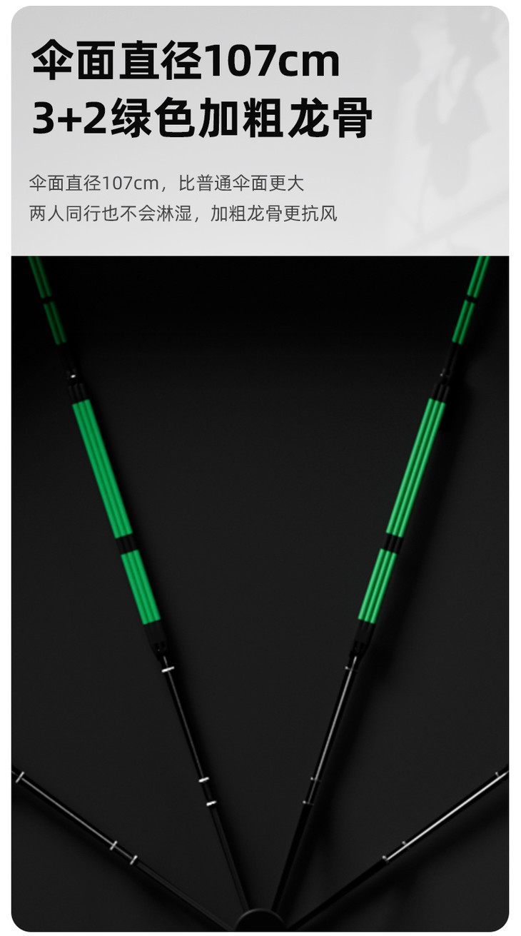 ✅3+2绿色加粗龙骨龙骨设计+双线缝合工艺,抗风能力MAX 伞骨采用轻质航空铝合金材质材质本身就不生锈、不易变形再加上双龙骨设计,韧性更高、结实耐用 ,坚固耐用可以扛得住大风,风雨再大也能稳稳守护你