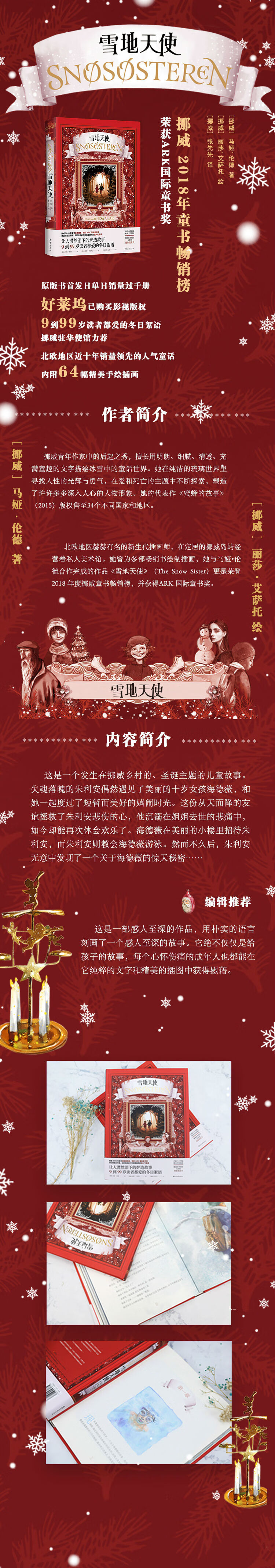 《雪地天使》是挪威青年作家露娜•伦德和丽莎•艾萨托共同创作的童话故事。书中附有大量由丽莎手绘的满版插图。露娜•伦德是挪威青年作家中的后起之秀,她与插画师丽莎•艾萨托的代表作《雪地天使》(The Snow Sister)是2018年挪威蕞畅销的作品,二人合作的多部作品均获得ARK国际童书奖。