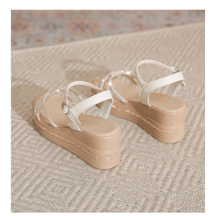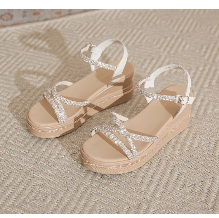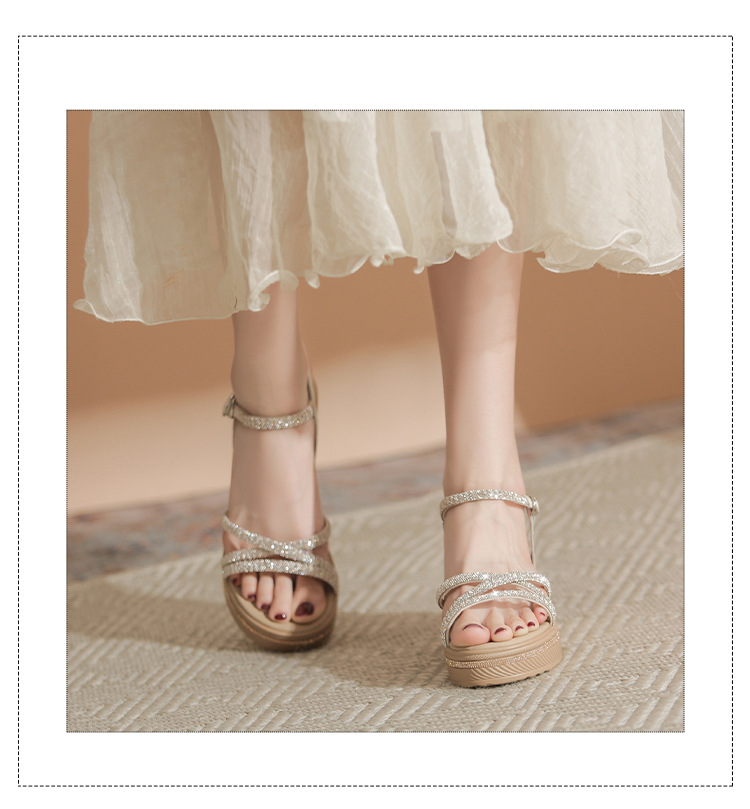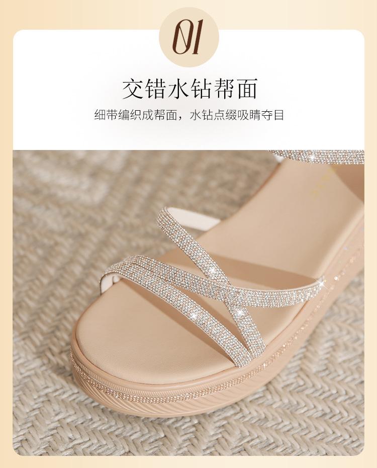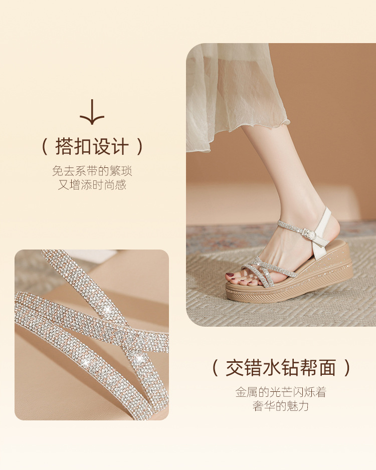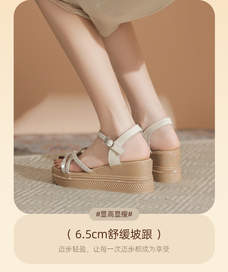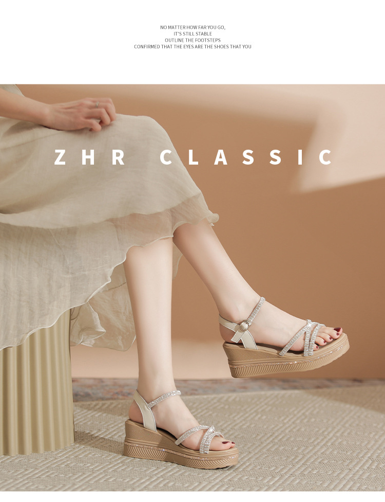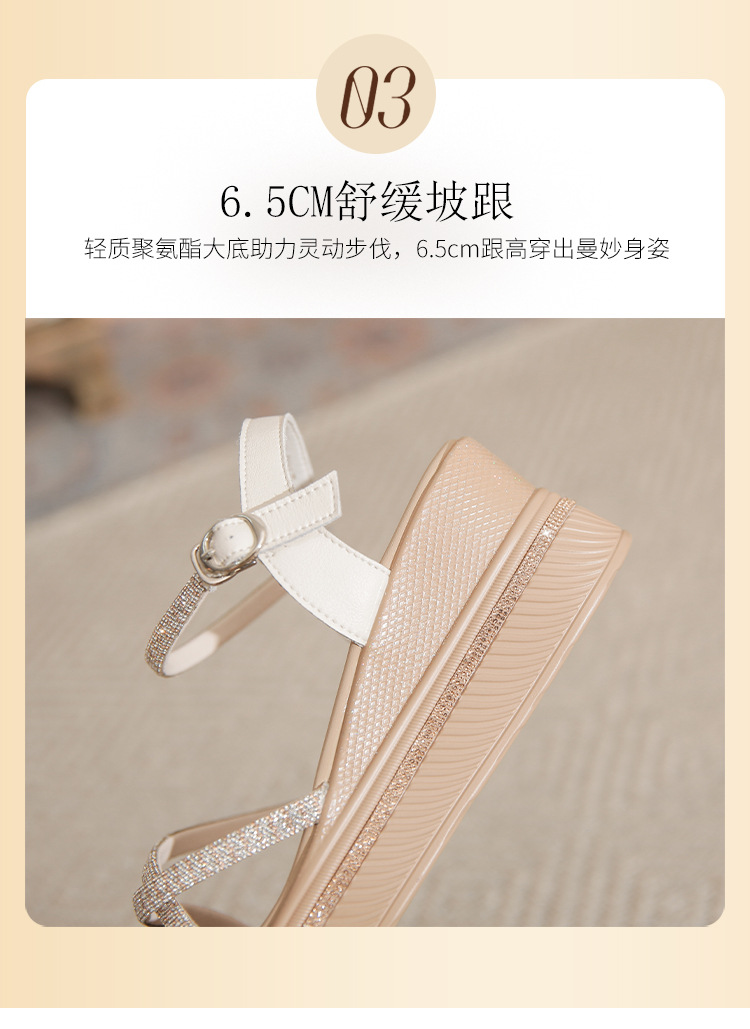 ZHR夏季坡跟水钻凉鞋2024夏季新款法式厚底外穿一字带女鞋配裙子