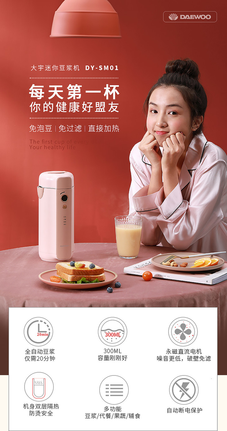 【破壁豆浆机 不留渣无须过滤】韩国大宇迷你破壁豆浆机 不泡豆 免滤渣 一键自动清洗 还能秒变果汁机、料理机