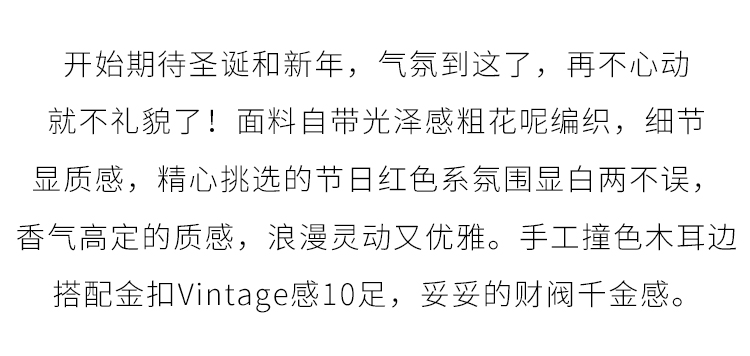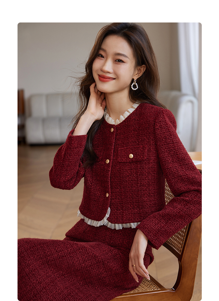 【年货节】熙世界红色小香风短款外套女冬法式粗花呢夹棉上衣半身裙两件套