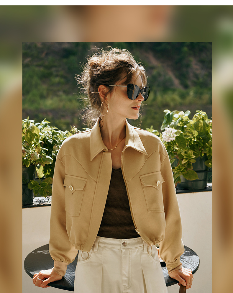 OLrain欧芮儿卡其色短外套女初秋2023新款宽松美式复古工装风上衣