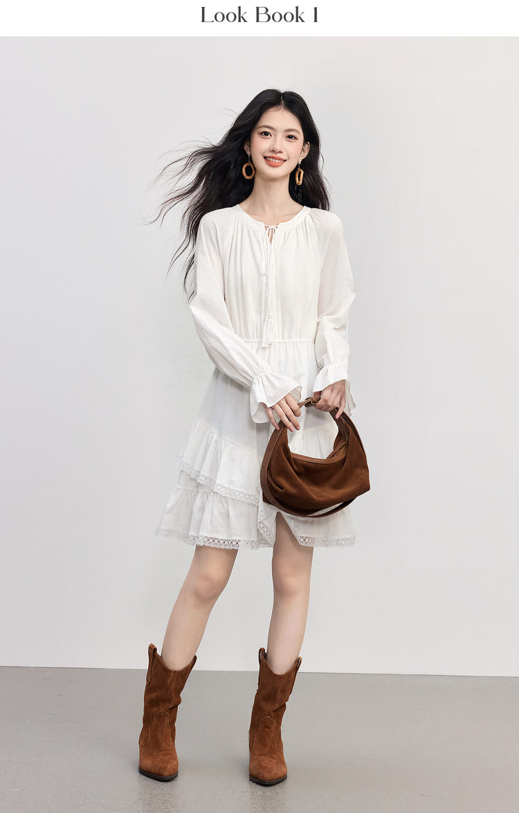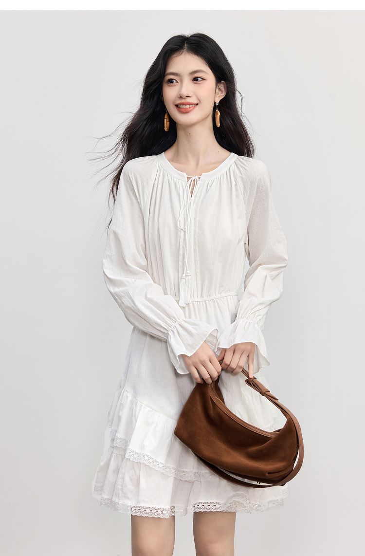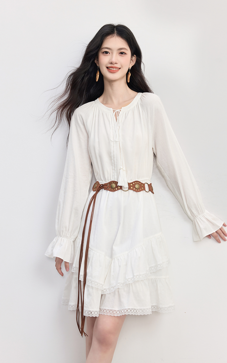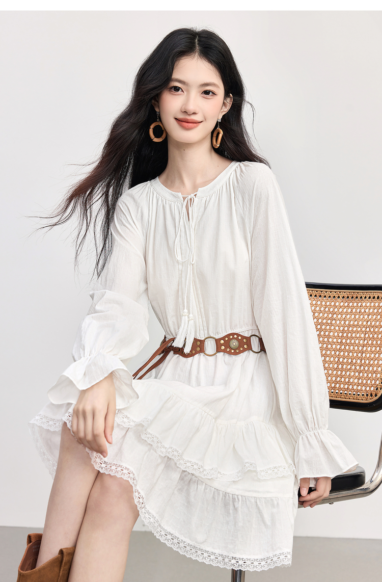 【09/26新品】熙世界法式度假风白色连衣裙女25年秋季气质收腰波西米亚蛋糕裙子