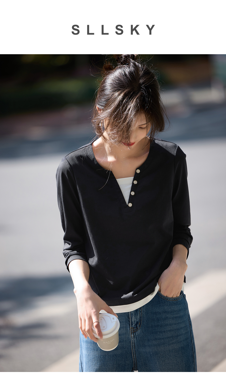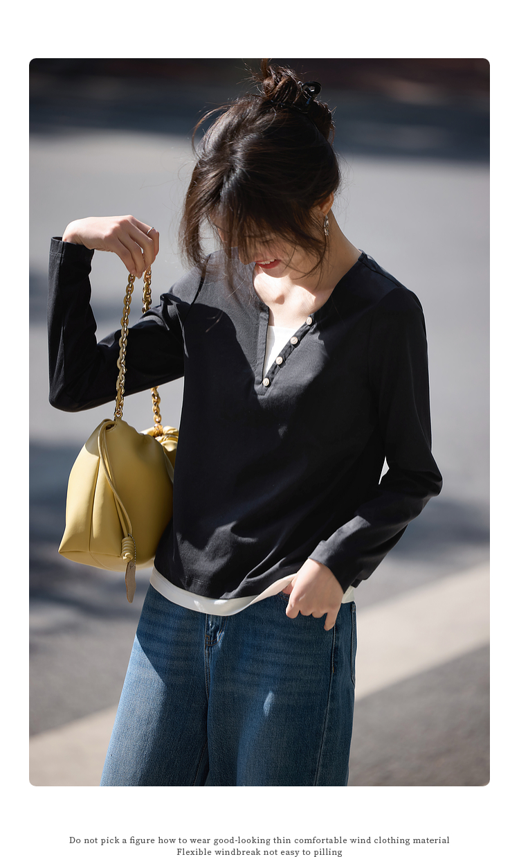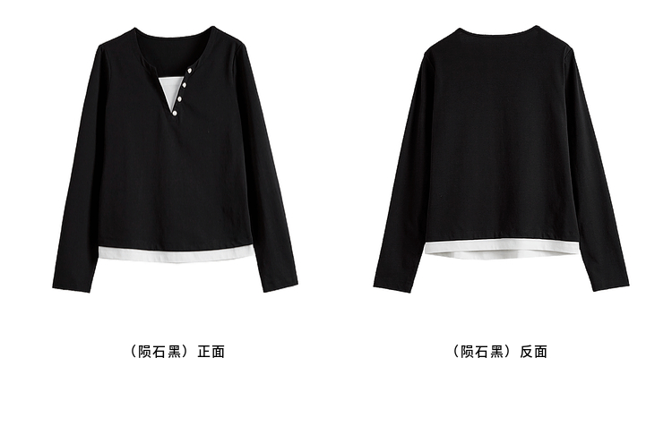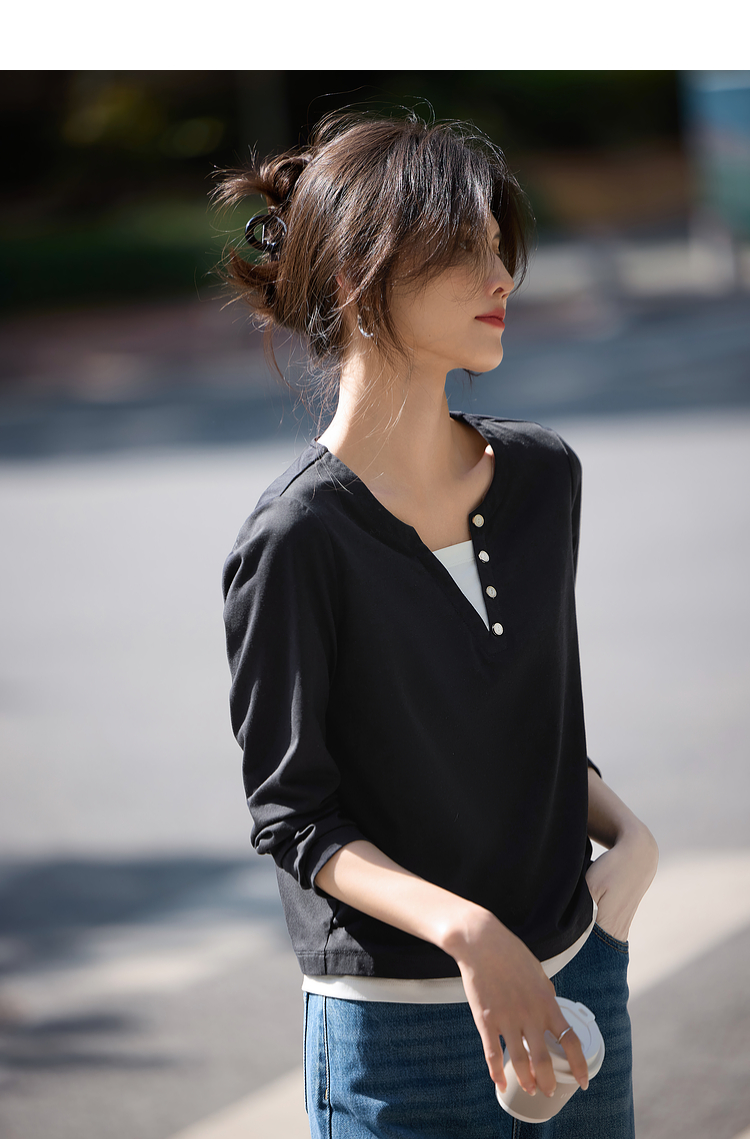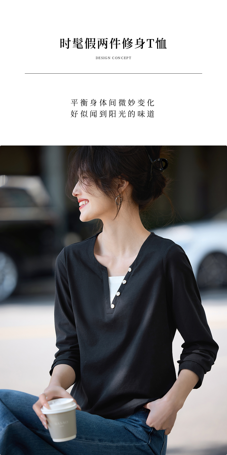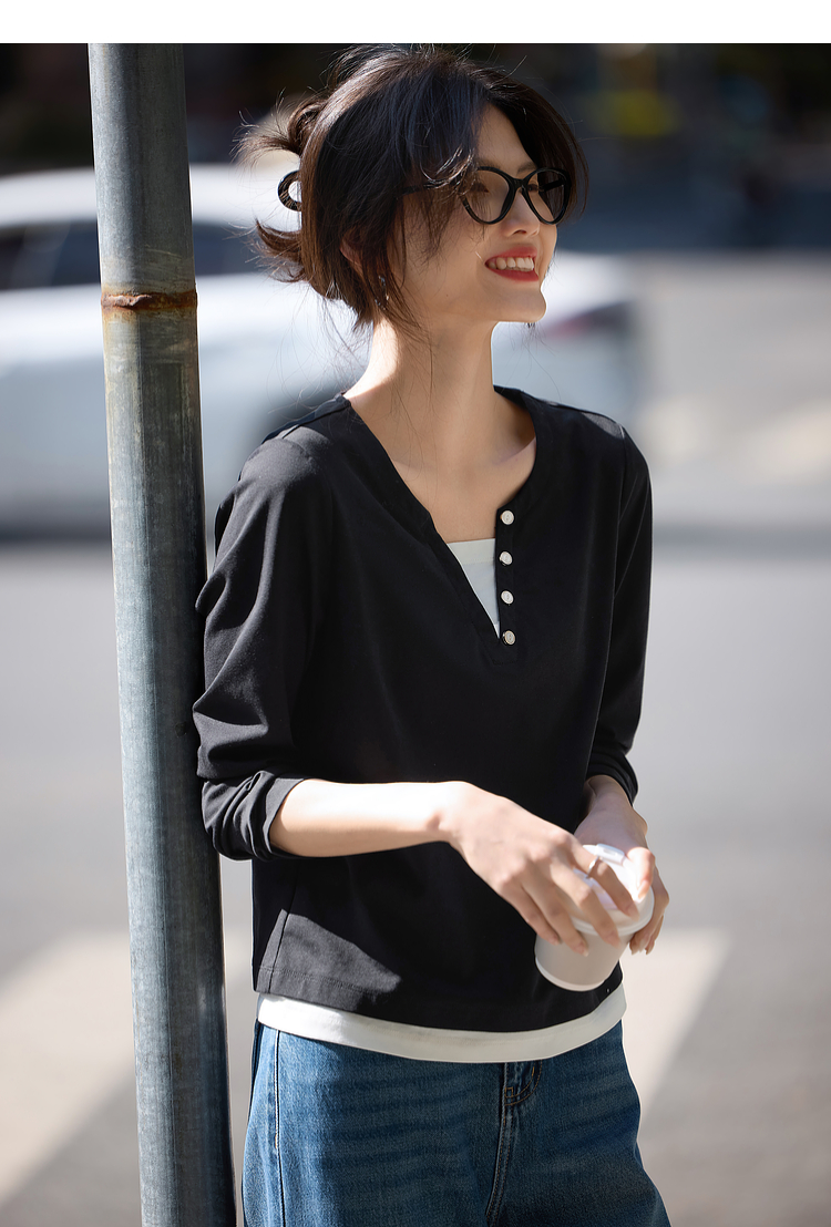 【129选3件,不退换】熙世界黑色长袖T恤春季2025年新款时尚V领设计感叠穿假两件上衣