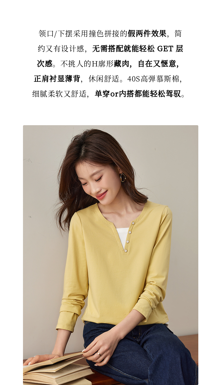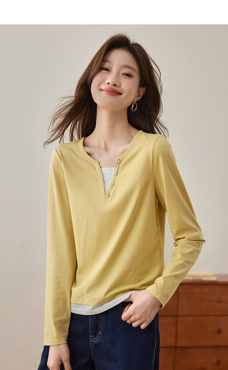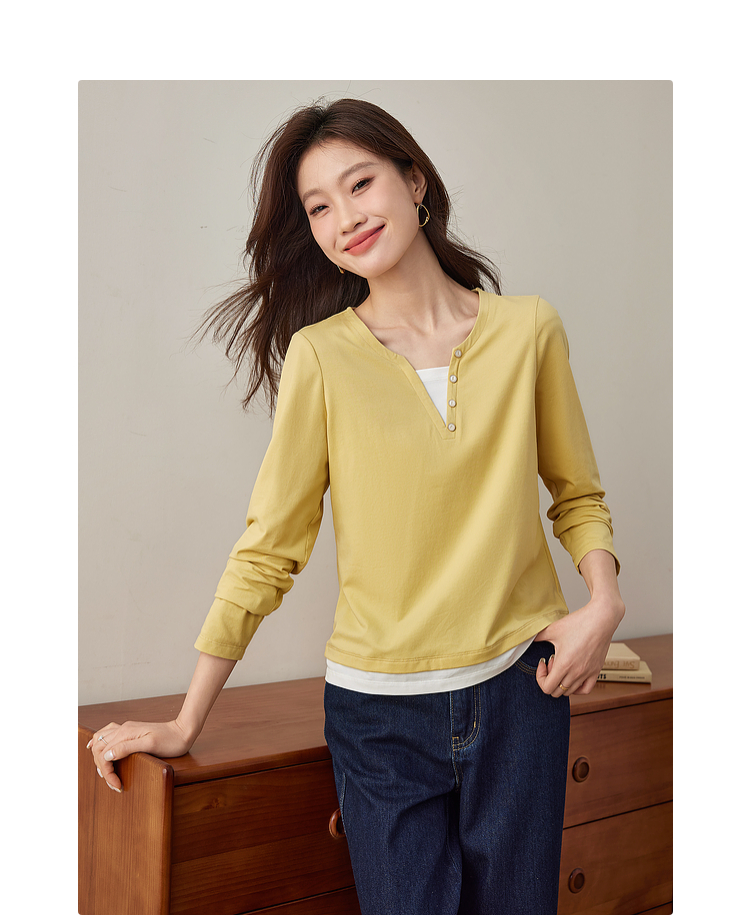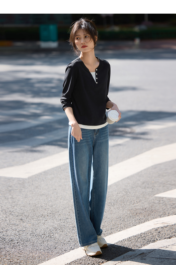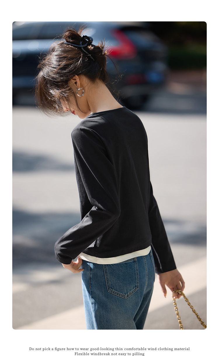 【129选3件,不退换】熙世界黑色长袖T恤春季2025年新款时尚V领设计感叠穿假两件上衣