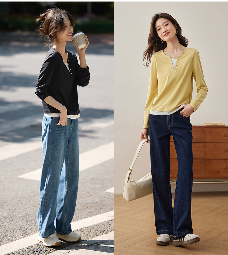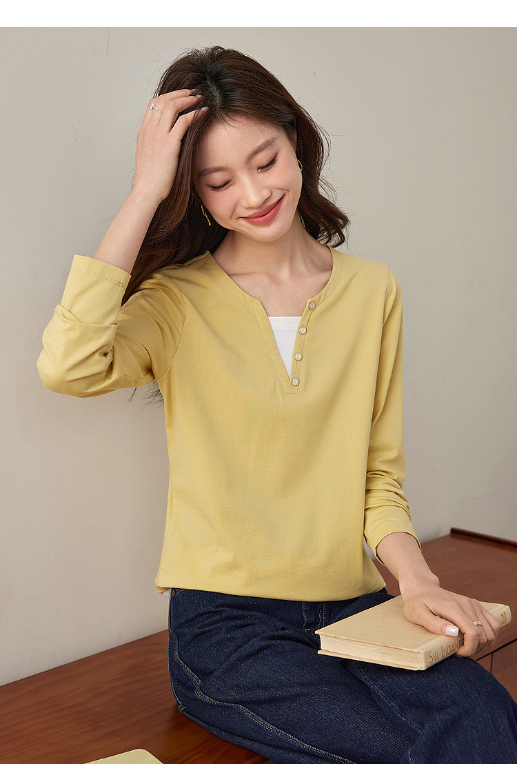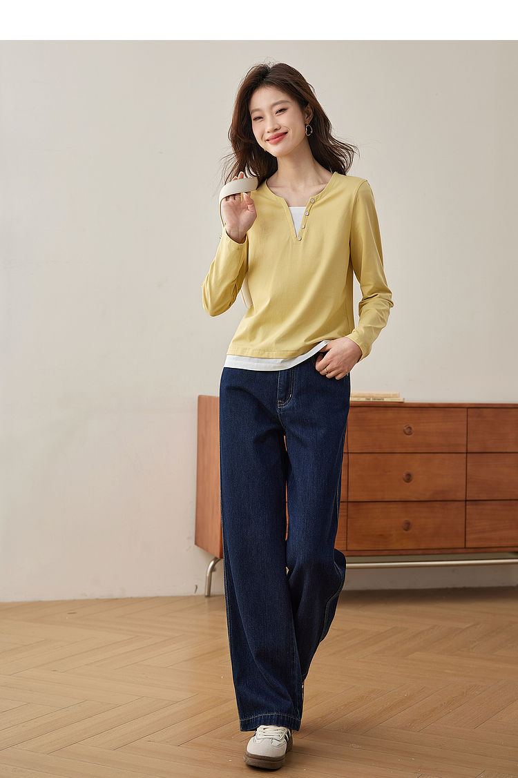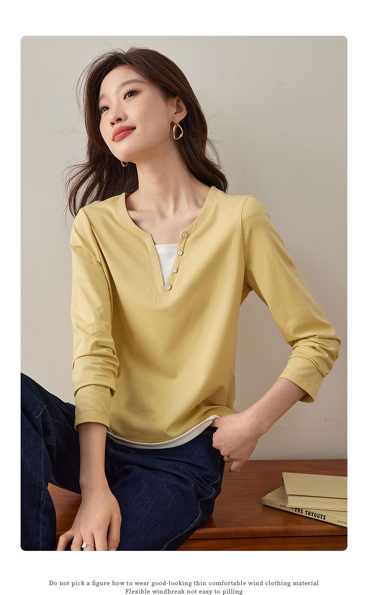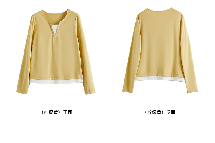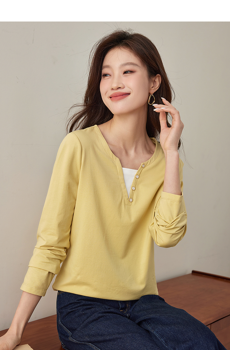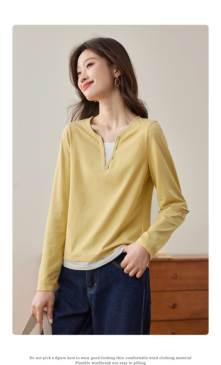 【129选3件,不退换】熙世界黑色长袖T恤春季2025年新款时尚V领设计感叠穿假两件上衣