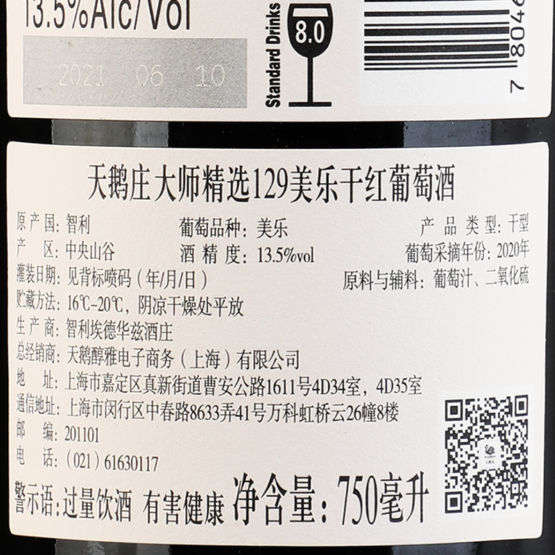 天鹅庄智利原瓶进口干红葡萄酒 750mL 大师精选129美乐干红